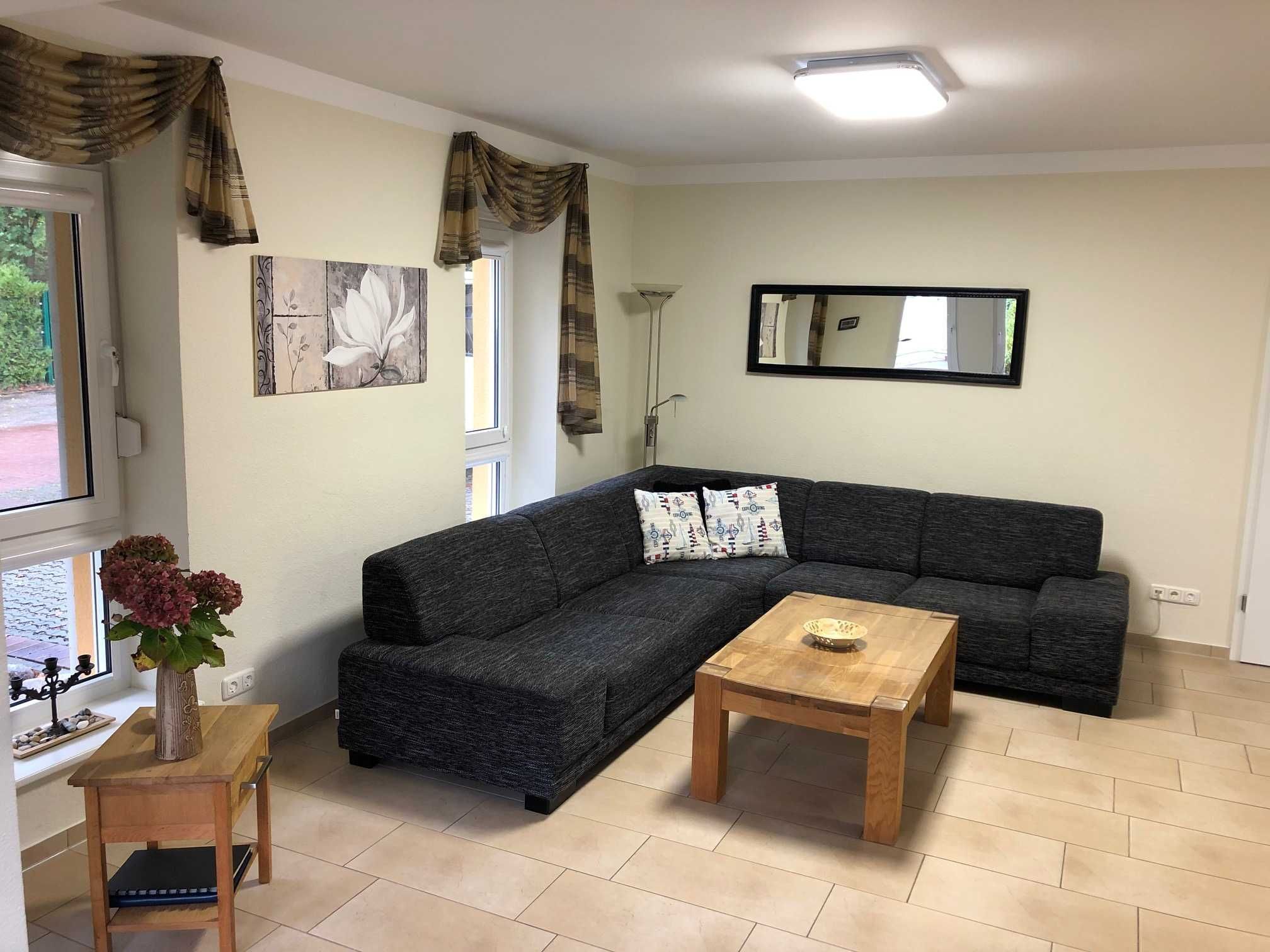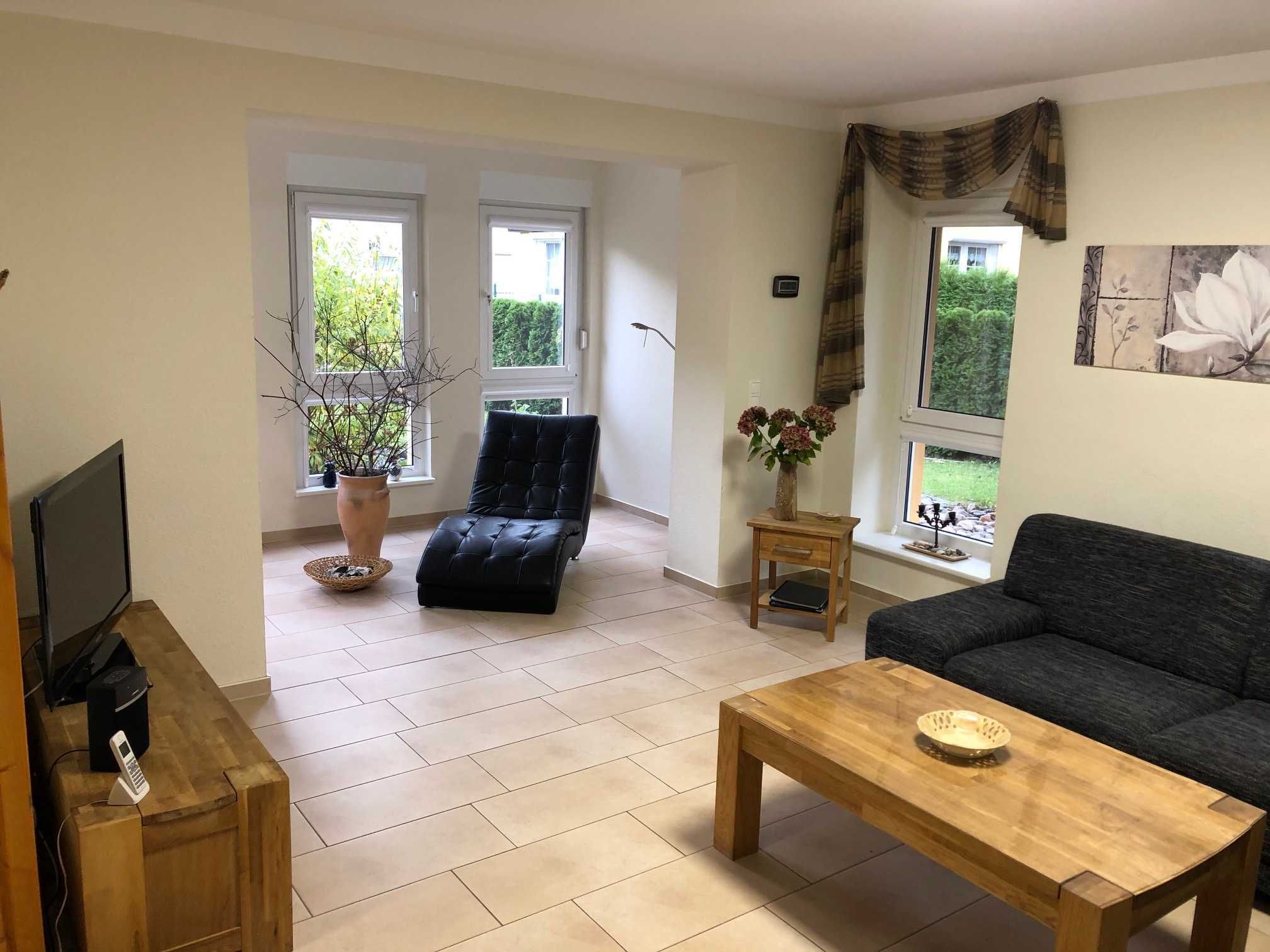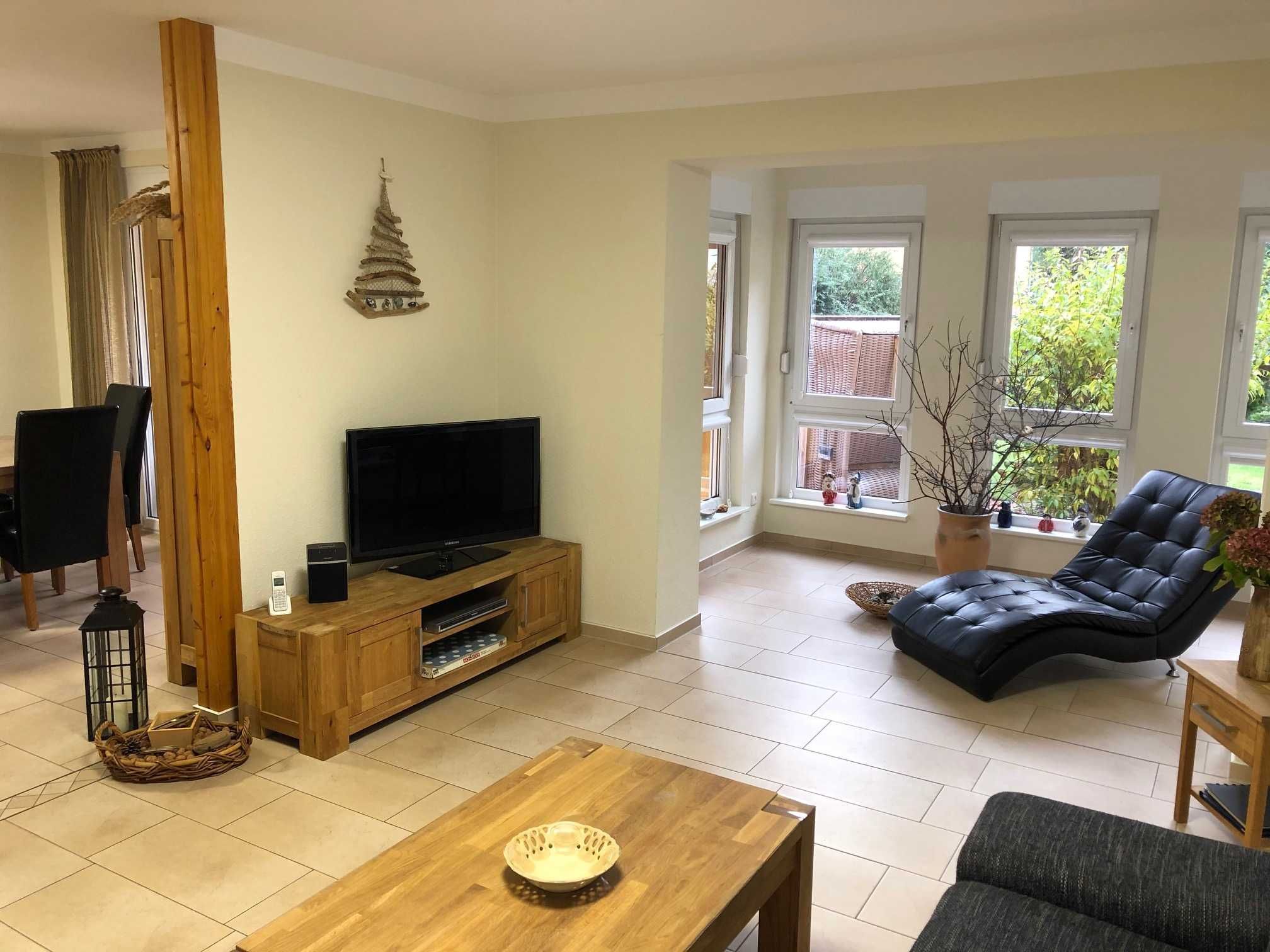 Exklusive Erdgeschoßwohnung mit großer Terrasse, 83m² eigener Garten und PKW Stellplatz. Die Ferienwohnung „Seemalve“ ist hochwertig eingerichtet mit Fußbodenheizung, Wohnraum mit offener Küche, Essbereich und Sofaecke, Leder-Relaxliege, Flach-TV, DVD-Player, Internet Radio mit CD-Player, Festnetztelefon, Terrassenmöbel, Einbauküche mit Ceranherd, Backofen, Kühlschrank, Tiefkühlfach, Gläser, Besteck, Geschirr, Bügeleisen und Bügelbrett.