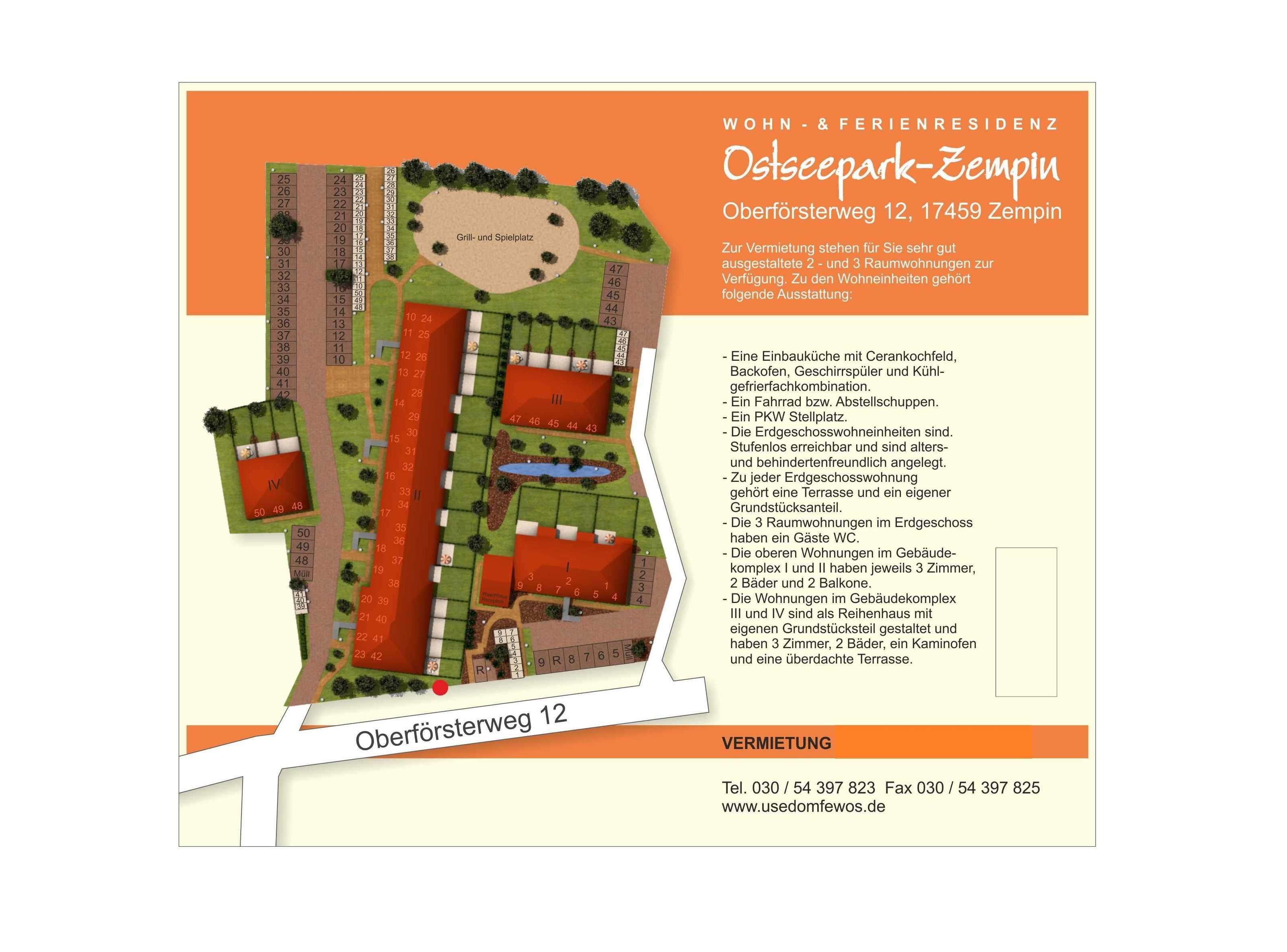 Die Ferienresidenz Ostseepark- Zempin liegt idyllisch hinter den Dünen in dem malerischen Ostseebad Zempin. Die Ferienwohnung wird ganzjährig für max.5 Personen vermietet. Die neu eingerichtete Ferienwohnung mit einer Größe von 82m² lädt mit ihrem gemütlichen Ambiente und dem beiden Balkonen zum Wohl fühlen ein. Hier kann man den Alltagsstress abschalten und sich in angenehmer Atmosphäre wohl fühlen. Für Familien mit Kindern ist gesorgt, ein schöner Spielplatz befindet sich innerhalb der Anlage. Auf dem Gelände befindet sich ein gemeinschaftlicher Grillplatz der genutzt werden kann sowie ein gemeinschaftlicher Wasch- und Trockenraum mit 2 Waschmaschinen und 1 Trockner (gegen Gebühr).
