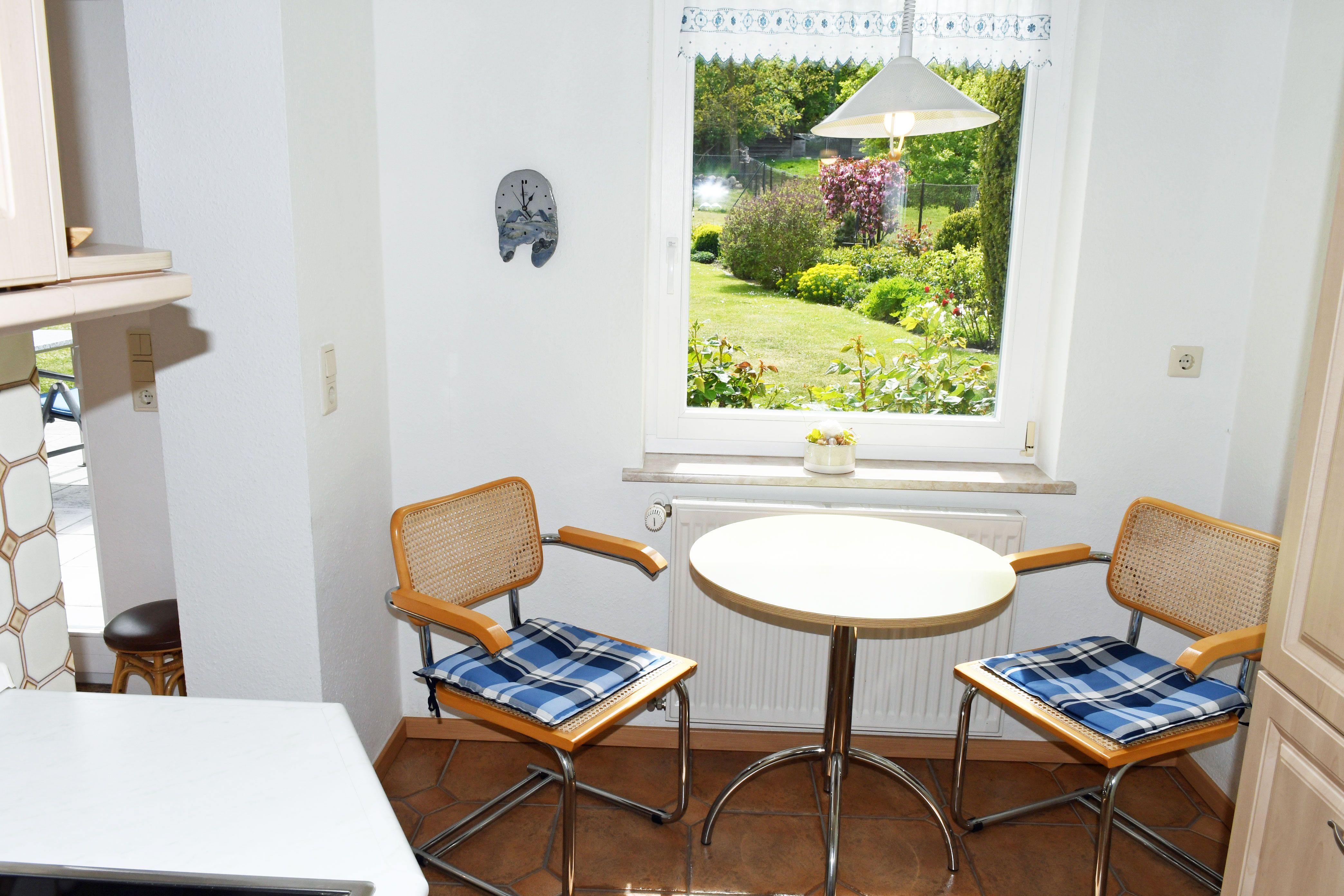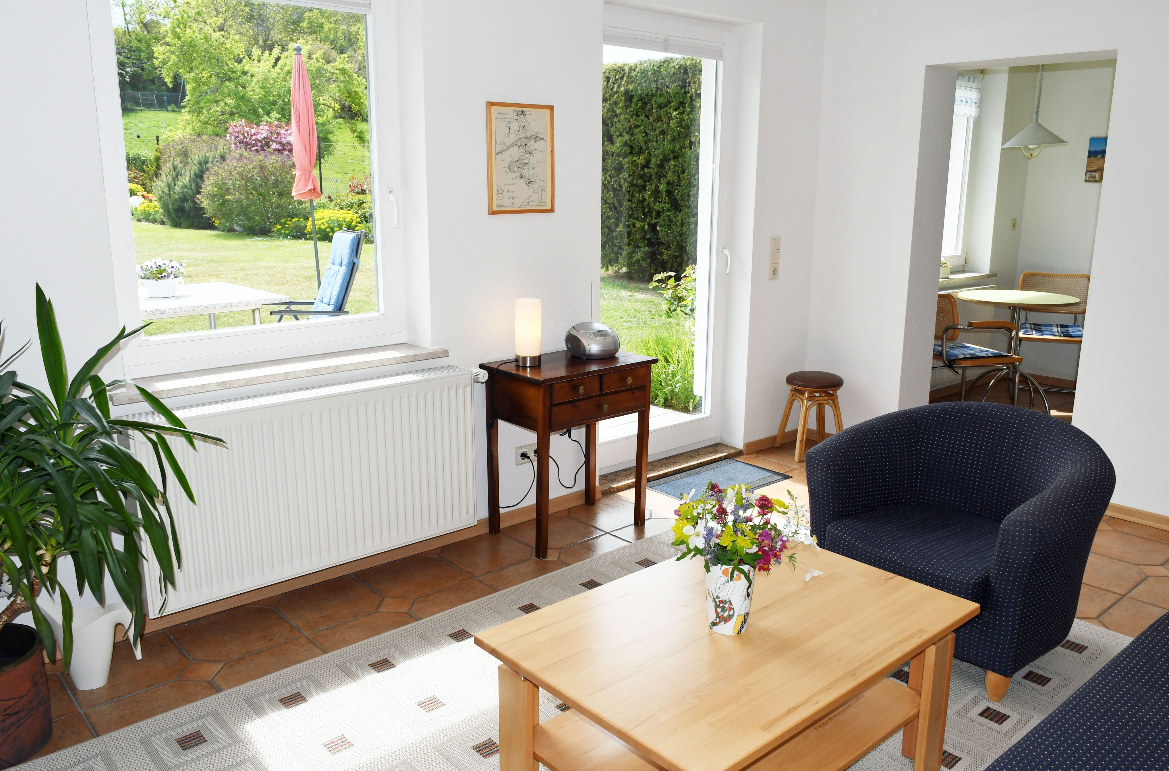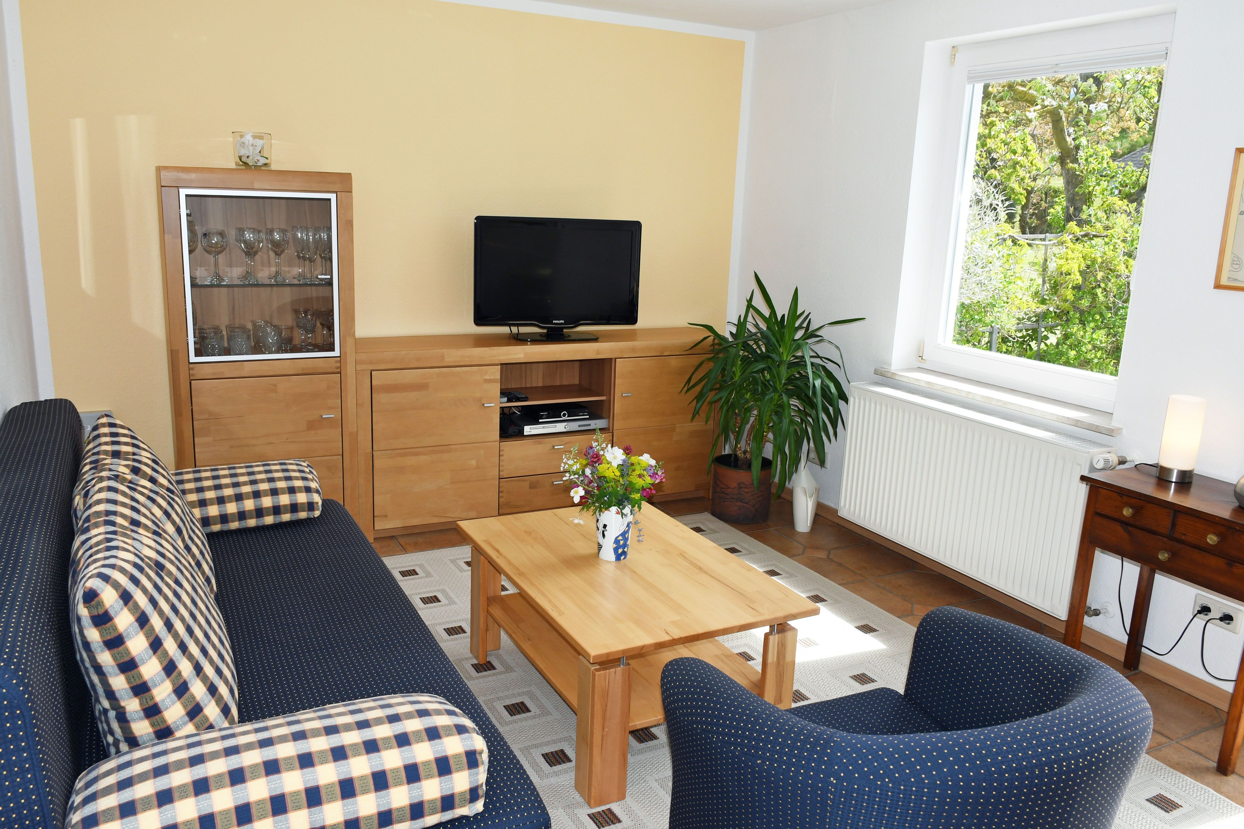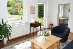Es wurde sehr liebevoll, modern und komfortabel eingerichtet. Ein Geschirrspüler, ein Herd mit Cerankochfeld und Backofen sowie eine Waschmaschine und ein Haartrockner gehören zur Ausstattung. Über einen kleinen Flur mit Garderobe gelangt man in den Wohnraum mit Couch und Sessel, Tisch, Schrankwand und TV-Gerät. Durch die großen Fenster haben Sie hier einen sehr schönen Ausblick in den Naturgarten und die Zickerschen Alpen.
