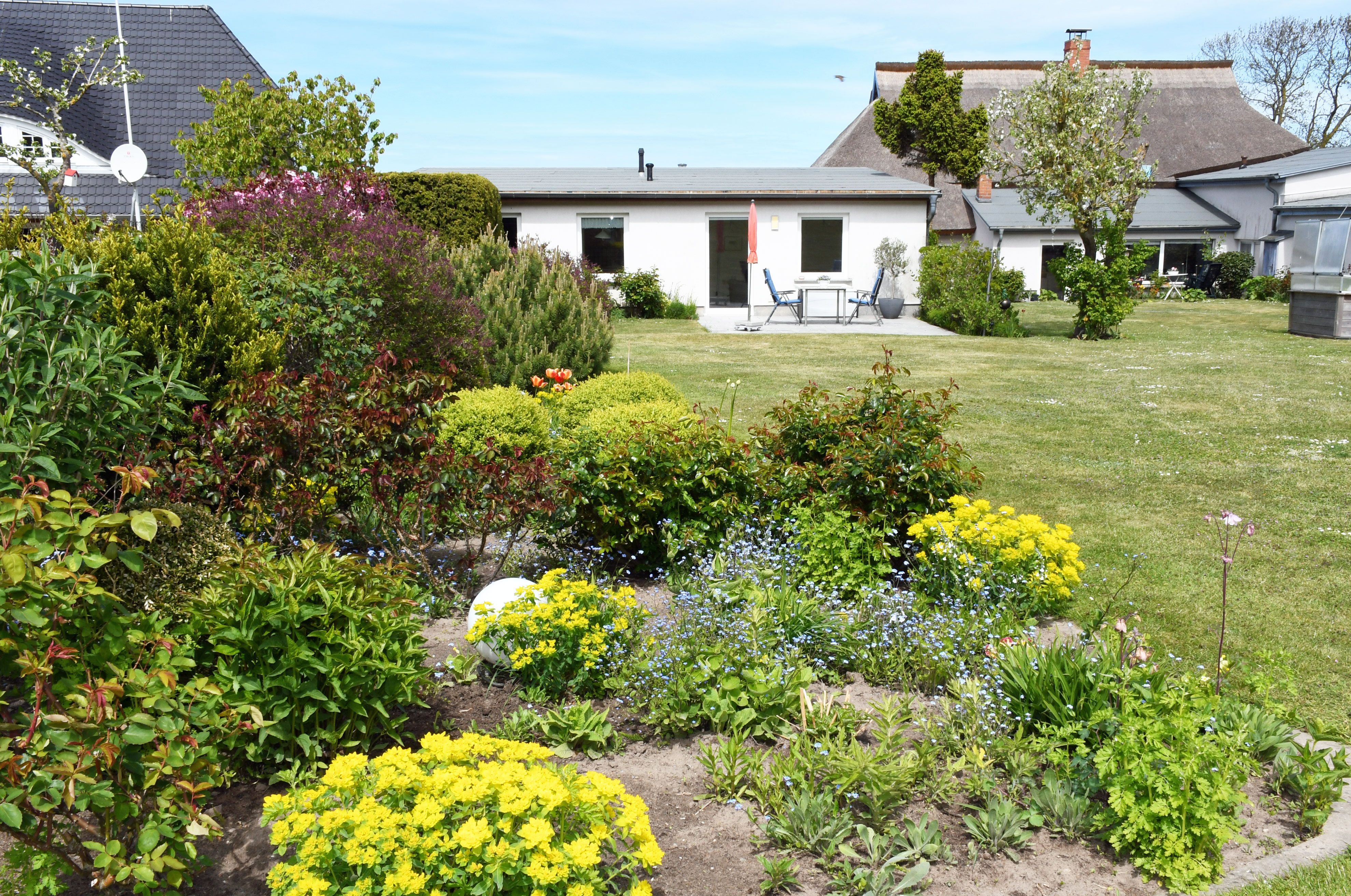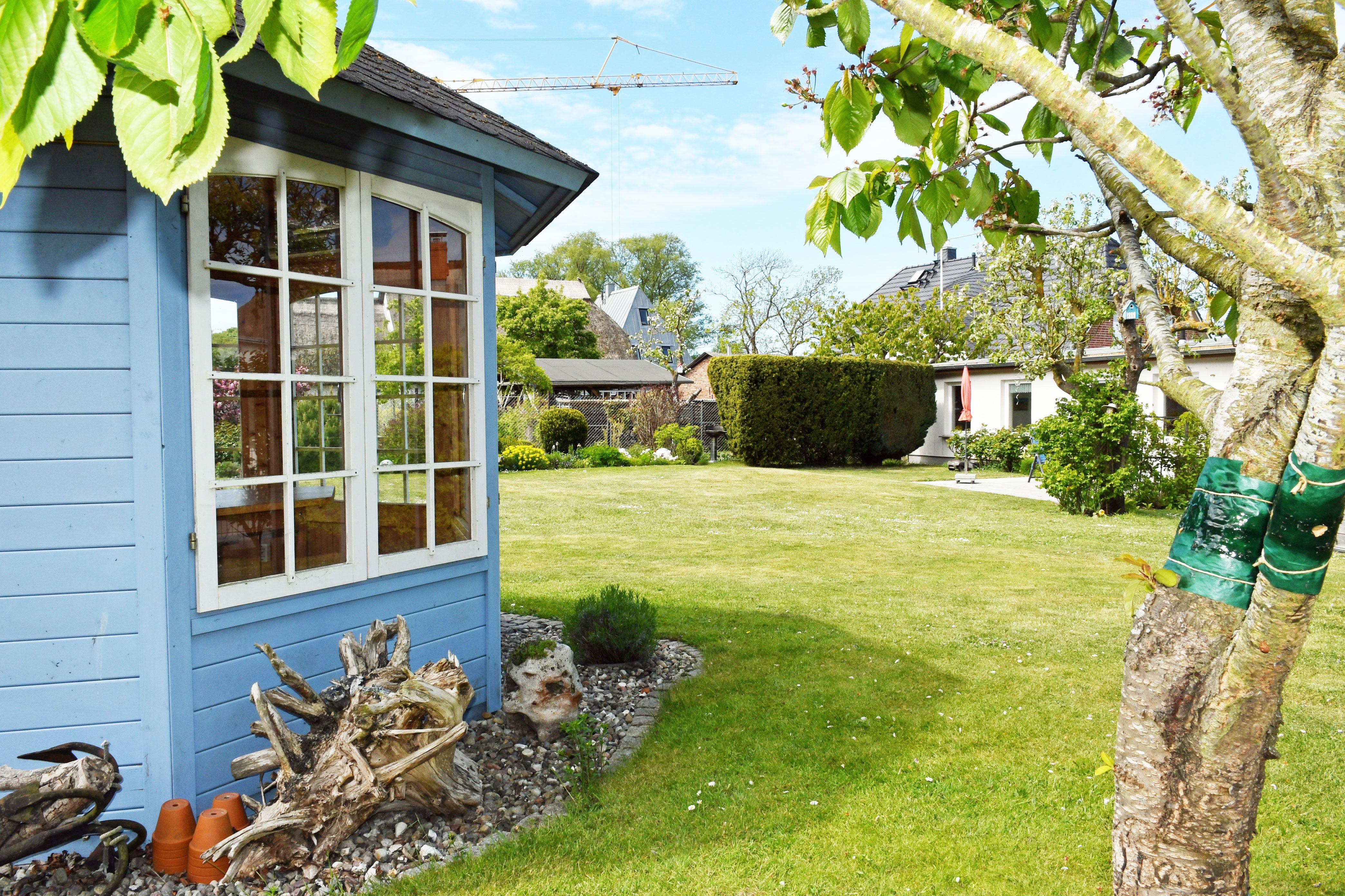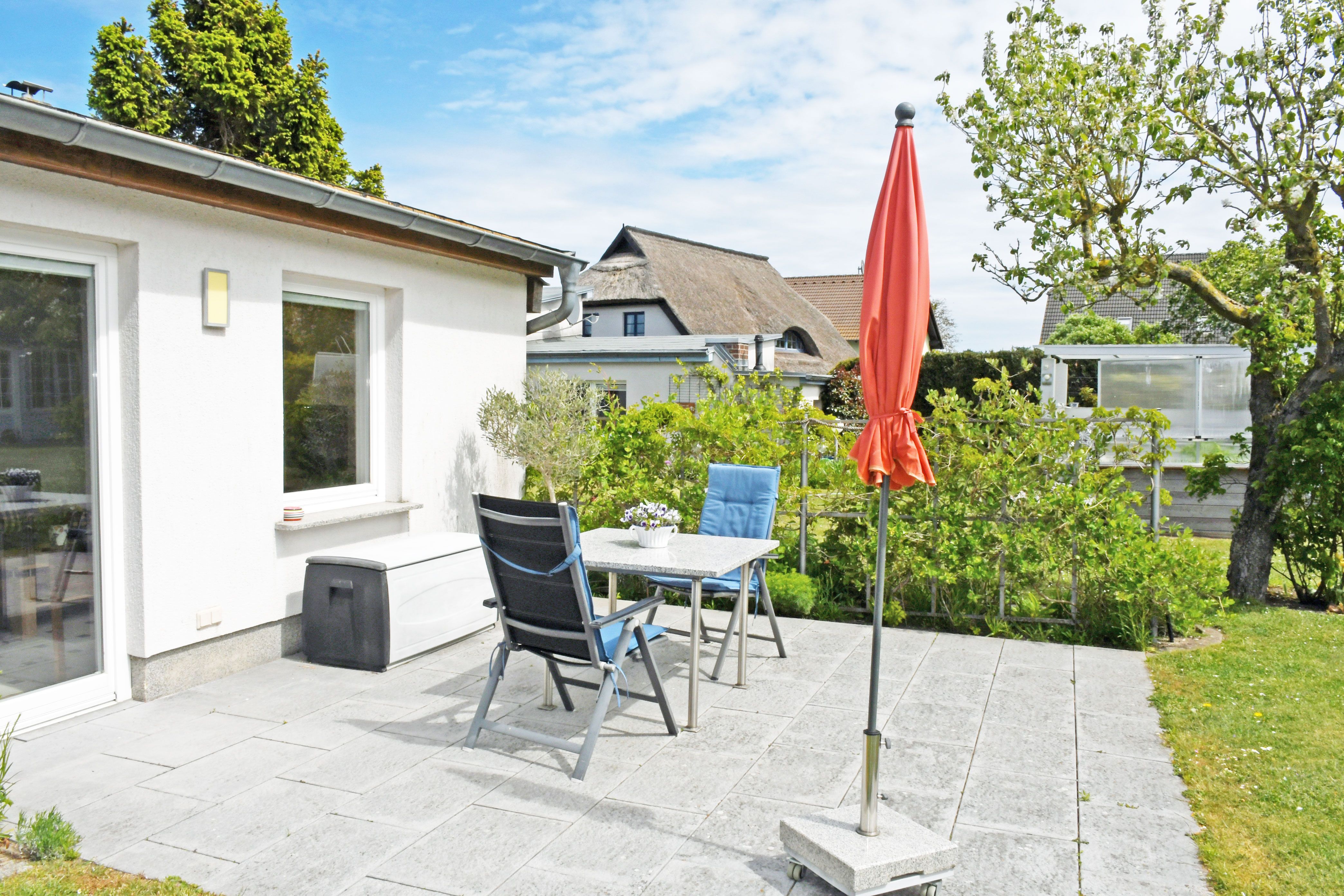 Hier genießen Sie einen einmaligen Blick auf die Hagensche Wiek und das Jagdschloss Granitz. Zum Ferienhaus am Brink gehört eine schöne Sonnenterrasse mit Sitzgelegenheiten und ein großer Naturgarten mit Liegewiese, in dem Sie die Seele baumeln lassen können.
