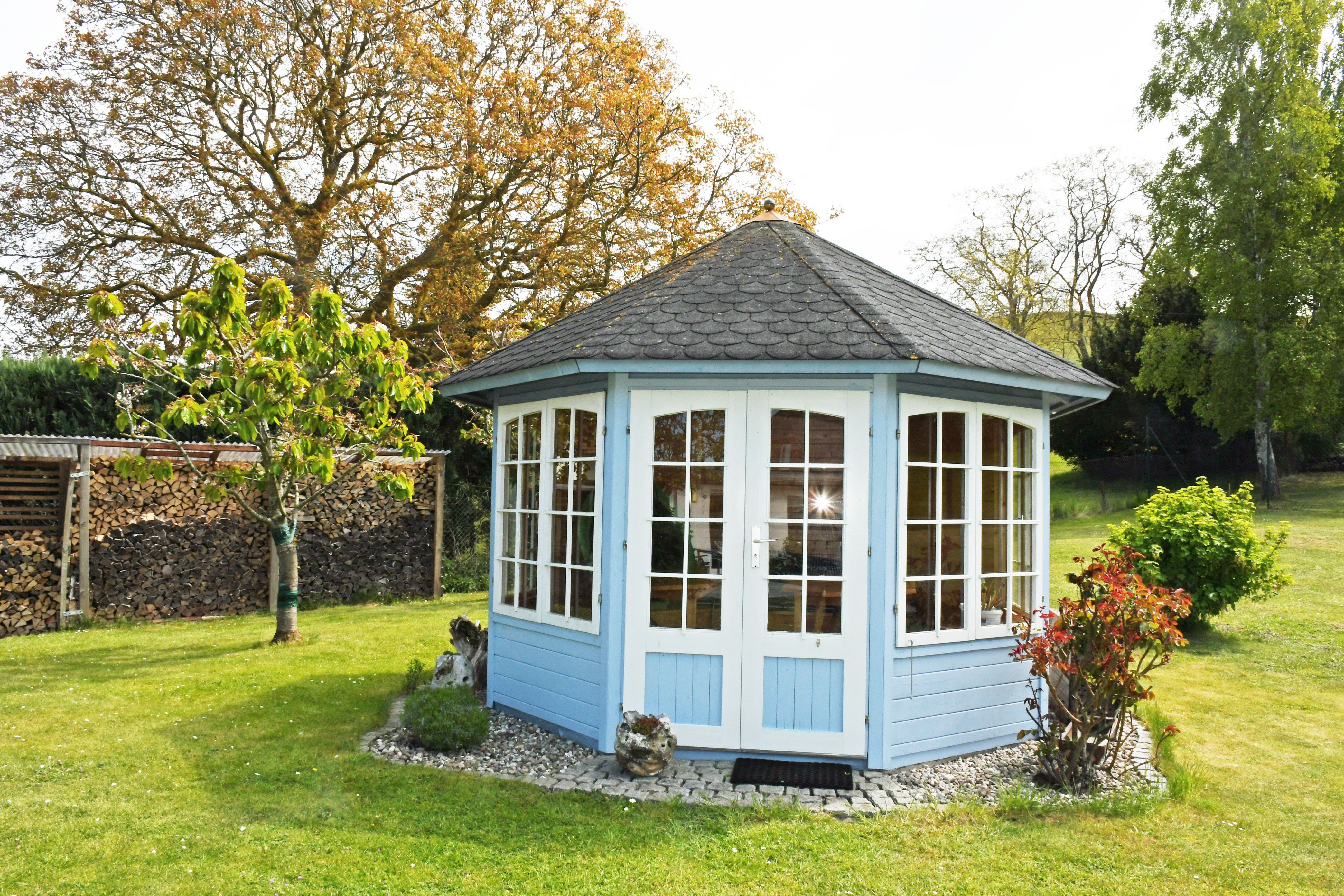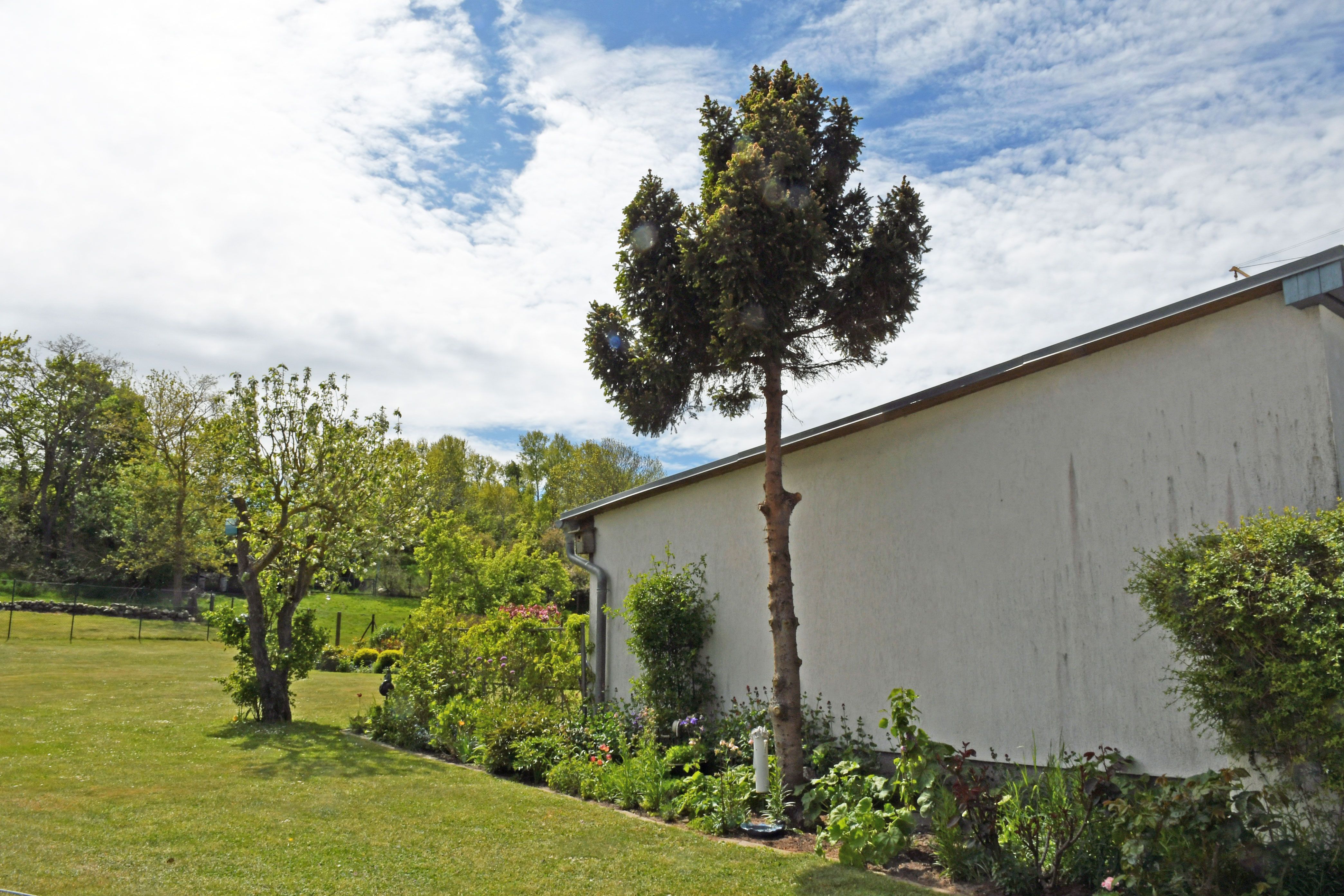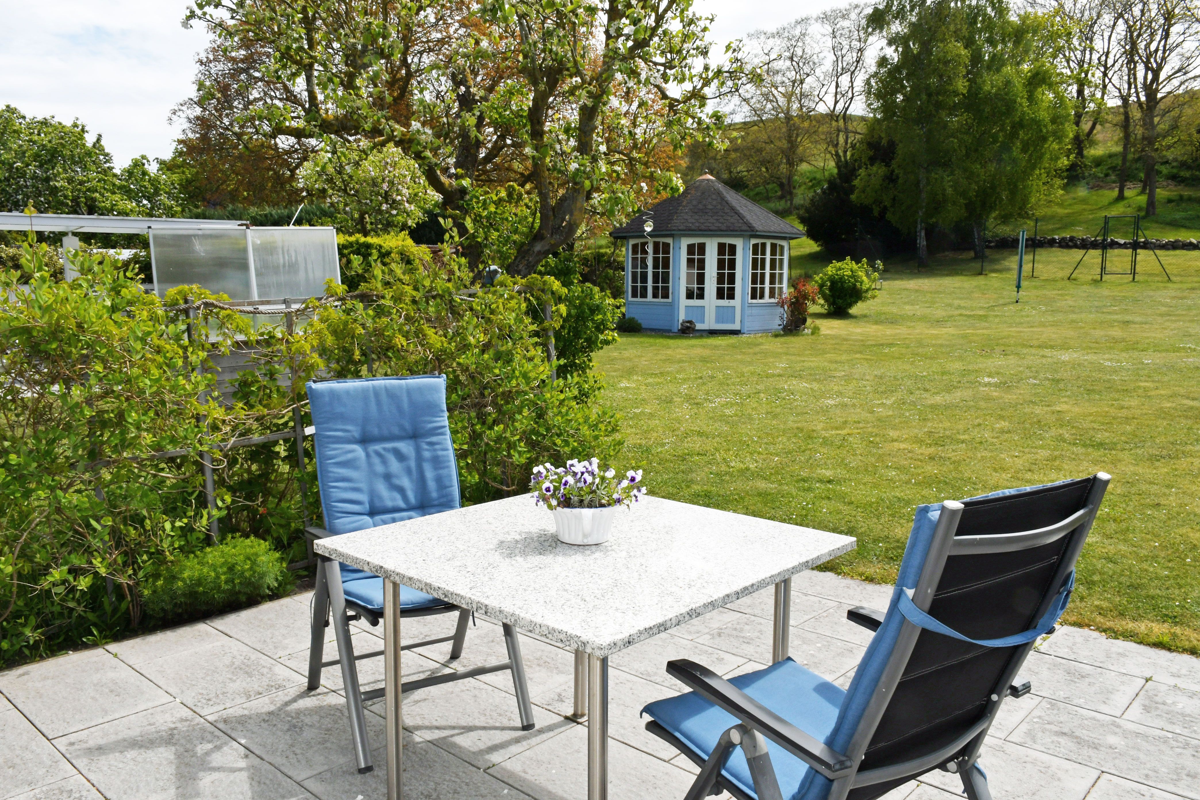 Zum Ferienhaus gehören eine schöne Sonnenterrasse mit Sitzgelegenheiten und ein großer Naturgarten mit Liegewiese, in dem Sie die Seele baumeln lassen können. Am nahe gelegenen Hafen erhalten Sie fangfrischen Fisch oder gehen an Bord eines Ausflugsschiffes. Abends sitzen Sie gemütlich auf der blauen Bank vor dem Haus und erleben spektakuläre Sonnenuntergänge. Parklätze sind auf dem Grundstück ausreichend vorhanden.