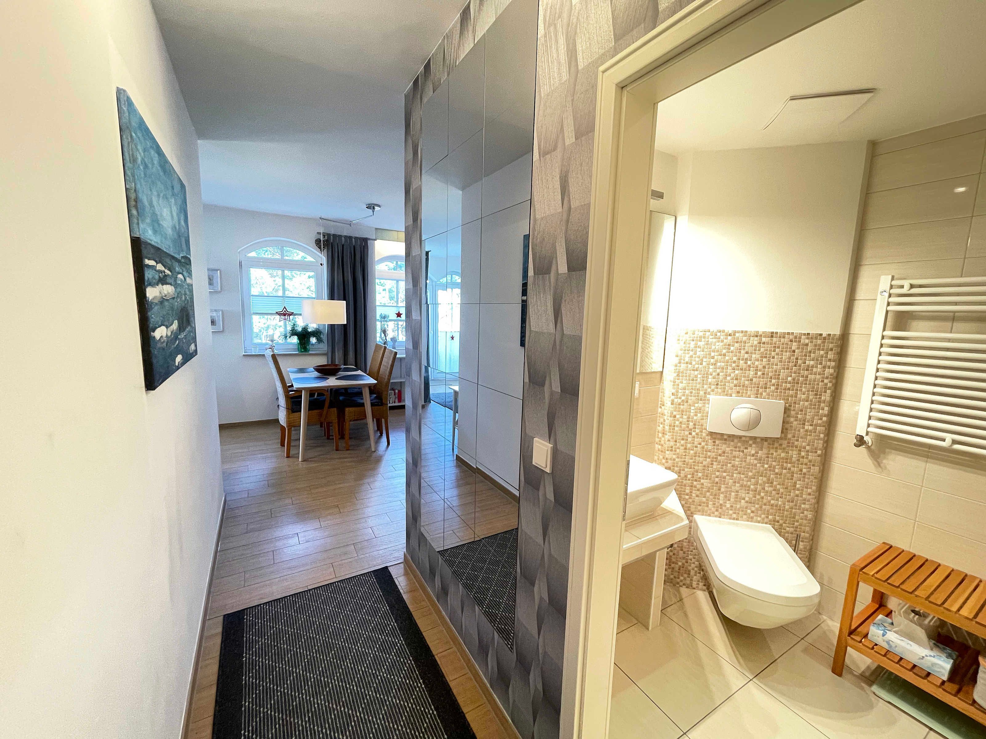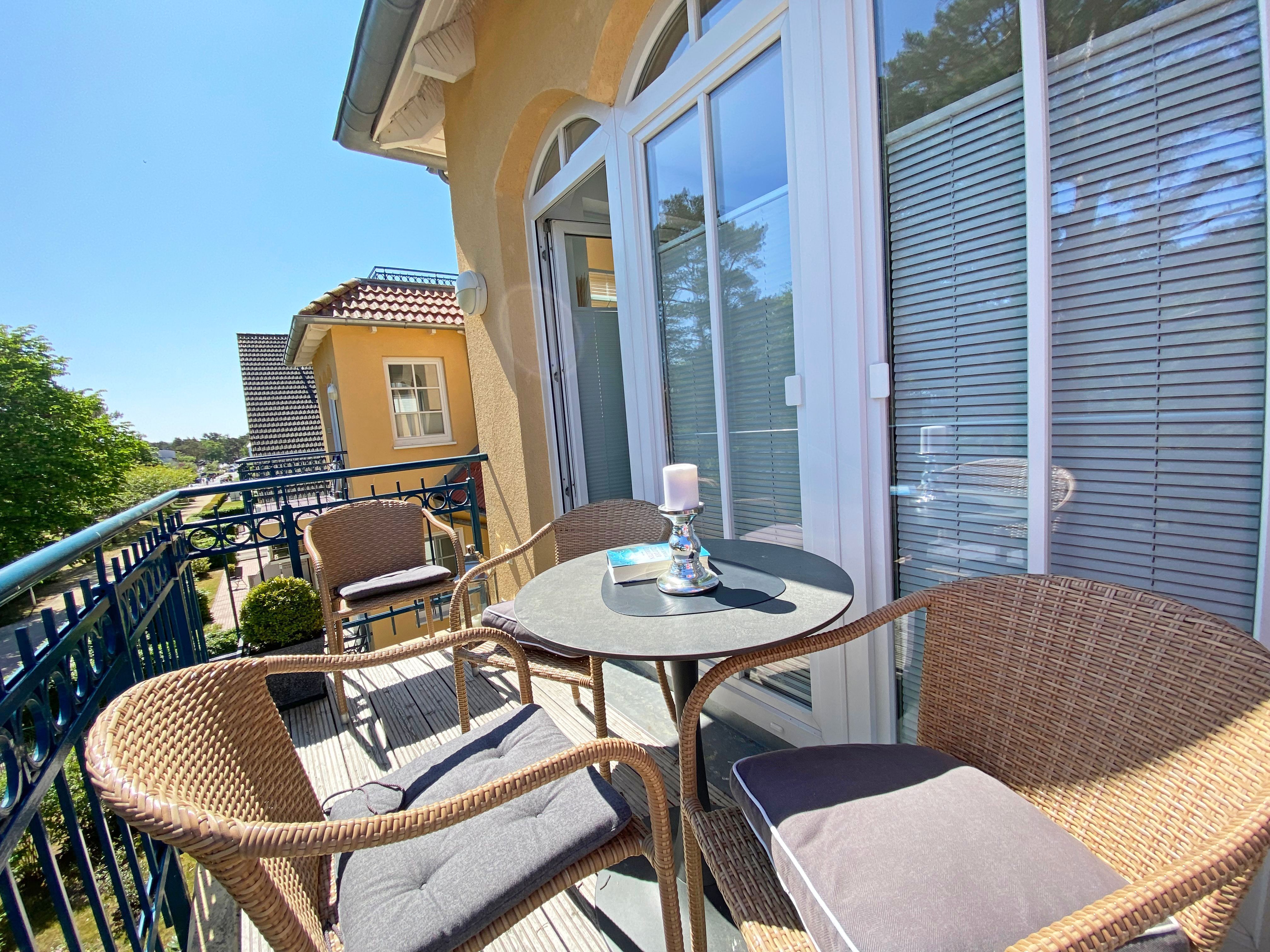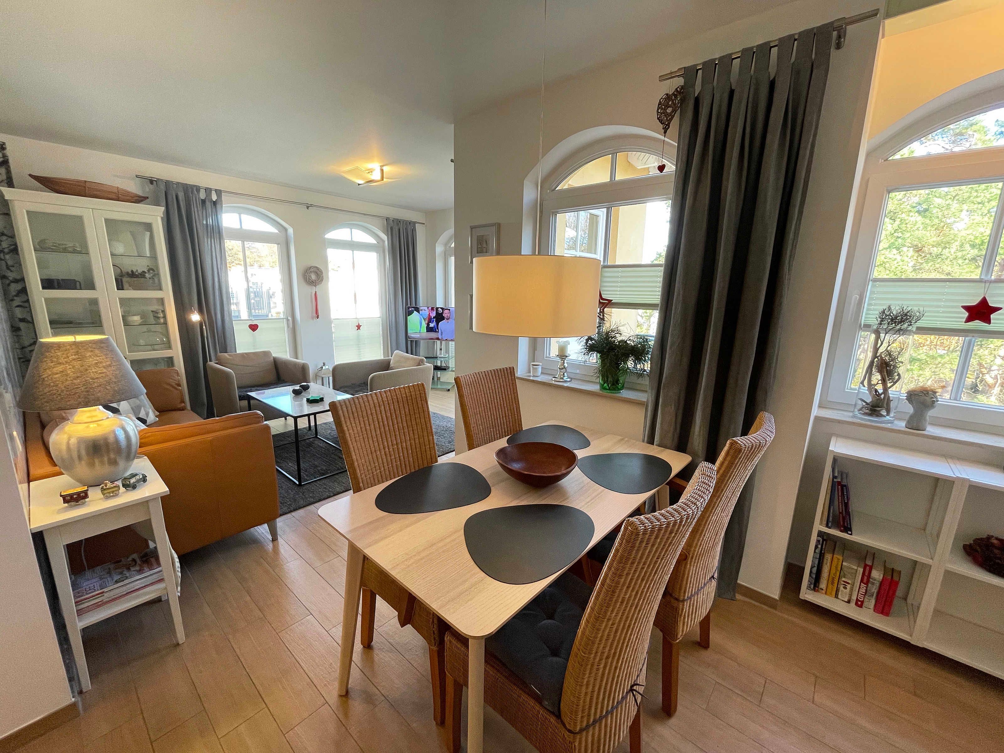 Die ca. 63 m² große Nichtraucherwohnung bietet für 2 bis 4 Personen ein behagliches und gemütliches Ambiente. Die Wohnung befindet sich in der 2. Etage und ist mit einem Aufzug bequem zu erreichen. Großzügige Fensterfronten lassen die geräumige Wohnung noch heller erscheinen. Von dem Wohnzimmer aus gelangen Sie auf den Balkon, von wo aus Sie teilweise Blick durch die Kiefern auf die Ostsee haben. Bei Wellengang können Sie das Meer nicht nur sehen, sondern auch hören. Das Wohnzimmer verfügt über eine gemütliche Sitzecke mit Smart-TV, DVD-Player sowie Telefon und Internet per WLAN. Angrenzend an das Wohnzimmer finden Sie den Küchenbereich mit einer modernen Küchenzeile, welche mit einem Kühlschrank mit Gefrierfach, Ceranfeld, Backofen, Mikrowelle, Geschirrspüler, Kaffeemaschine, Toaster, Wasserkocher diversen Küchenutensilien sowie einer Sitzmöglichkeit für 4 Personen ausgestattet ist. Die beiden separaten Schlafzimmer (davon eins mit Schreibtisch) bieten jeweils ein Doppelbett (1,40 m x 2,00 m und 2 x 0,90 m x 2,00 m) sowie einen Kleiderschrank und verfügen über Insektenschutzgitter. Das Vollbad verfügt über eine Dusche, Waschbecken, WC, Kosmetikspiegel, Fön und Handtuchtrockner. Ein separates Gäste-WC rundet den Sanitärbereich ab. Das Rauchen ist nicht erlaubt, ebenso keine Haustiere. Zu der Wohnung gehört in der Tiefgarage (Höhe 1,95 m) der Stellplatz Nr. 15. Im Keller können Sie gegen eine Extragebühr Waschmaschine und Trockner nutzen. Die Erstausstattung eines Wäschepaketes (komplette Bettwäsche, 1 Duschhandtuch, 1 kleines Handtuch) können Sie gegen einen Aufpreis dazu buchen oder durch eigene ergänzen. Ab 2 gebuchten Paketen erhalten Sie einmalig 1 Geschirrhandtuch und 1 Duschvorleger dazu.