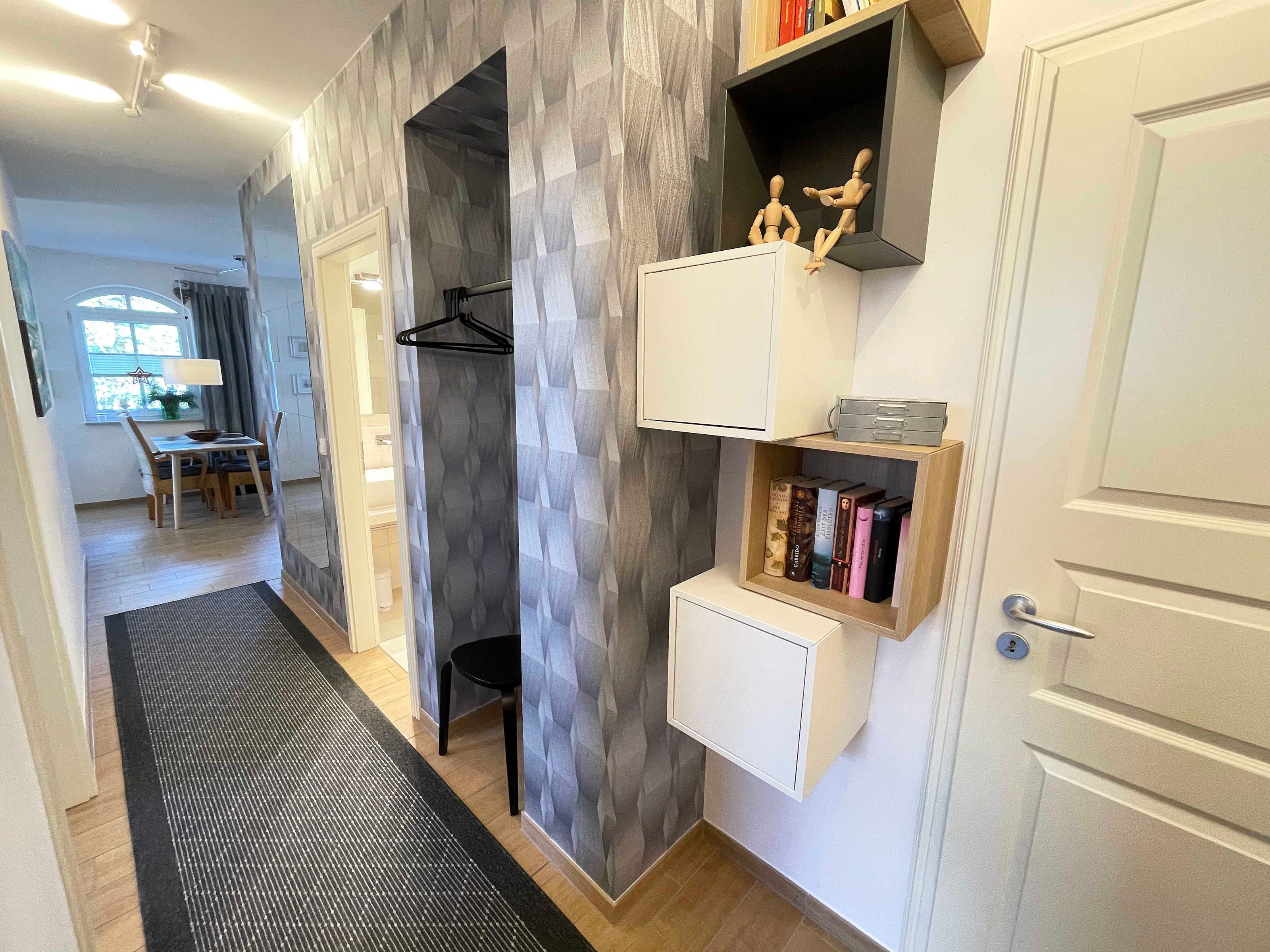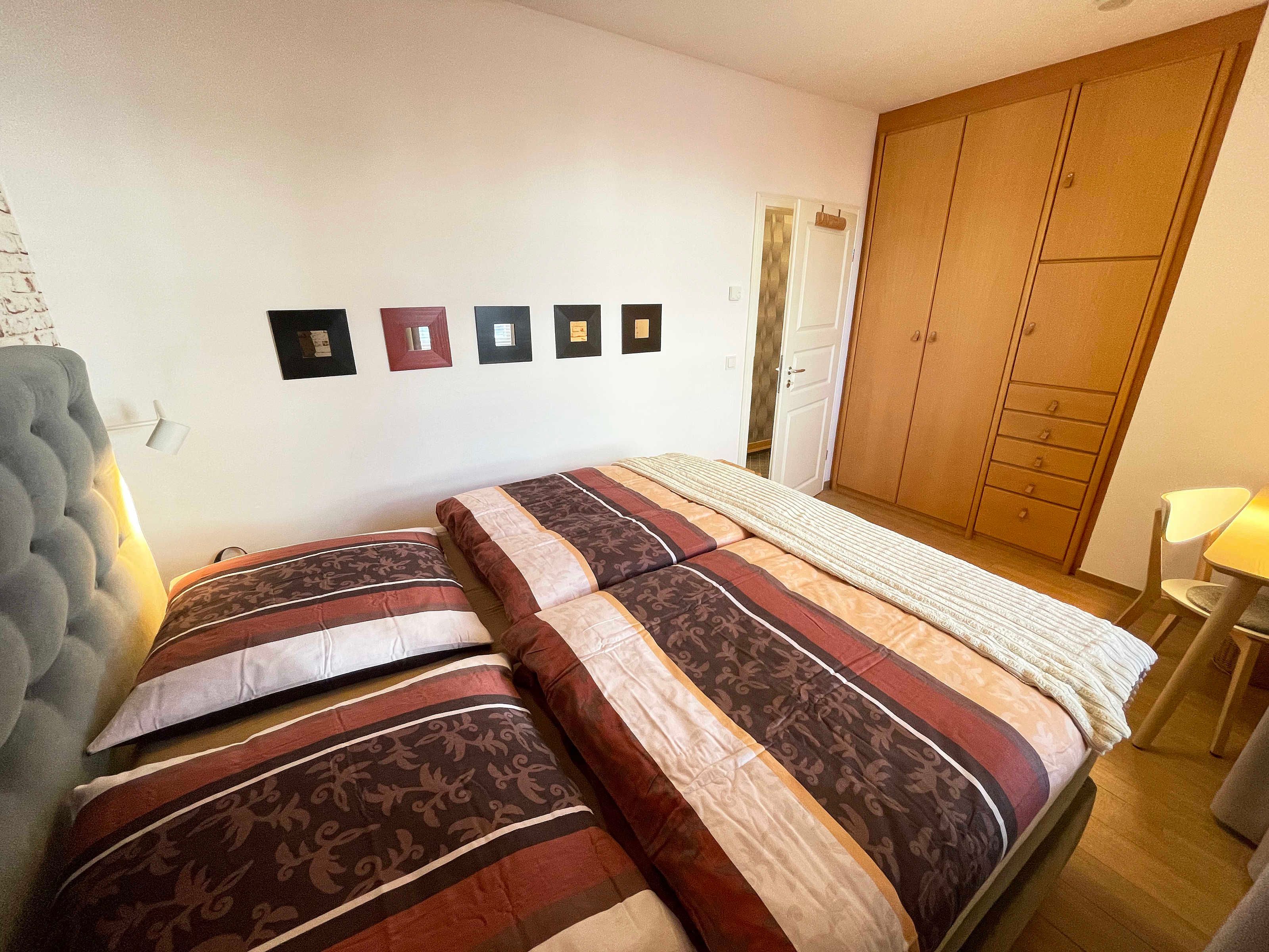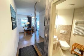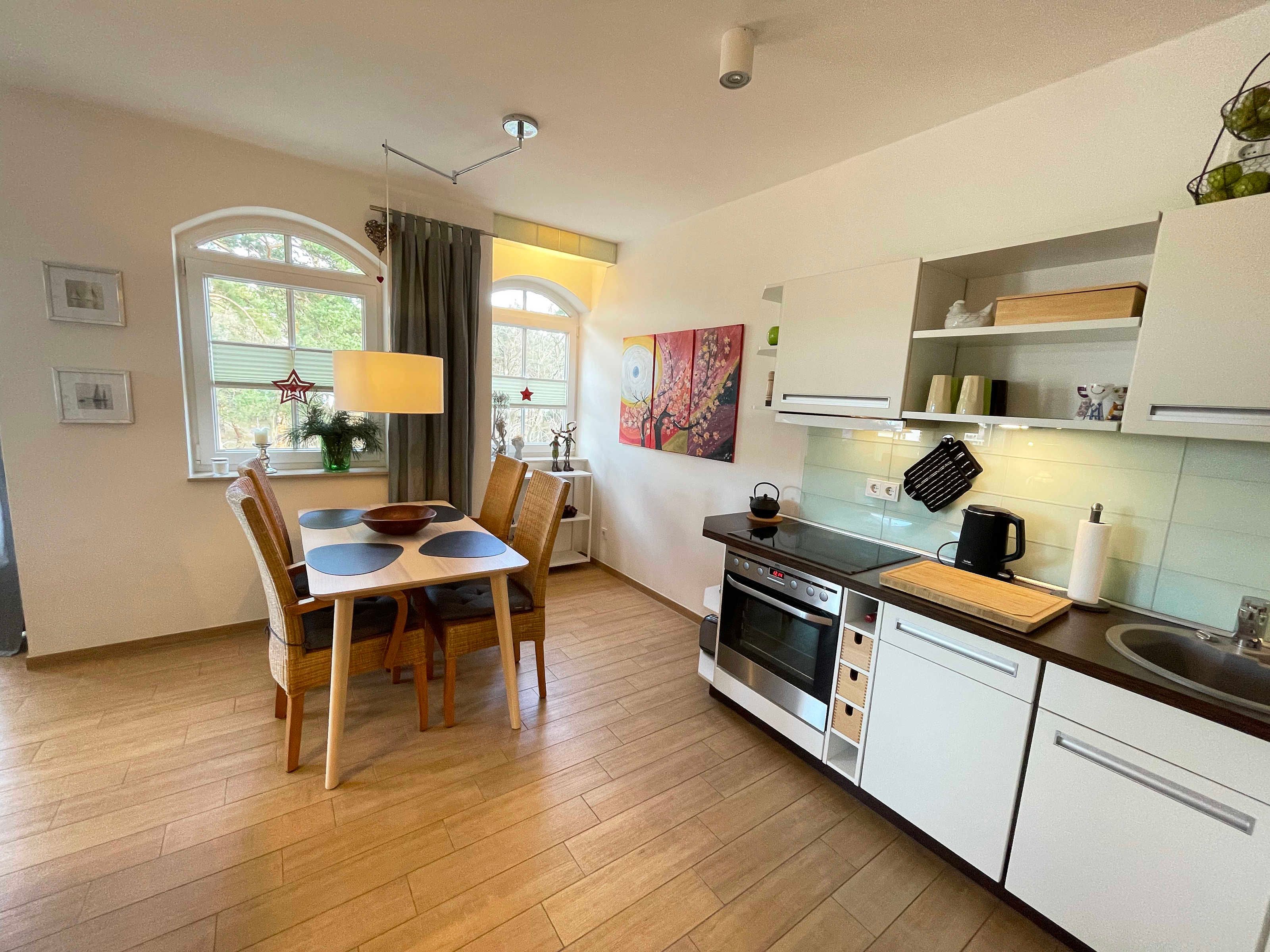 Die ca. 63 m² große Nichtraucherwohnung bietet für 2 bis 4 Personen ein behagliches und gemütliches Ambiente. Die Wohnung befindet sich in der 2. Etage und ist mit einem Aufzug bequem zu erreichen. Großzügige Fensterfronten lassen die geräumige Wohnung noch heller erscheinen. Von dem Wohnzimmer aus gelangen Sie auf den Balkon, von wo aus Sie teilweise Blick durch die Kiefern auf die Ostsee haben. Bei Wellengang können Sie das Meer nicht nur sehen, sondern auch hören. Das Wohnzimmer verfügt über eine gemütliche Sitzecke mit Smart-TV, DVD-Player sowie Telefon und Internet per WLAN. Angrenzend an das Wohnzimmer finden Sie den Küchenbereich mit einer modernen Küchenzeile, welche mit einem Kühlschrank mit Gefrierfach, Ceranfeld, Backofen, Mikrowelle, Geschirrspüler, Kaffeemaschine, Toaster, Wasserkocher diversen Küchenutensilien sowie einer Sitzmöglichkeit für 4 Personen ausgestattet ist. Die beiden separaten Schlafzimmer (davon eins mit Schreibtisch) bieten jeweils ein Doppelbett (1,40 m x 2,00 m und 2 x 0,90 m x 2,00 m) sowie einen Kleiderschrank und verfügen über Insektenschutzgitter. Das Vollbad verfügt über eine Dusche, Waschbecken, WC, Kosmetikspiegel, Fön und Handtuchtrockner. Ein separates Gäste-WC rundet den Sanitärbereich ab. Das Rauchen ist nicht erlaubt, ebenso keine Haustiere. Zu der Wohnung gehört in der Tiefgarage (Höhe 1,95 m) der Stellplatz Nr. 15. Im Keller können Sie gegen eine Extragebühr Waschmaschine und Trockner nutzen. Die Erstausstattung eines Wäschepaketes (komplette Bettwäsche, 1 Duschhandtuch, 1 kleines Handtuch) können Sie gegen einen Aufpreis dazu buchen oder durch eigene ergänzen. Ab 2 gebuchten Paketen erhalten Sie einmalig 1 Geschirrhandtuch und 1 Duschvorleger dazu.