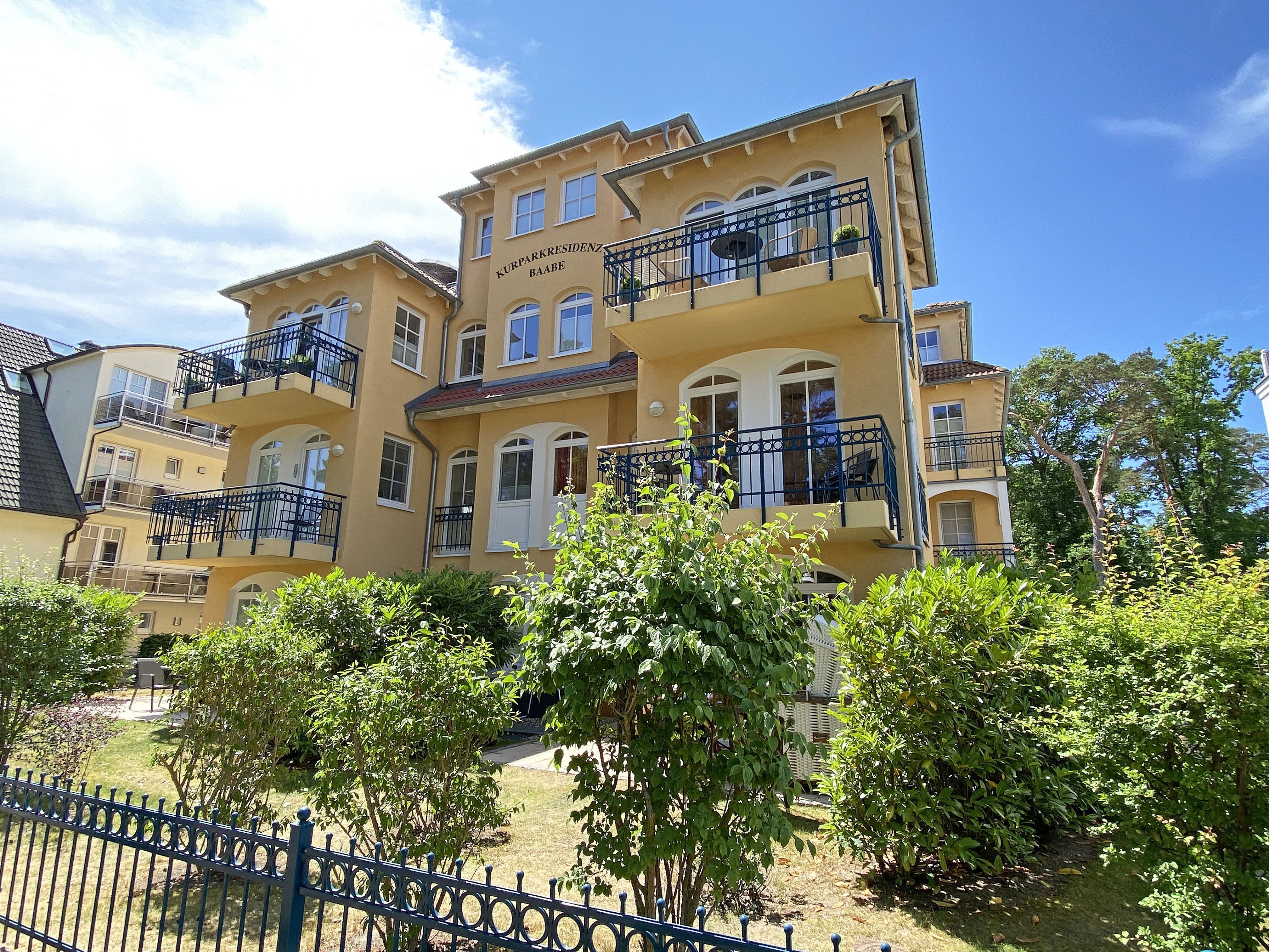 Direkt am neu angelegten Kurpark in der 1. Reihe des schönen Ostseebades Baabe befindet sich das Appartementhaus Kurparkresidenz mit seinen 17 Wohnungen, von denen 14 als Ferienwohnungen vermietet werden. Eingebettet von Dünen und alten Kiefern besticht das Objekt durch seine leicht mediterrane Architektur. Zu dem feinen Sandstrand sind es nur ca. 100 m und ganze 2 Gehminuten benötigt man bis zum Ortszentrum. Ein Urlaubstraum wird wahr!!!