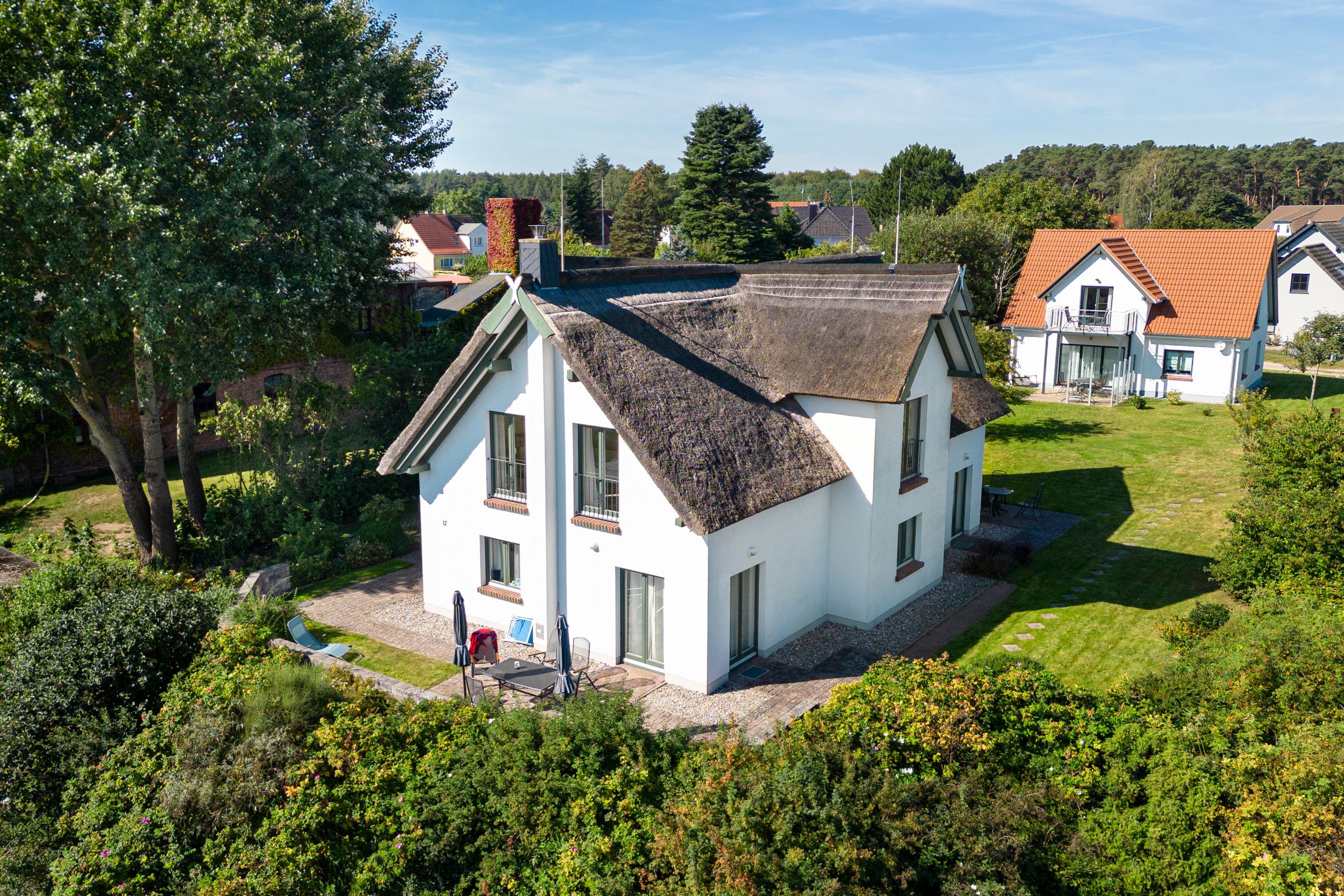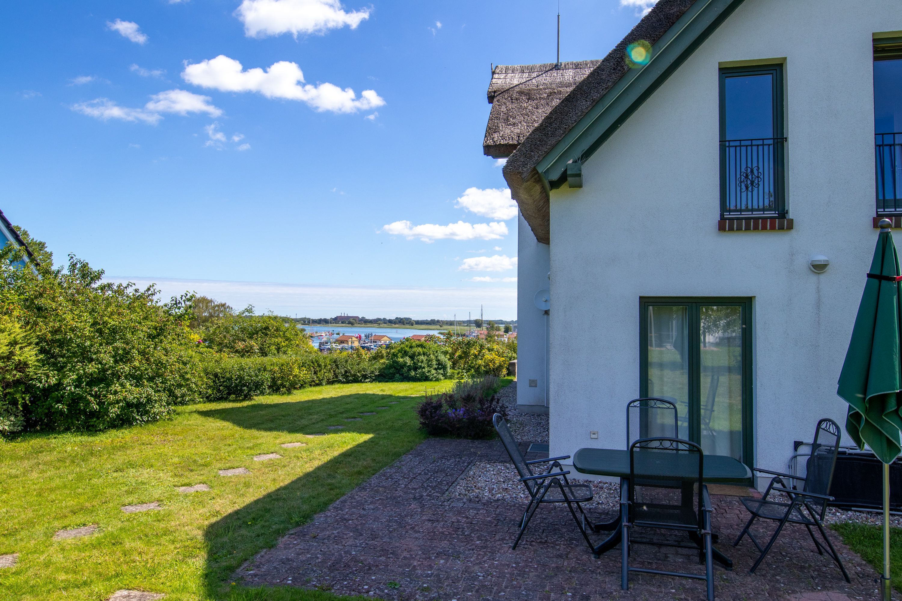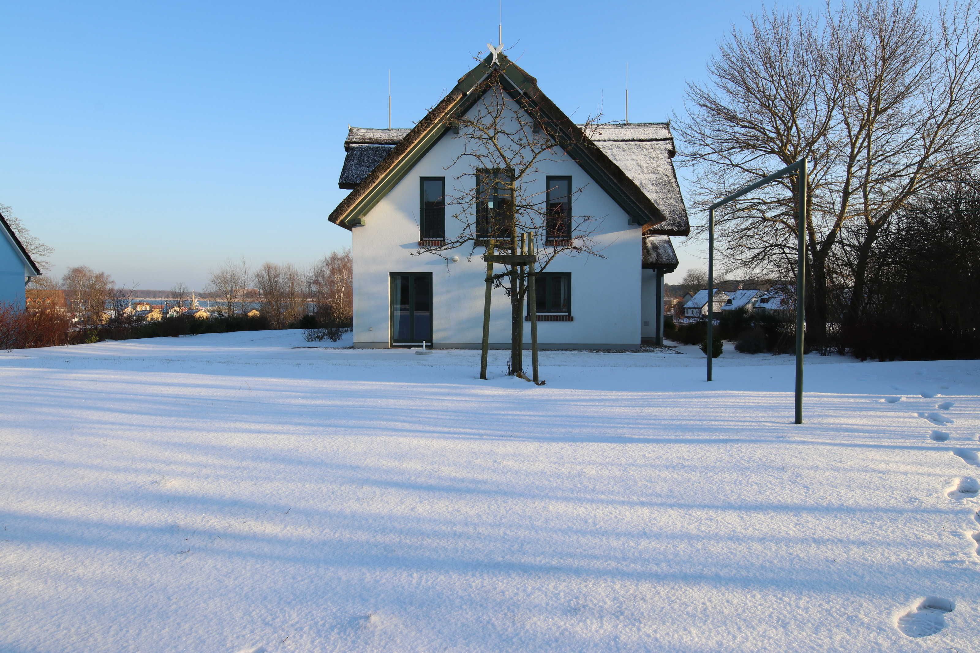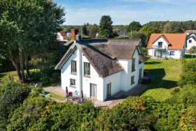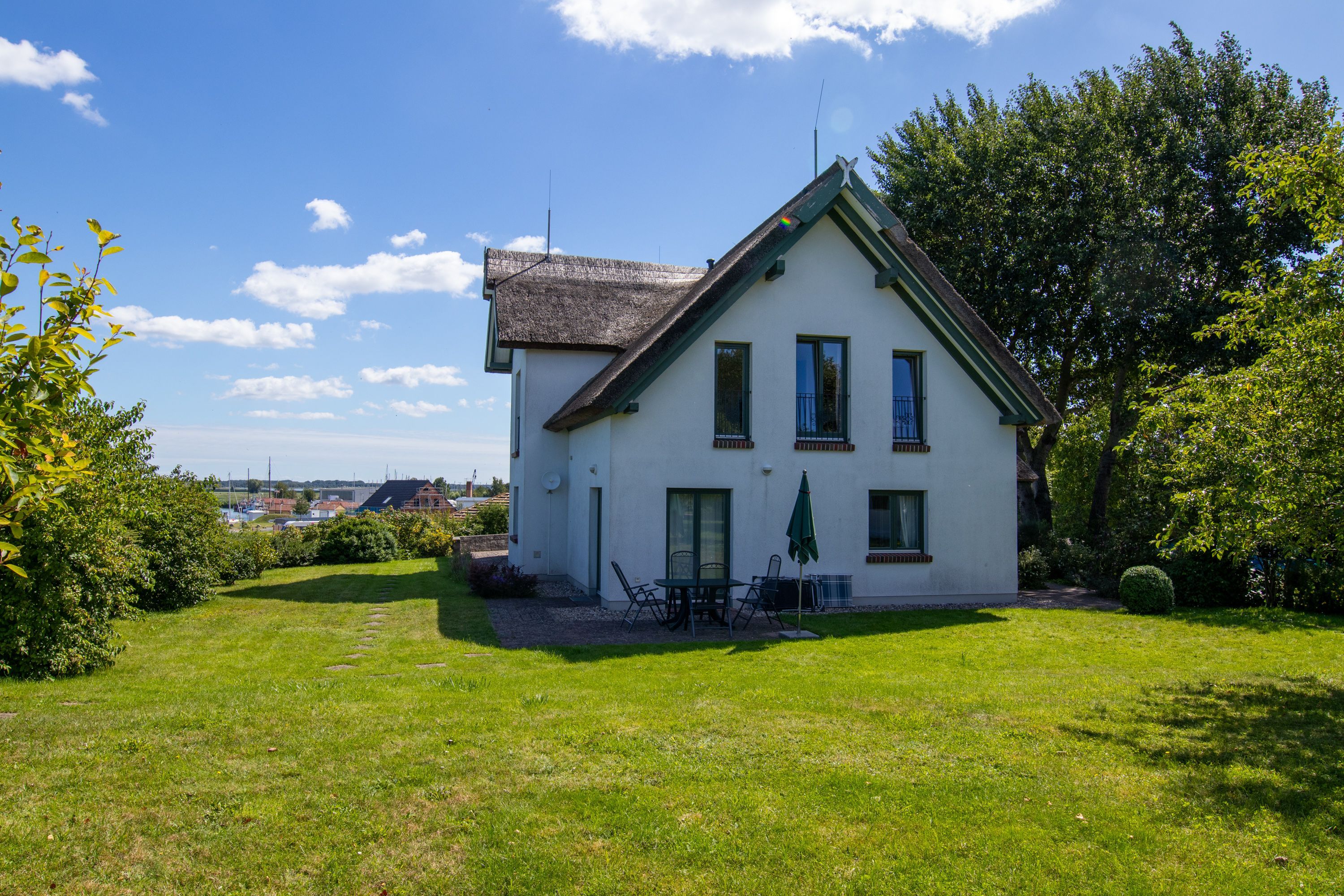 Das reetgedeckte, bildschöne Ferienhaus mit Seeblick und großem Garten liegt auf einer Anhöhe im idyllischen Fischerdorf Freest nah am kleinen Fischerhafen in Freest.