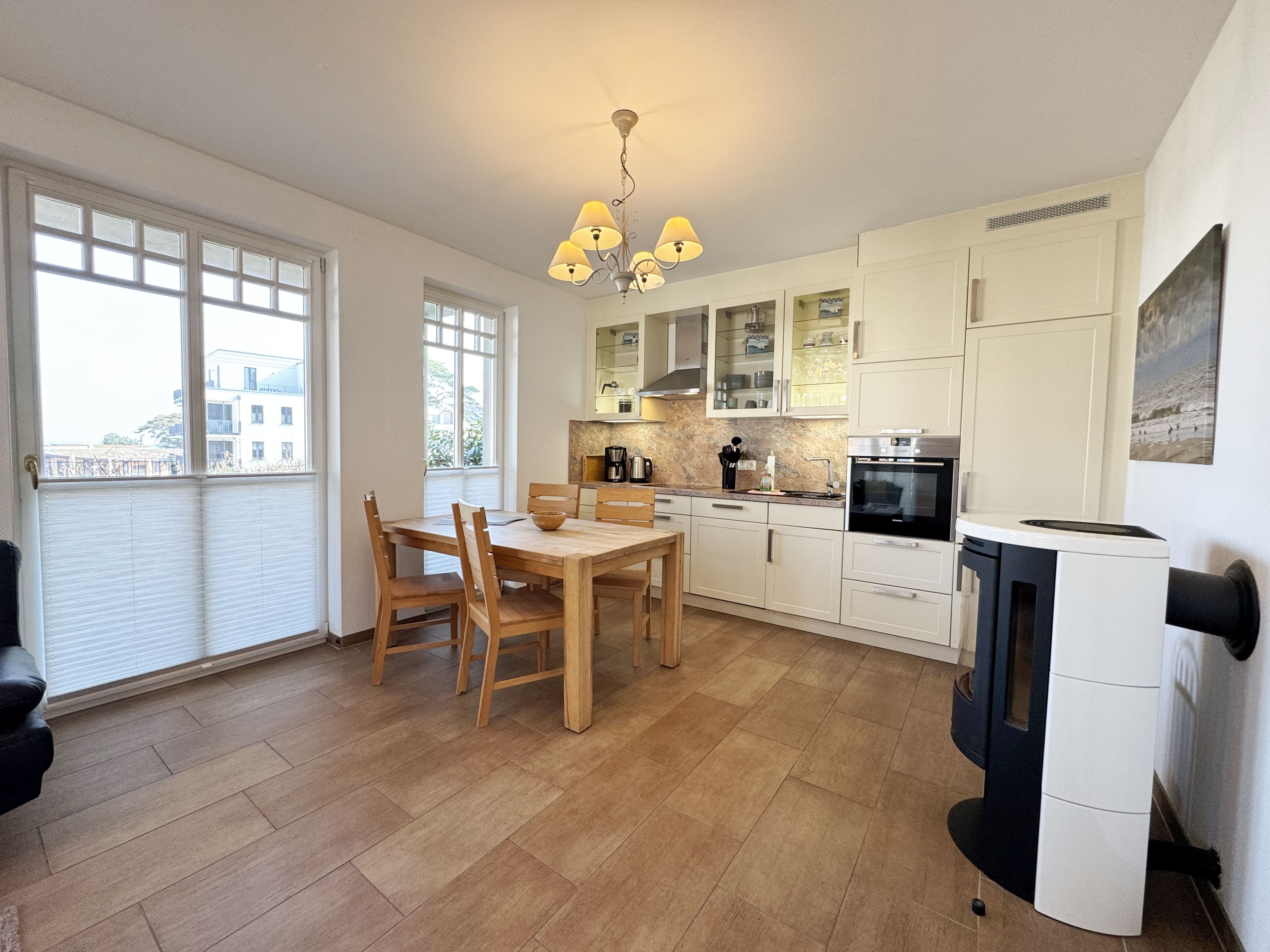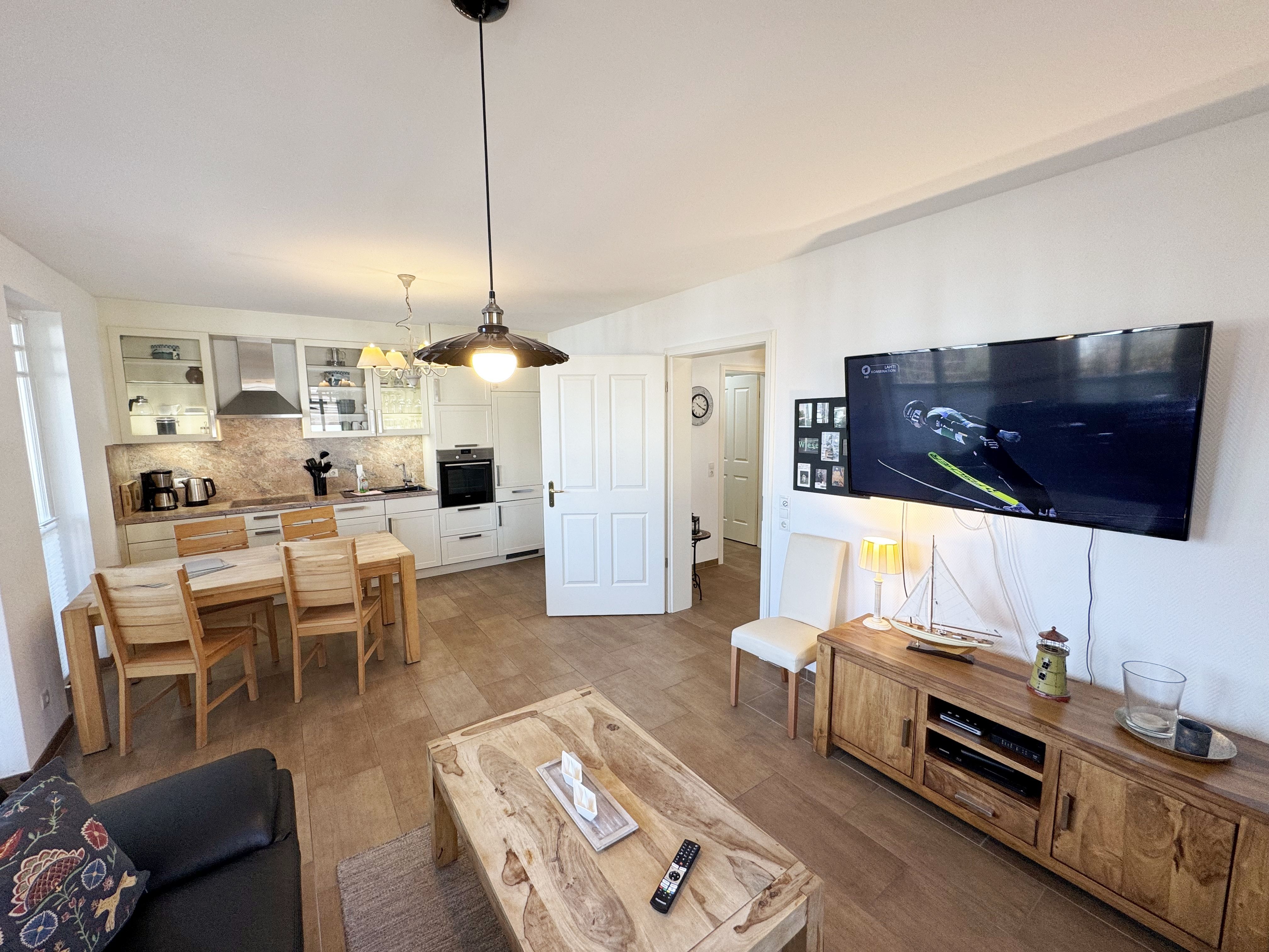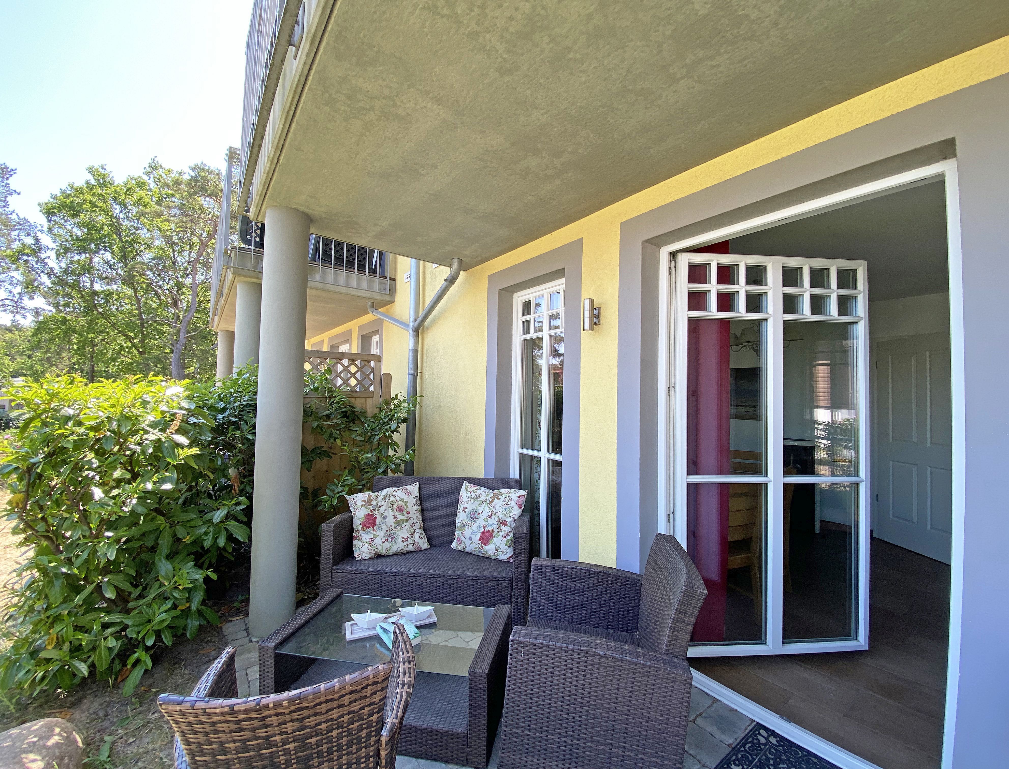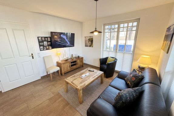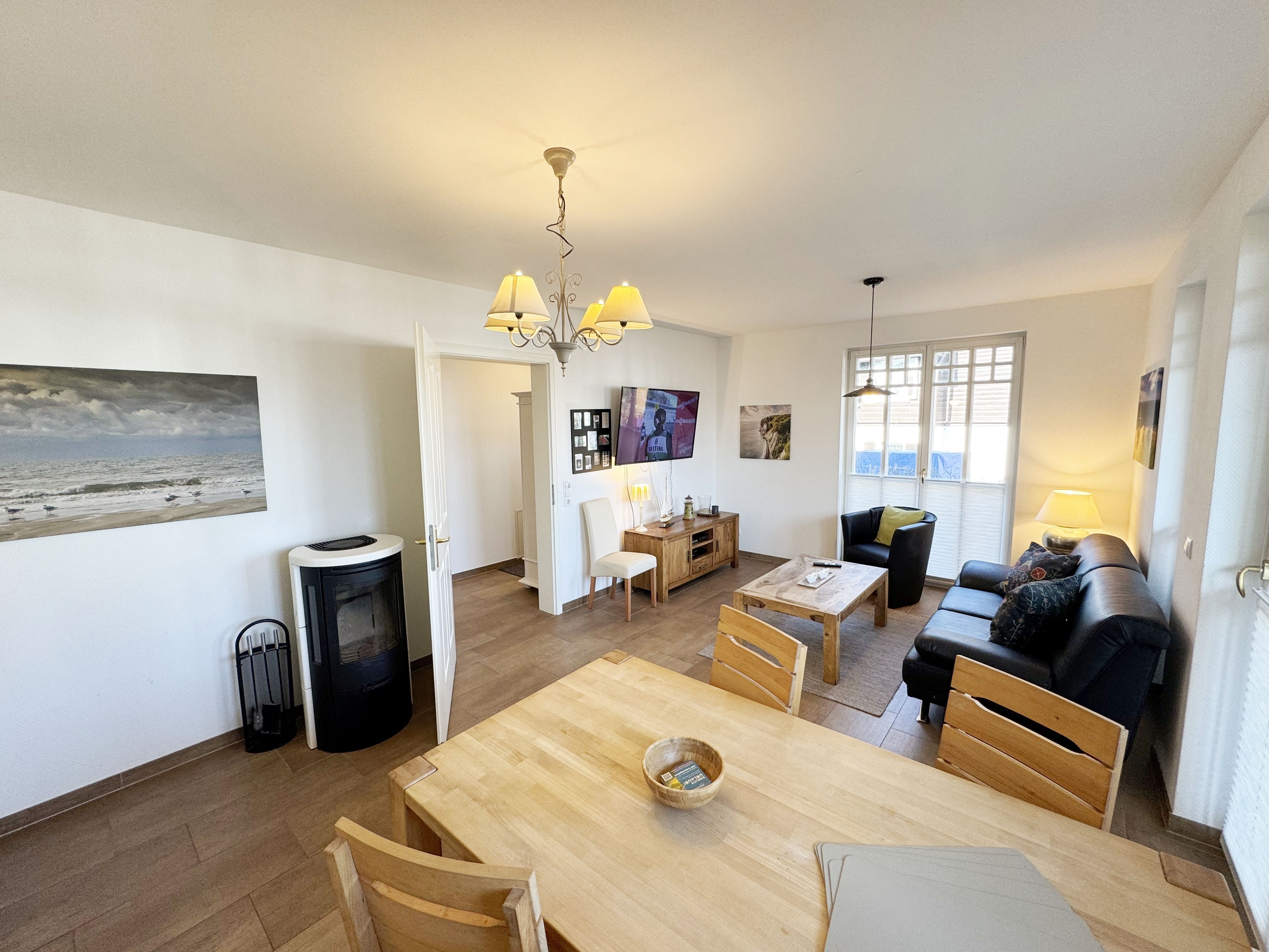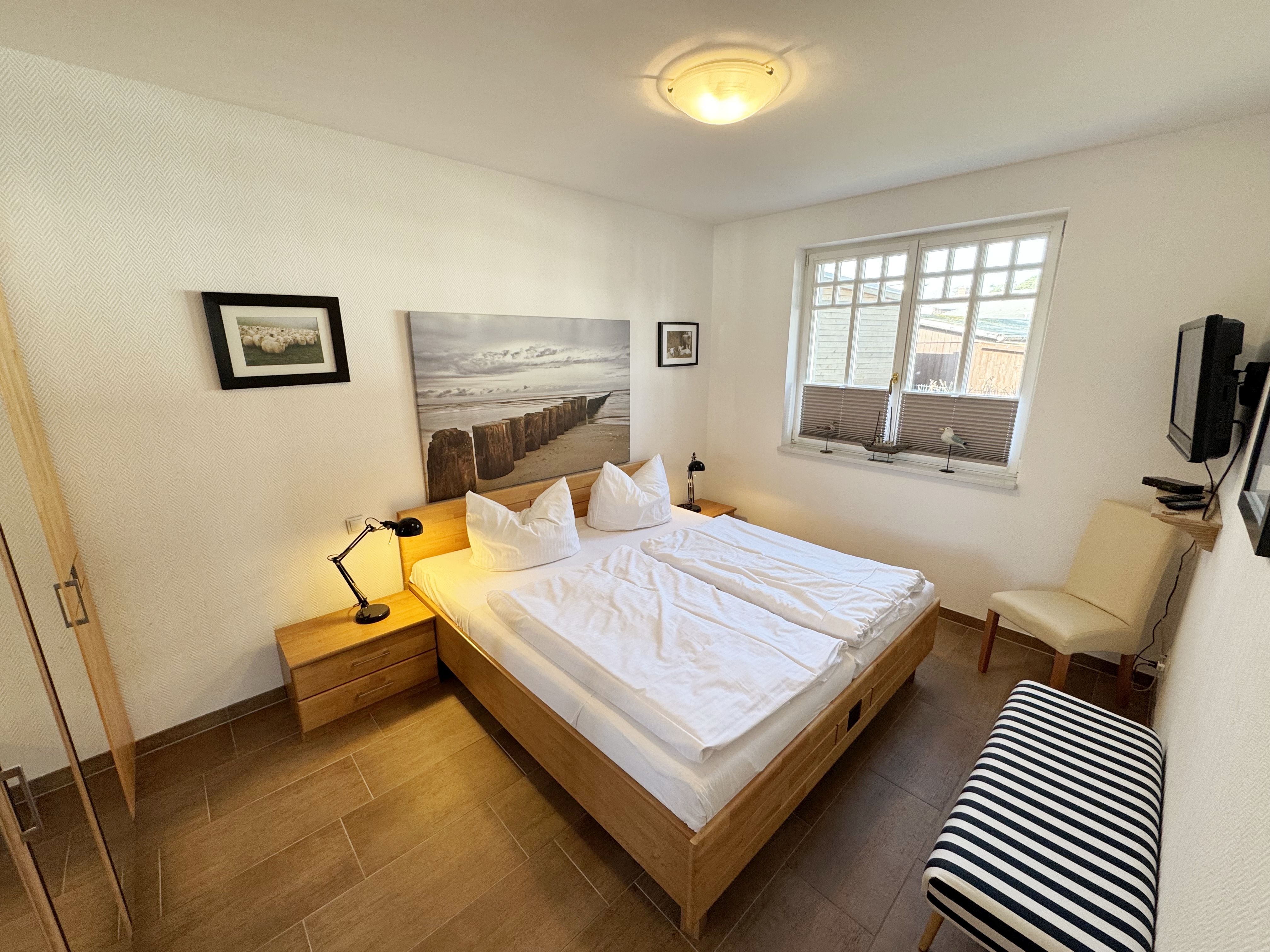 Die modern eingerichtete Nichtraucherferienwohnung 01 im Haus Strandkiefer befindet sich im Erdgeschoss. Sie bietet Ihnen mit ca. 56 m² ausreichend Platz für 2 bis 4 Personen + 1 Kleinkind bis 3 Jahre im Kinderreisebett. Vom Flur mit Garderobe gelangen sie in alle Räumlichkeiten. Der helle Wohn-/Essbereich besticht mit seinen bodentiefen Holzfenstern. Der Wohnbereich wurde mit einer Couch, einem Couchtisch, einem Sessel, einem TV-Board mit einem Smart-TV, einem WLAN-Zugang und einem Blu-Ray-Player ausgestattet. Abgerundet wird der Raum durch einen Kamin, der Ihnen gerade in der kälteren Jahreszeit, zusätzlich zur Fußbodenheizung, eine wohlige Wärme beschert. Die angrenzende Küchenzeile lässt keine Wünsche offen, so dass Sie mit einem Geschirrspüler, einem Backofen (selbstreinigend), einem Kühlschrank mit Gefrierfach, einem Cerankochfeld, einer Mikrowelle, einer Kaffeemaschine, einem Toaster, einem Wasserkocher, einem Mixer sowie diversen Küchenutensilien jede Mahlzeit zubereiten können. Zusätzlich finden Sie hier auch eine Waschmaschine. Durch den Essplatz am Fenster wird der Bereich komplettiert. Ihre bestuhlte Terrasse (Ost) erreichen Sie vom Wohnbereich, von wo Sie auch einen ganz kleinen Blick auf das Meer erhaschen können. Das große Schlafzimmer verfügt über ein Doppelbett (1,80m x 2,00m), verstellbare Lattenroste, Nachttischablagen mit Beleuchtung, einem großen Kleiderschrank, Verdunklungsplissees sowie einem Flachbild-TV. Das kleine Schlafzimmer verfügt über ein Tandem Bett (0,90m x 2,00m) welches zusätzlich über eine Ausziehfunktion für die 4. Person verfügt sowie einer Kommode. Das innenliegende Badezimmer ist mit einer Dusche (flacher Einstieg), einem WC, einem Waschtisch, einem Kosmetikspiegel, einem Fön und einer Badewanne ausgestattet. Ein Wäscheständer sowie Reinigungsutensilien runden die Ausstattung ab. Ihre mitgebrachten oder geliehenen Fahrräder können Sie im kleinen abschließbaren Fahrradschuppen unterbringen. Dieser befindet sich direkt an Ihrem Carport (Nr.01) welches auch gleichzeitig Ihr Stellplatz für Ihren PKW ist. 2 Haustiere sind gegen eine Gebühr gern gesehene Gäste. Die Erstausstattung eines Wäschepaketes (komplette Bettwäsche, 1 Duschhandtuch, 1 kleines Handtuch) können Sie bis 14 Tage vor Anreise gegen einen Aufpreis dazu buchen oder durch eigene ergänzen. Ab 2 gebuchten Paketen erhalten Sie einmalig 1 Geschirrhandtuch und 1 Duschvorleger hinzu.