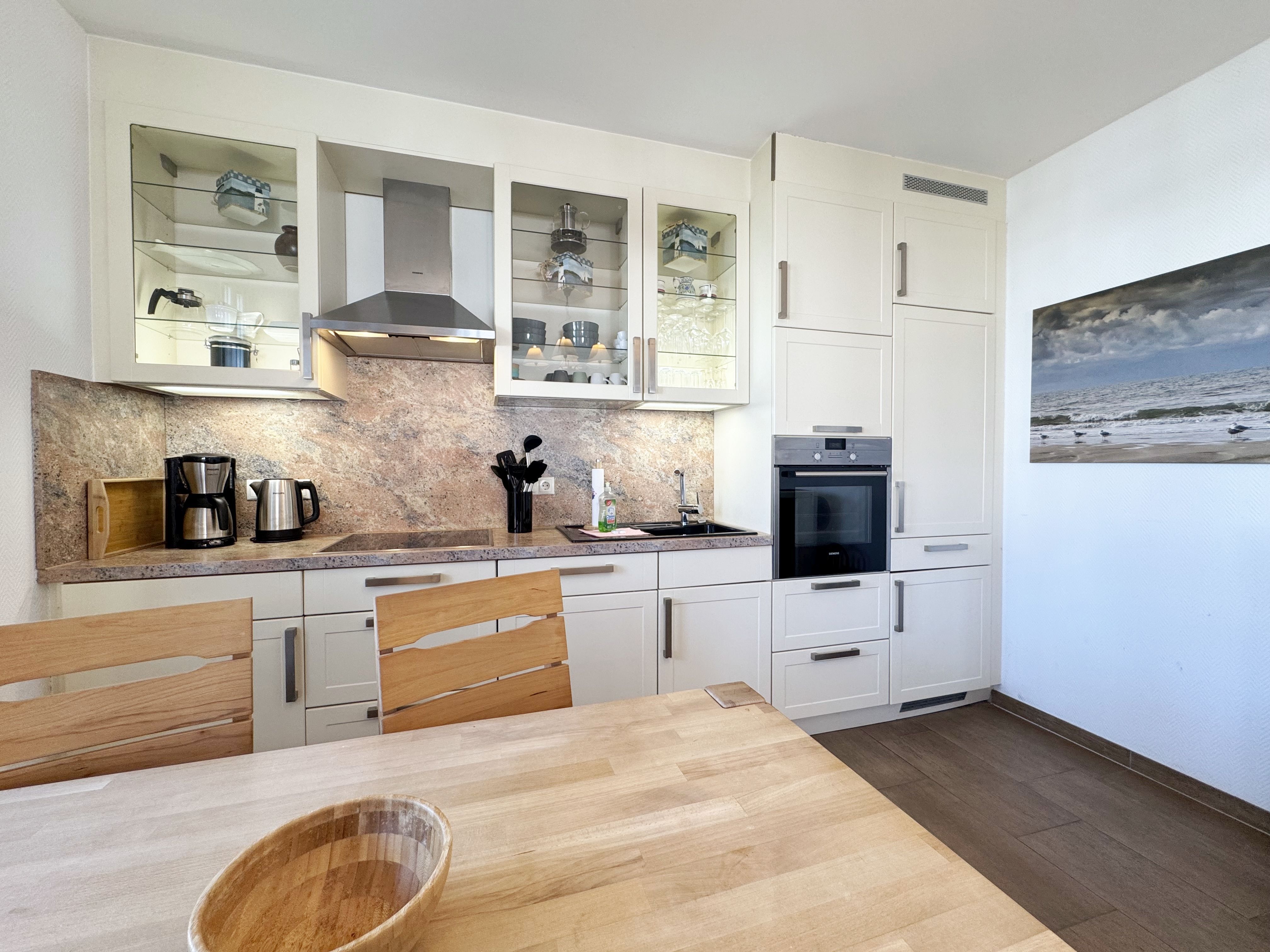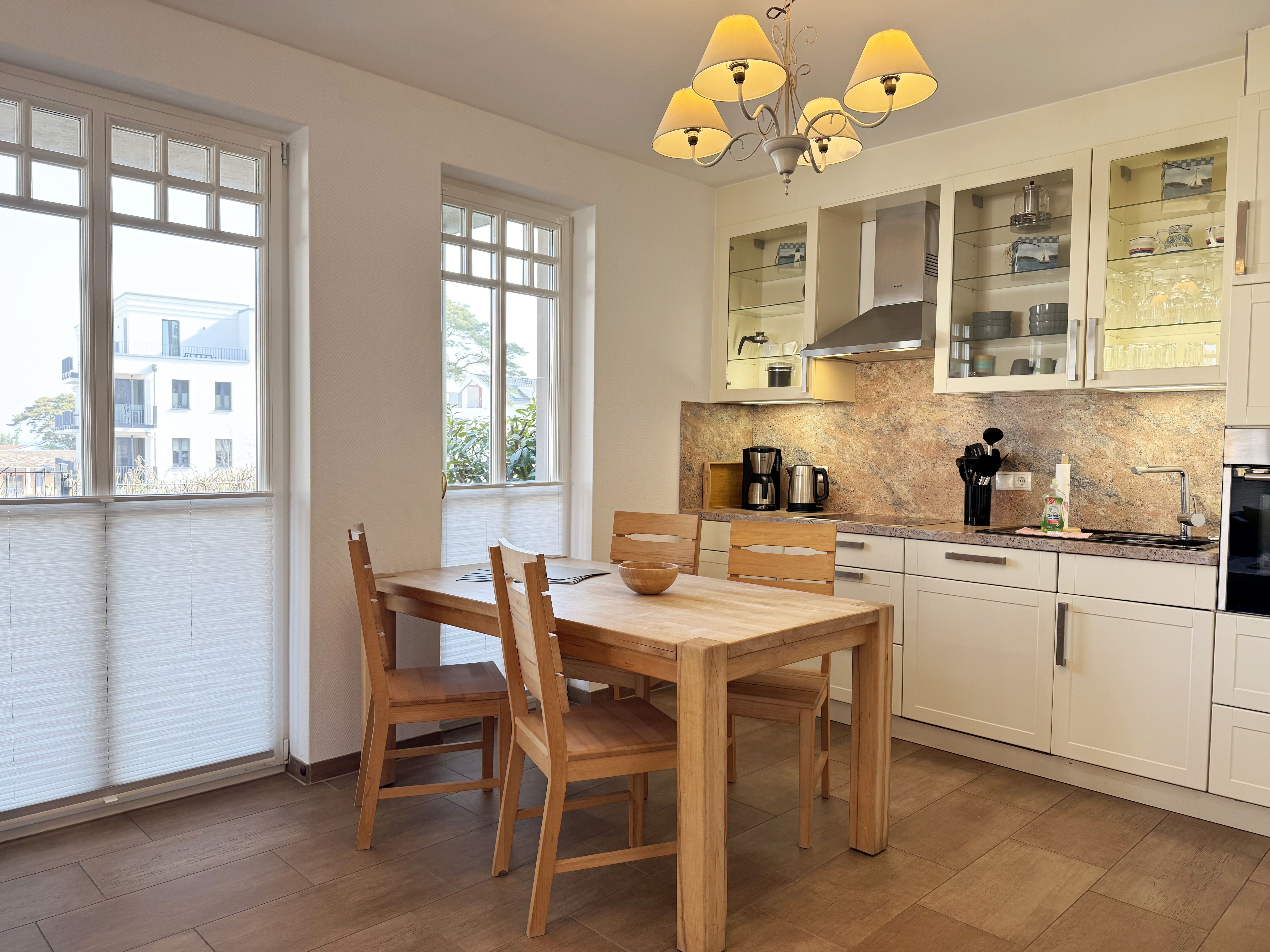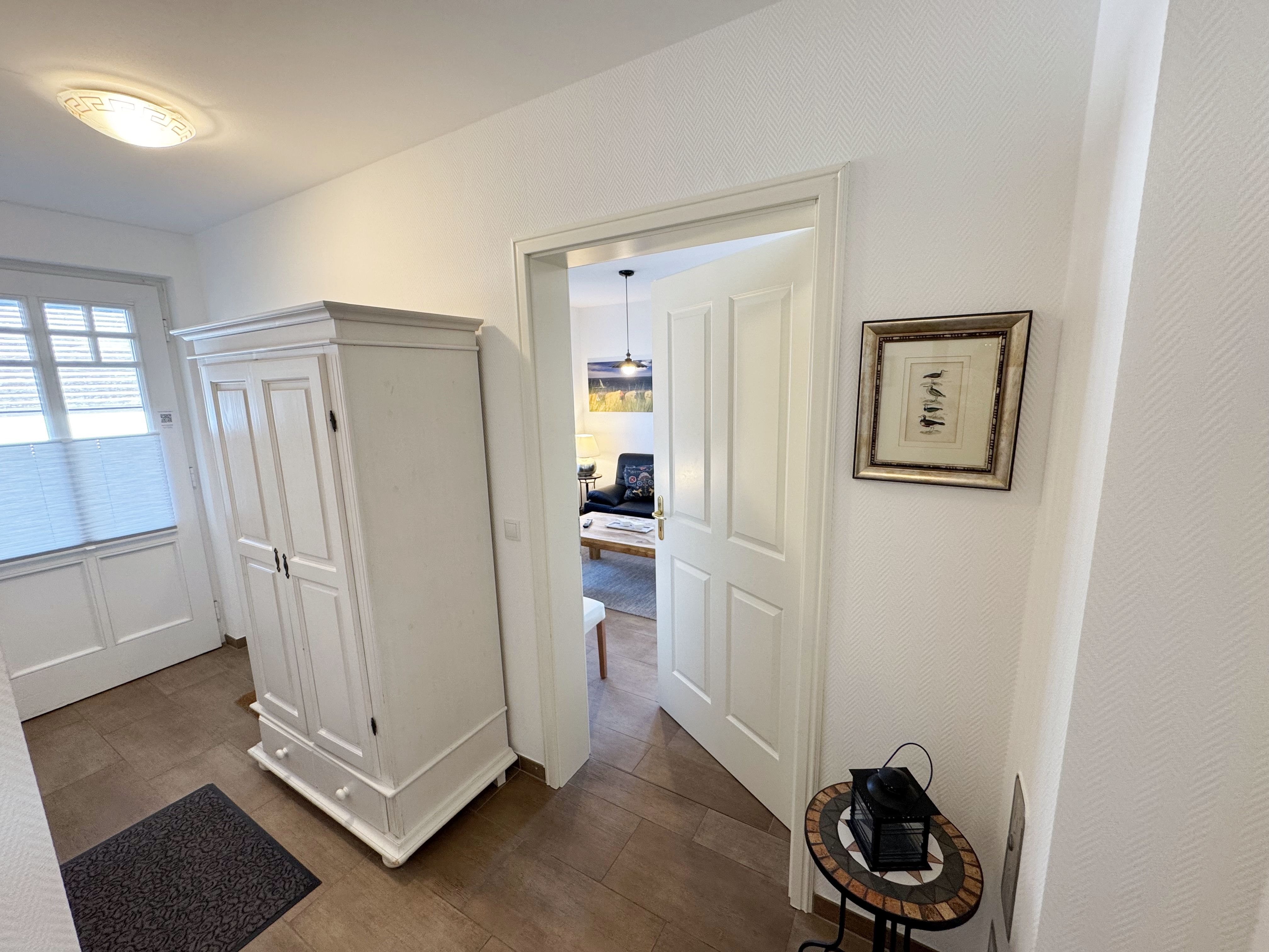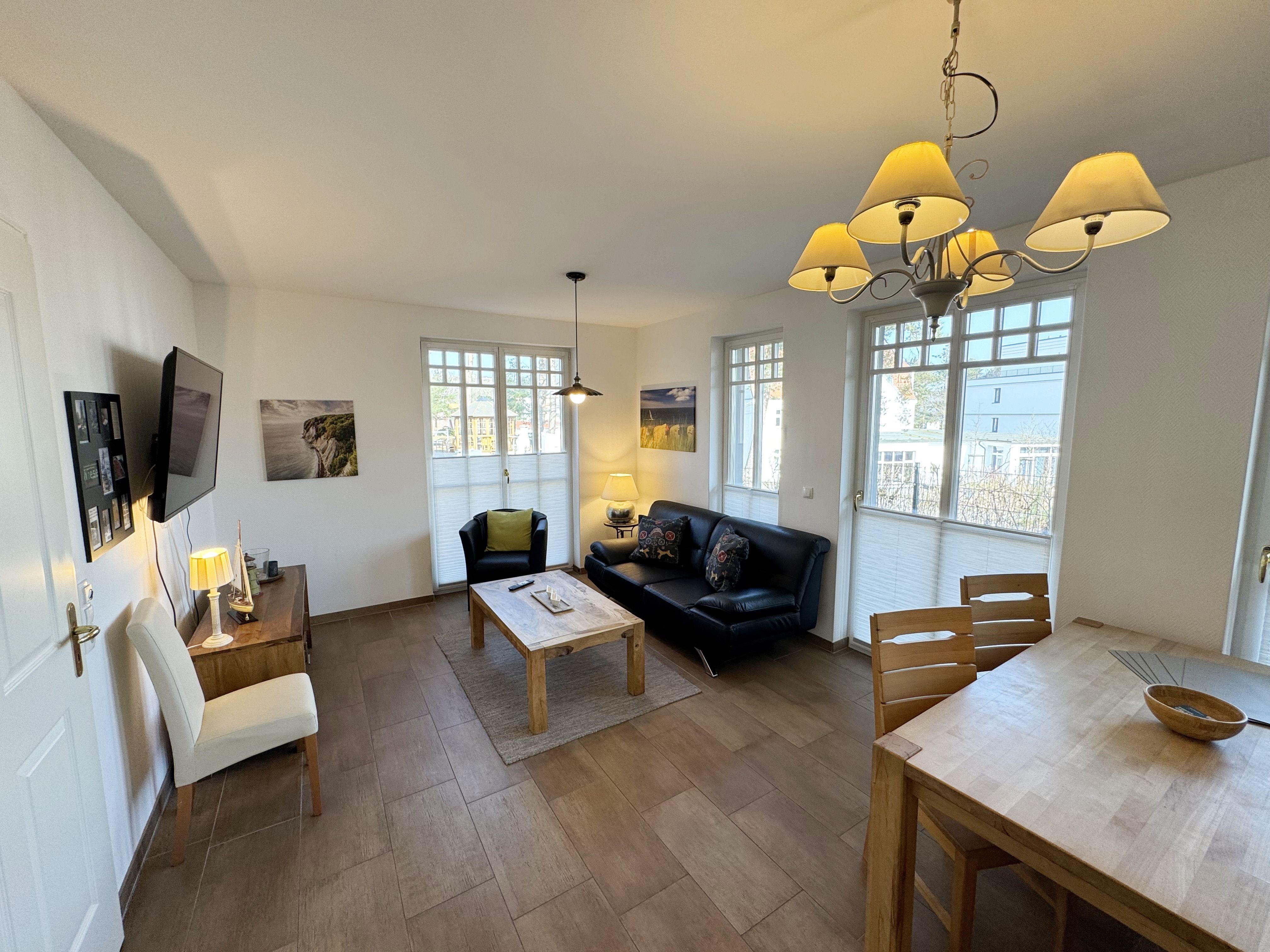 Die modern eingerichtete Nichtraucherferienwohnung 01 im Haus Strandkiefer befindet sich im Erdgeschoss. Sie bietet Ihnen mit ca. 56 m² ausreichend Platz für 2 bis 4 Personen + 1 Kleinkind bis 3 Jahre im Kinderreisebett. Vom Flur mit Garderobe gelangen sie in alle Räumlichkeiten. Der helle Wohn-/Essbereich besticht mit seinen bodentiefen Holzfenstern. Der Wohnbereich wurde mit einer Couch, einem Couchtisch, einem Sessel, einem TV-Board mit einem Smart-TV, einem WLAN-Zugang und einem Blu-Ray-Player ausgestattet. Abgerundet wird der Raum durch einen Kamin, der Ihnen gerade in der kälteren Jahreszeit, zusätzlich zur Fußbodenheizung, eine wohlige Wärme beschert. Die angrenzende Küchenzeile lässt keine Wünsche offen, so dass Sie mit einem Geschirrspüler, einem Backofen (selbstreinigend), einem Kühlschrank mit Gefrierfach, einem Cerankochfeld, einer Mikrowelle, einer Kaffeemaschine, einem Toaster, einem Wasserkocher, einem Mixer sowie diversen Küchenutensilien jede Mahlzeit zubereiten können. Zusätzlich finden Sie hier auch eine Waschmaschine. Durch den Essplatz am Fenster wird der Bereich komplettiert. Ihre bestuhlte Terrasse (Ost) erreichen Sie vom Wohnbereich, von wo Sie auch einen ganz kleinen Blick auf das Meer erhaschen können. Das große Schlafzimmer verfügt über ein Doppelbett (1,80m x 2,00m), verstellbare Lattenroste, Nachttischablagen mit Beleuchtung, einem großen Kleiderschrank, Verdunklungsplissees sowie einem Flachbild-TV. Das kleine Schlafzimmer verfügt über ein Tandem Bett (0,90m x 2,00m) welches zusätzlich über eine Ausziehfunktion für die 4. Person verfügt sowie einer Kommode. Das innenliegende Badezimmer ist mit einer Dusche (flacher Einstieg), einem WC, einem Waschtisch, einem Kosmetikspiegel, einem Fön und einer Badewanne ausgestattet. Ein Wäscheständer sowie Reinigungsutensilien runden die Ausstattung ab. Ihre mitgebrachten oder geliehenen Fahrräder können Sie im kleinen abschließbaren Fahrradschuppen unterbringen. Dieser befindet sich direkt an Ihrem Carport (Nr.01) welches auch gleichzeitig Ihr Stellplatz für Ihren PKW ist. 2 Haustiere sind gegen eine Gebühr gern gesehene Gäste. Die Erstausstattung eines Wäschepaketes (komplette Bettwäsche, 1 Duschhandtuch, 1 kleines Handtuch) können Sie bis 14 Tage vor Anreise gegen einen Aufpreis dazu buchen oder durch eigene ergänzen. Ab 2 gebuchten Paketen erhalten Sie einmalig 1 Geschirrhandtuch und 1 Duschvorleger hinzu.
