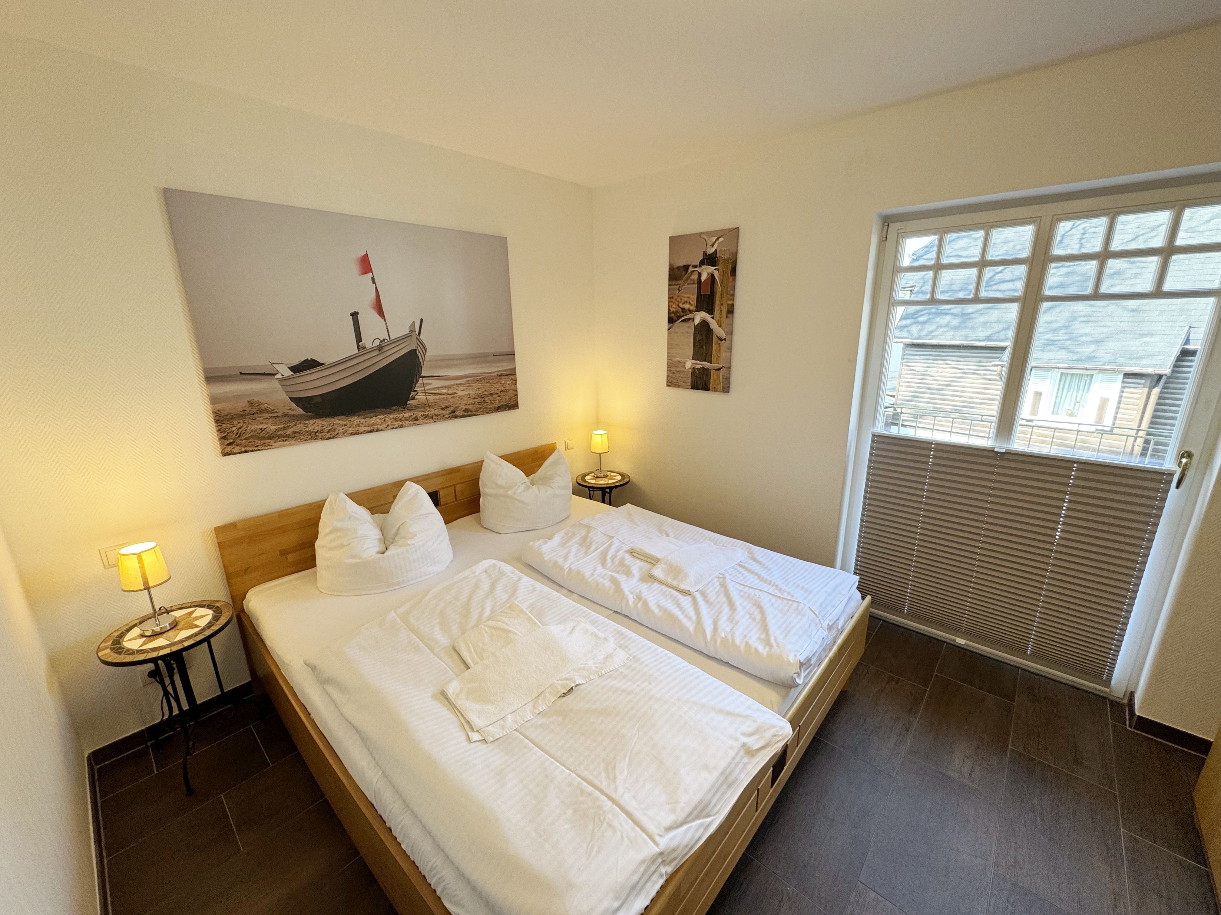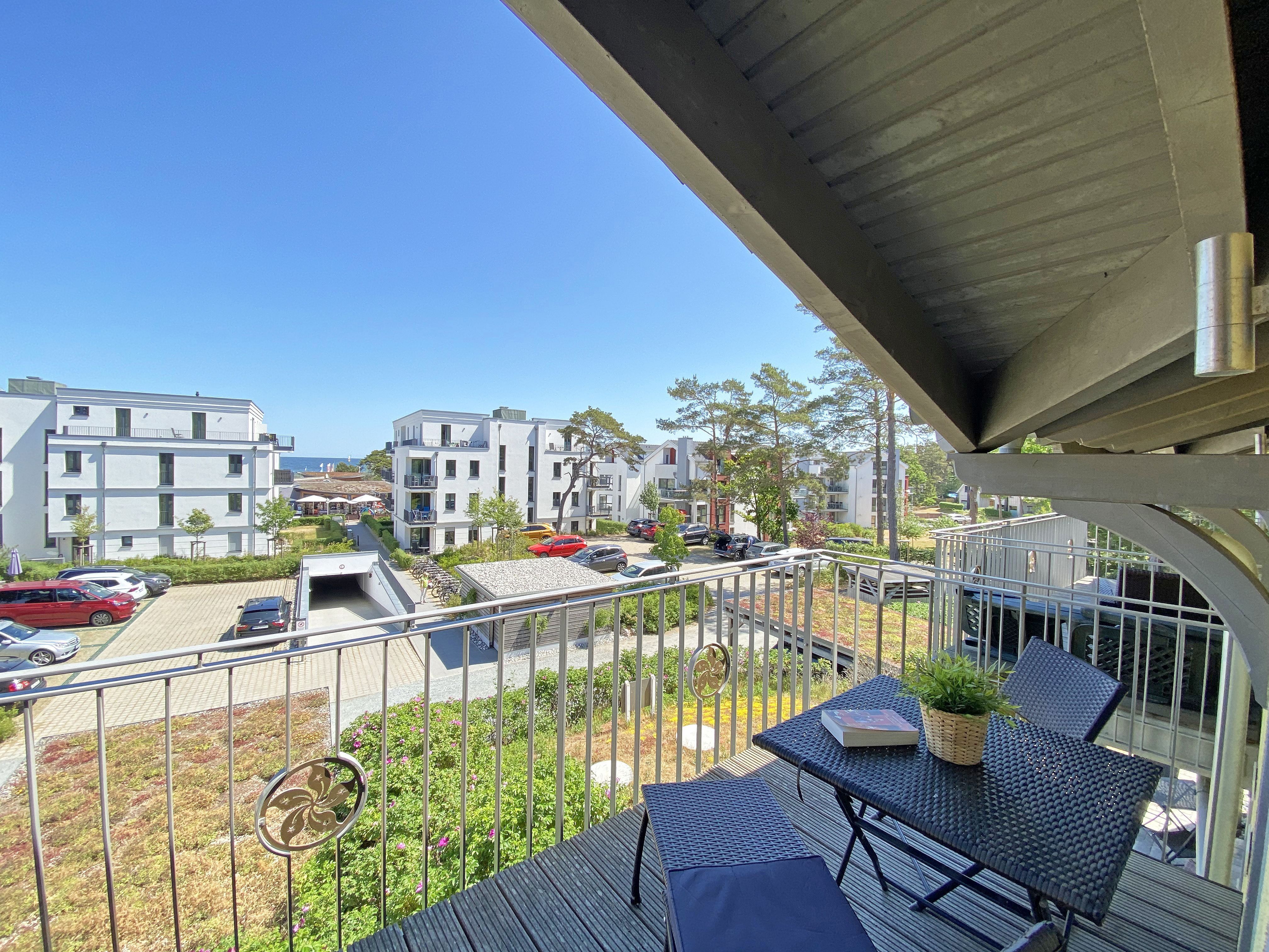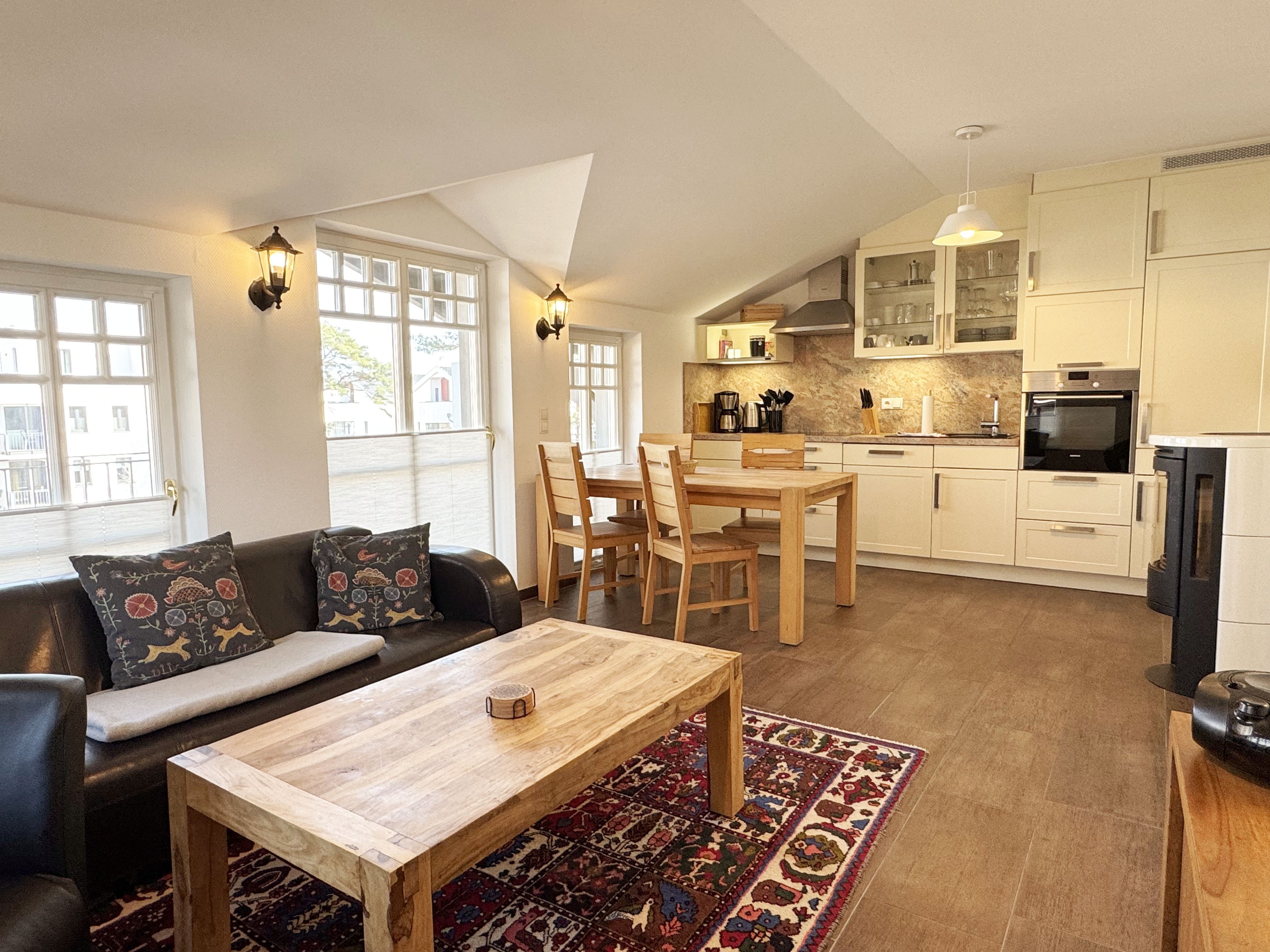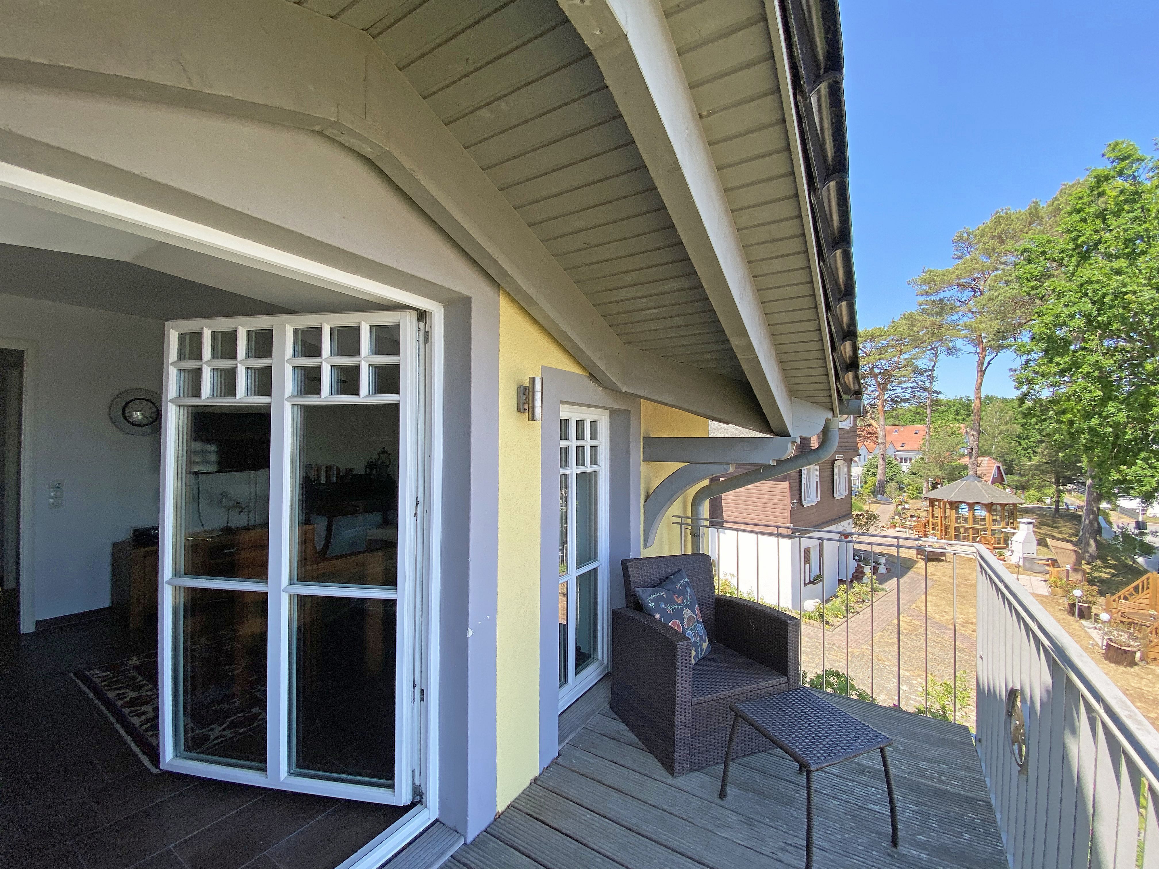 Die modern eingerichtete Nichtraucherferienwohnung 03 im Haus Strandkiefer befindet sich in der 1. Etage. Sie bietet Ihnen mit ca. 56 m² ausreichend Platz für 2 bis 4 Personen + 1 Kleinkind bis 3 Jahre im Kinderreisebett. Vom Flur mit Garderobe gelangen sie in alle Räumlichkeiten. Der helle Wohn-/Essbereich besticht mit seinen bodentiefen Holzfenstern und den Blick auf die Ostsee. Der Wohnbereich wurde mit einer Couch, einem Couchtisch, einem Sessel, einem TV-Board mit einem Smart-TV, einem WLAN-Zugang und einem Blu-Ray-Player ausgestattet. Abgerundet wird der Raum durch einen Kamin, der Ihnen gerade in der kälteren Jahreszeit, zusätzlich zur Fußbodenheizung, eine wohlige Wärme beschert. Die angrenzende Küchenzeile lässt keine Wünsche offen, so dass Sie mit einem Geschirrspüler, einem Backofen (selbstreinigend), einem Kühlschrank mit Gefrierfach, einem Cerankochfeld, einer Mikrowelle, einer Kaffeemaschine, einem Toaster, einem Wasserkocher, einem Mixer sowie diversen Küchenutensilien jede Mahlzeit zubereiten können. Zusätzlich finden Sie hier auch eine Waschmaschine mit Trocknerfunktion. Durch den Essplatz am Fenster wird der Bereich komplettiert. Ihr bestuhlter Balkon (Ost) erreichen Sie vom Wohnbereich, von wo Sie auch den Blick auf das Meer genießen können. Das große Schlafzimmer verfügt über ein Doppelbett (1,80m x 2,00m), verstellbare Lattenroste, Nachttischablagen mit Beleuchtung, einem großen Kleiderschrank und Verdunklungsplissees. Zusätzlich haben Sie auch von hier eine Möglichkeit auf einen weiteren Balkon (Nord) zu kommen. Das kleine Schlafzimmer verfügt über 2 Einzelbetten (0,90m x 2,00m), Nachttischablagen mit Beleuchtung, einem Flachbild-TV und Verdunklungsplissees. Das innenliegende Badezimmer ist mit einer Dusche (flacher Einstieg), einem WC, einem Waschtisch, einem Kosmetikspiegel, einem Fön und einer Badewanne ausgestattet. Ein Wäscheständer sowie Reinigungsutensilien runden die Ausstattung ab. Ihre mitgebrachten oder geliehenen Fahrräder können Sie im kleinen abschließbaren Fahrradschuppen neben dem Hauseingang unterbringen. Ihr PKW-Stellplatz (Nr.03) befindet sich direkt am Haus. 2 Haustiere sind gegen eine Gebühr gern gesehene Gäste. Die Erstausstattung eines Wäschepaketes (komplette Bettwäsche, 1 Duschhandtuch, 1 kleines Handtuch) können Sie bis 14 Tage vor Anreise gegen einen Aufpreis dazu buchen oder durch eigenes Ergänzen. Ab 2 gebuchten Paketen erhalten Sie einmalig 1 Geschirrhandtuch und 1 Duschvorleger hinzu.
