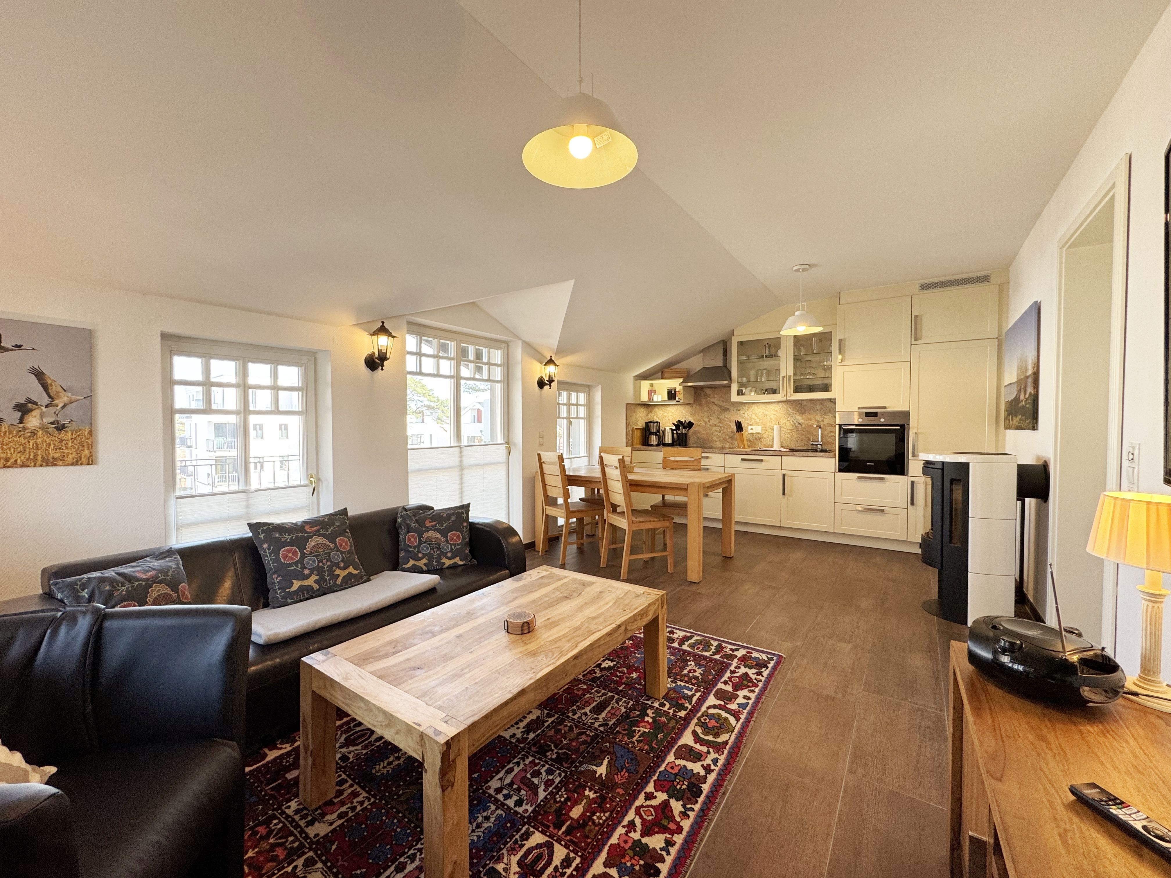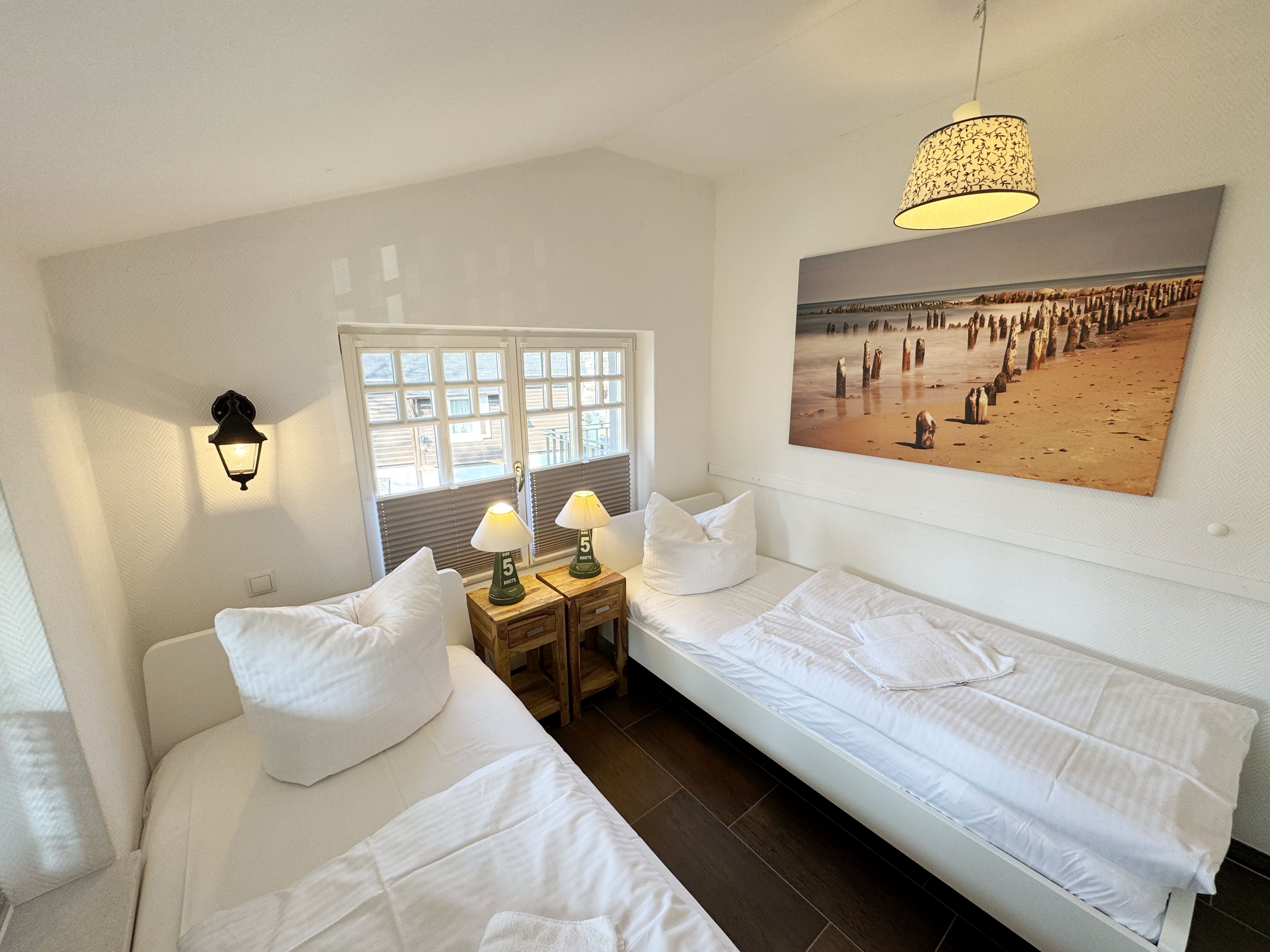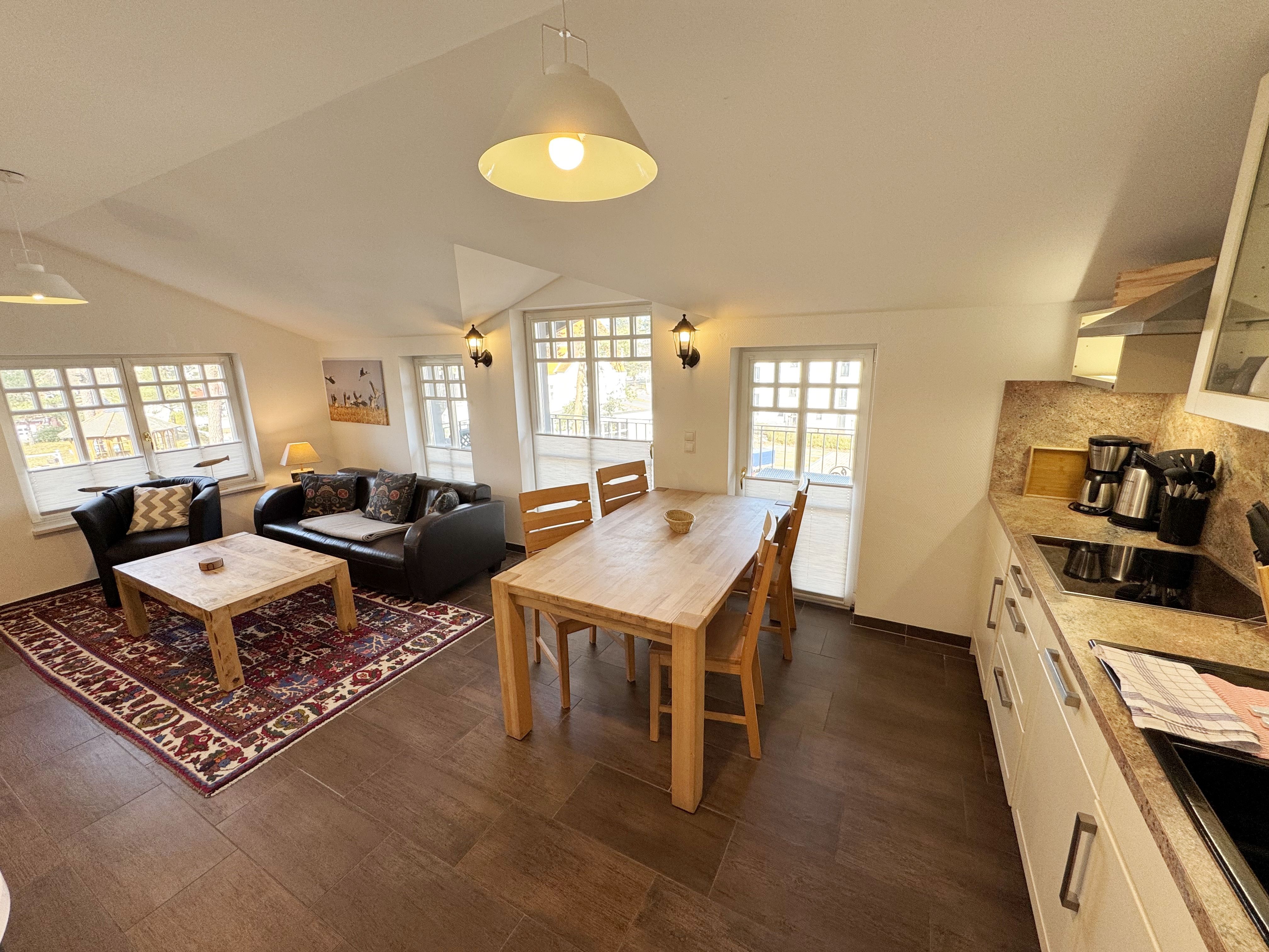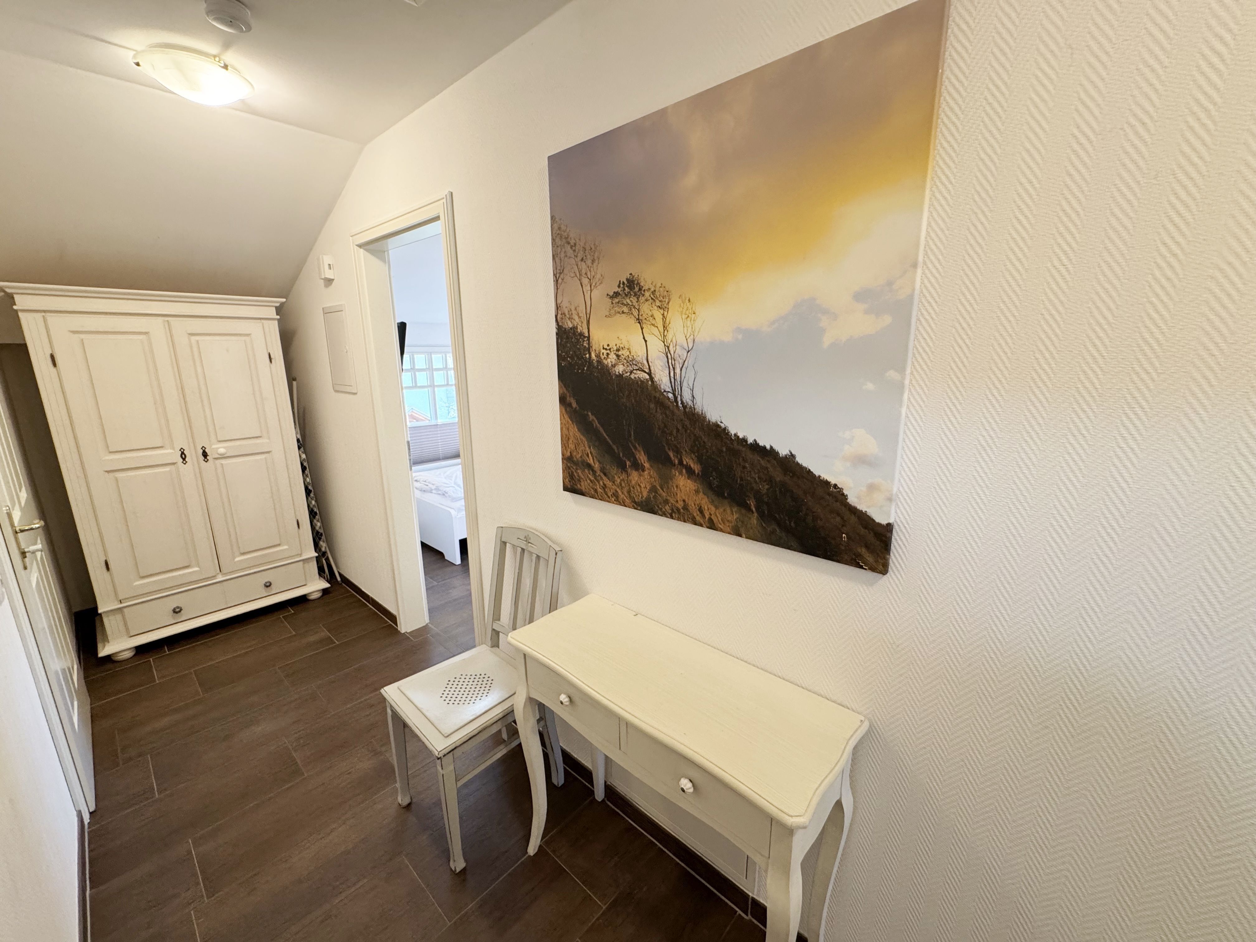 Die modern eingerichtete Nichtraucherferienwohnung 03 im Haus Strandkiefer befindet sich in der 1. Etage. Sie bietet Ihnen mit ca. 56 m² ausreichend Platz für 2 bis 4 Personen + 1 Kleinkind bis 3 Jahre im Kinderreisebett. Vom Flur mit Garderobe gelangen sie in alle Räumlichkeiten. Der helle Wohn-/Essbereich besticht mit seinen bodentiefen Holzfenstern und den Blick auf die Ostsee. Der Wohnbereich wurde mit einer Couch, einem Couchtisch, einem Sessel, einem TV-Board mit einem Smart-TV, einem WLAN-Zugang und einem Blu-Ray-Player ausgestattet. Abgerundet wird der Raum durch einen Kamin, der Ihnen gerade in der kälteren Jahreszeit, zusätzlich zur Fußbodenheizung, eine wohlige Wärme beschert. Die angrenzende Küchenzeile lässt keine Wünsche offen, so dass Sie mit einem Geschirrspüler, einem Backofen (selbstreinigend), einem Kühlschrank mit Gefrierfach, einem Cerankochfeld, einer Mikrowelle, einer Kaffeemaschine, einem Toaster, einem Wasserkocher, einem Mixer sowie diversen Küchenutensilien jede Mahlzeit zubereiten können. Zusätzlich finden Sie hier auch eine Waschmaschine mit Trocknerfunktion. Durch den Essplatz am Fenster wird der Bereich komplettiert. Ihr bestuhlter Balkon (Ost) erreichen Sie vom Wohnbereich, von wo Sie auch den Blick auf das Meer genießen können. Das große Schlafzimmer verfügt über ein Doppelbett (1,80m x 2,00m), verstellbare Lattenroste, Nachttischablagen mit Beleuchtung, einem großen Kleiderschrank und Verdunklungsplissees. Zusätzlich haben Sie auch von hier eine Möglichkeit auf einen weiteren Balkon (Nord) zu kommen. Das kleine Schlafzimmer verfügt über 2 Einzelbetten (0,90m x 2,00m), Nachttischablagen mit Beleuchtung, einem Flachbild-TV und Verdunklungsplissees. Das innenliegende Badezimmer ist mit einer Dusche (flacher Einstieg), einem WC, einem Waschtisch, einem Kosmetikspiegel, einem Fön und einer Badewanne ausgestattet. Ein Wäscheständer sowie Reinigungsutensilien runden die Ausstattung ab. Ihre mitgebrachten oder geliehenen Fahrräder können Sie im kleinen abschließbaren Fahrradschuppen neben dem Hauseingang unterbringen. Ihr PKW-Stellplatz (Nr.03) befindet sich direkt am Haus. 2 Haustiere sind gegen eine Gebühr gern gesehene Gäste. Die Erstausstattung eines Wäschepaketes (komplette Bettwäsche, 1 Duschhandtuch, 1 kleines Handtuch) können Sie bis 14 Tage vor Anreise gegen einen Aufpreis dazu buchen oder durch eigenes Ergänzen. Ab 2 gebuchten Paketen erhalten Sie einmalig 1 Geschirrhandtuch und 1 Duschvorleger hinzu.