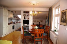 Die Wohnung ist exklusiv mit Stilmöbeln in Kirschbaum und Mahagoni, hochwertigem Bucheparkett, Stuckdecken und Kassettentüren eingerichtet. Der stillvolle Wohn- Essbereich ist mit einer Couch, Flachbild-TV und DVD-Player sowie einer Stereo-Anlage und Esstisch eingericht. Die offene Einbauküche ist mit Backofen, Spülmaschine, Kühlschrank mit Gefrierfach, Kaffeemaschine, Wasserkocher und Toaster ausgestattet. Das erste der beiden Schlafzimmer ist mit einem Doppelbett ausgestattet, das zweite mit zwei Einzelbetten. Im hochwertigen Bad mit Glasdusche müssen sie außerdem auf Haartrockner und Schminkspiegel nicht verzichten. Die Wohnung besitzt einen sonnigen Balkon mit entsprechenden Möbeln. W-LAN steht Ihnen kostenfrei zur Verfügung.