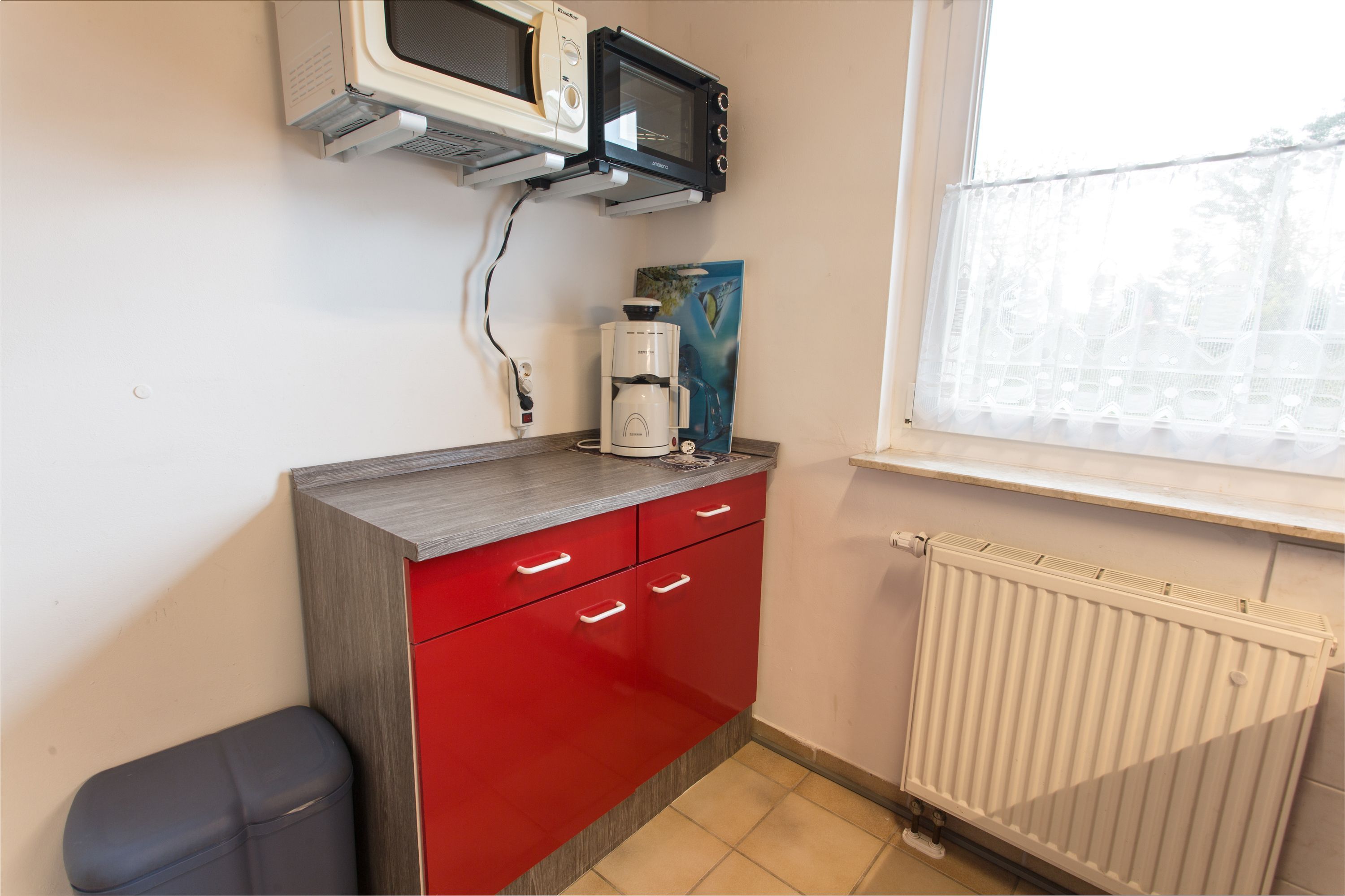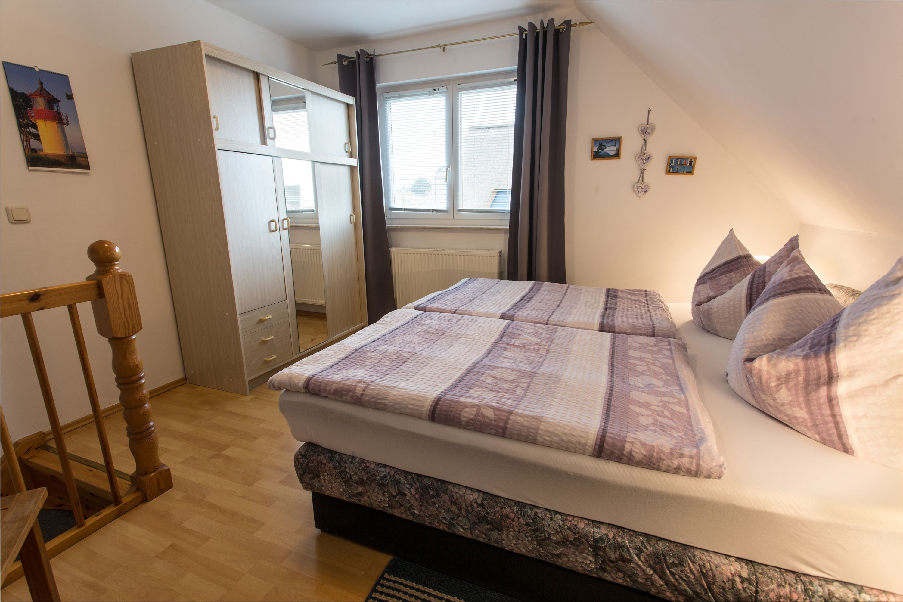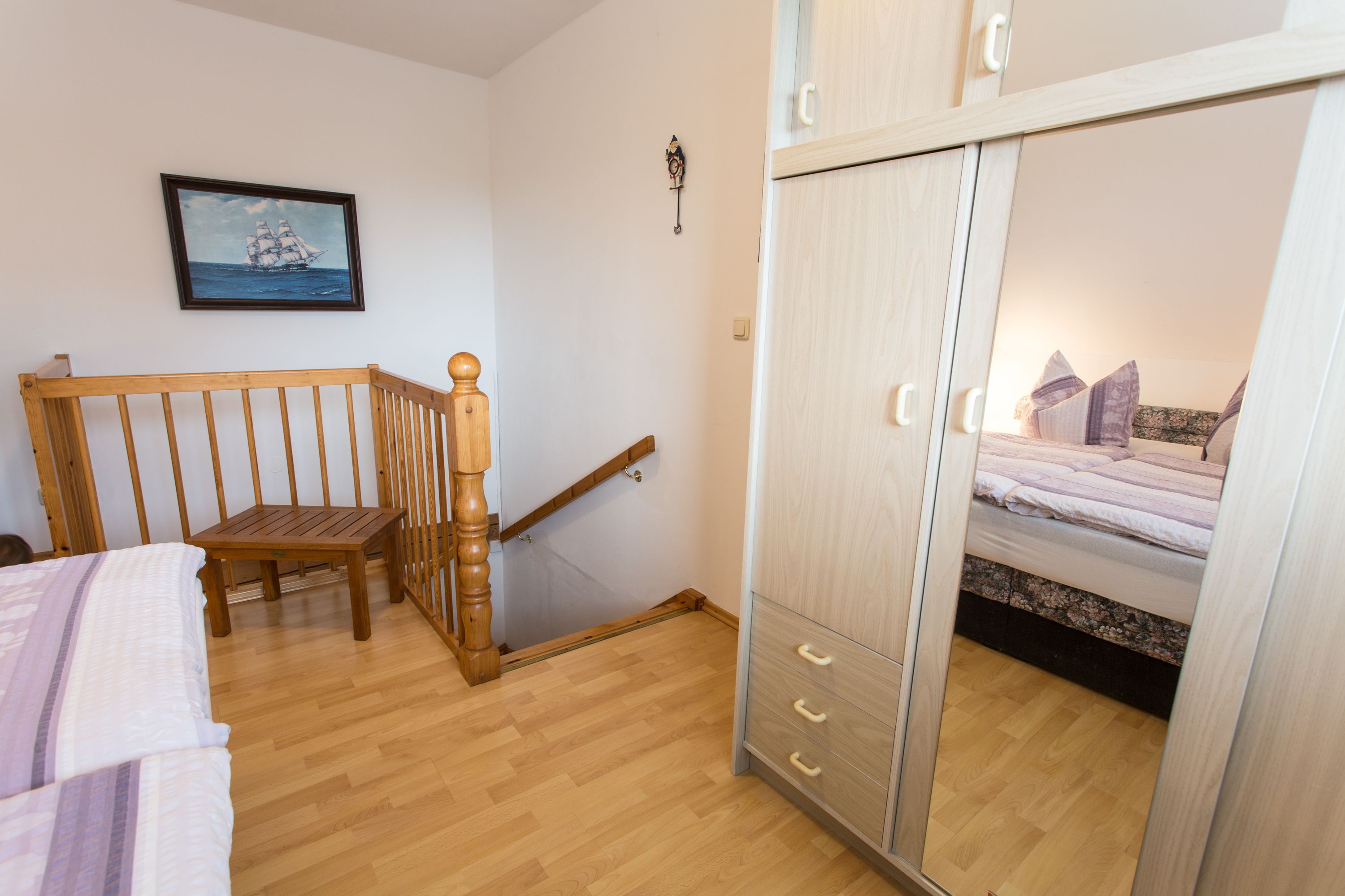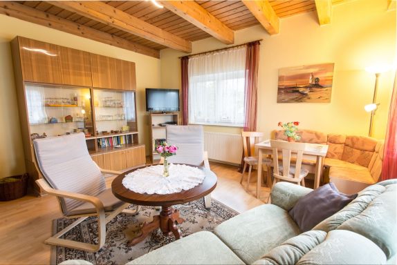 Zur Verfügung steht eine Nichtraucherferienwohnung für 4 Personen mit 48 qm über 2 Etagen. Im Erdgeschoss befinden sich das geräumige Wohnzimmer mit Kaminofen (Aufbettung möglich) sowie die voll ausgestattete Küche und Dusche/WC. Das Schlafzimmer mit Doppelbett befindet sich in der 1. Etage.