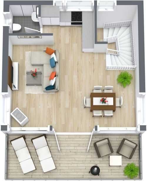 Der lichtdurchflutete Wohnbereich mit Zugang zur Sonnenterrasse, sowie der Küchenbereich und ein separates WC befinden sich in der oberen Etage.