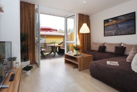 Die Ferienwohnung erstreckt sich über 2 Etagen, ist sehr geräumig und komfortabel eingerichtet. Im 1.OG befindet sich das Wohnzimmer mit Flachbild TV, Radio, einem schönen Balkon, ein Bad mit Dusche, WC und einem Fön. Die offene Einbauküche ist mit einem Ceranherd, Backofen, Kühlschrank, Tiefkühlfach, Gläser, Besteck und Geschirr ausgestattet. Die obere Etage mit zwei Schlafzimmern und einem zweiten Bad mit Dusche und WC, bietet einen weiteren Balkon, auf dem man gemütlich den Tag ausklingen lassen kann. In der kalten Jahreszeit sorgt eine Fußbodenheizung für behagliche Wärme.