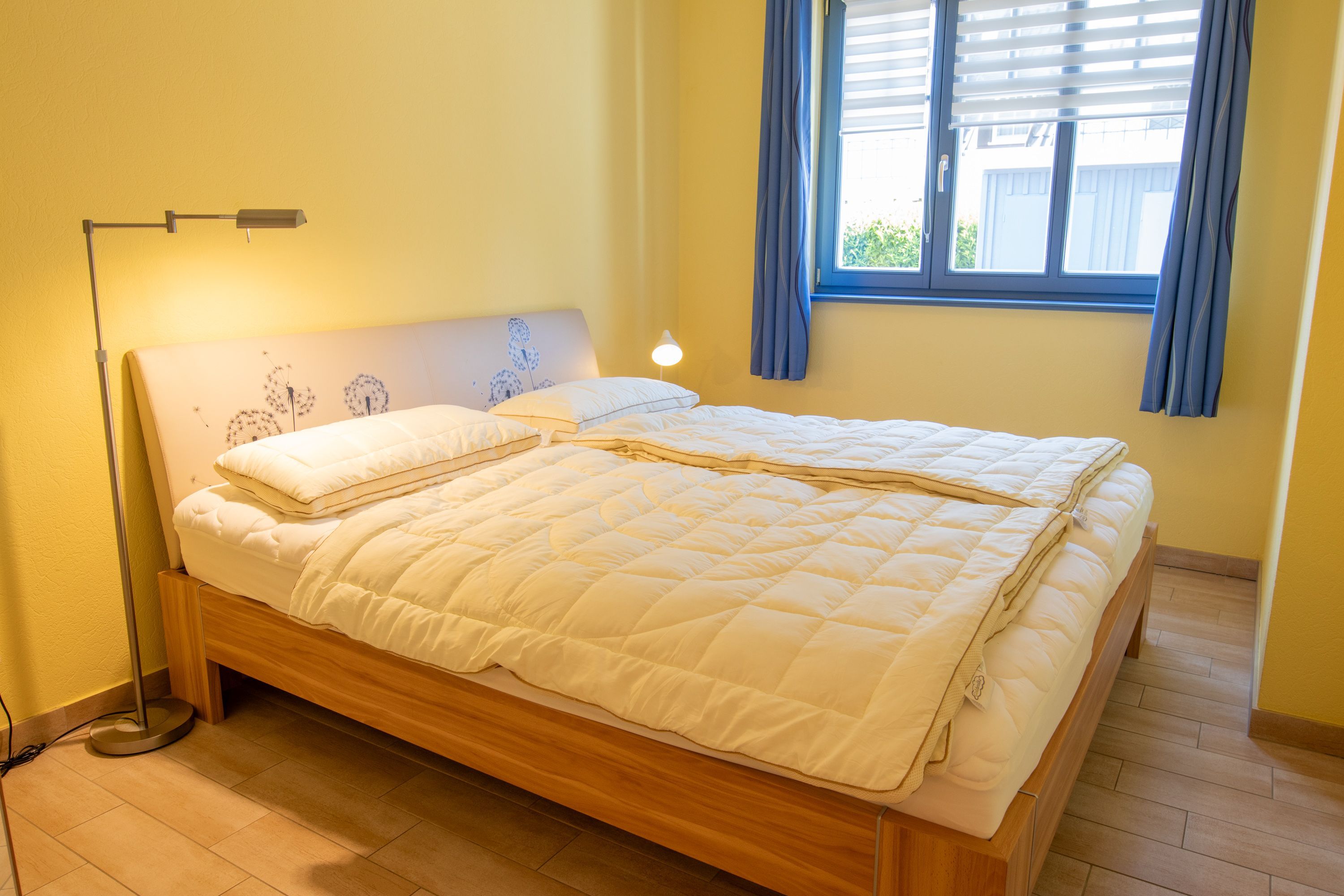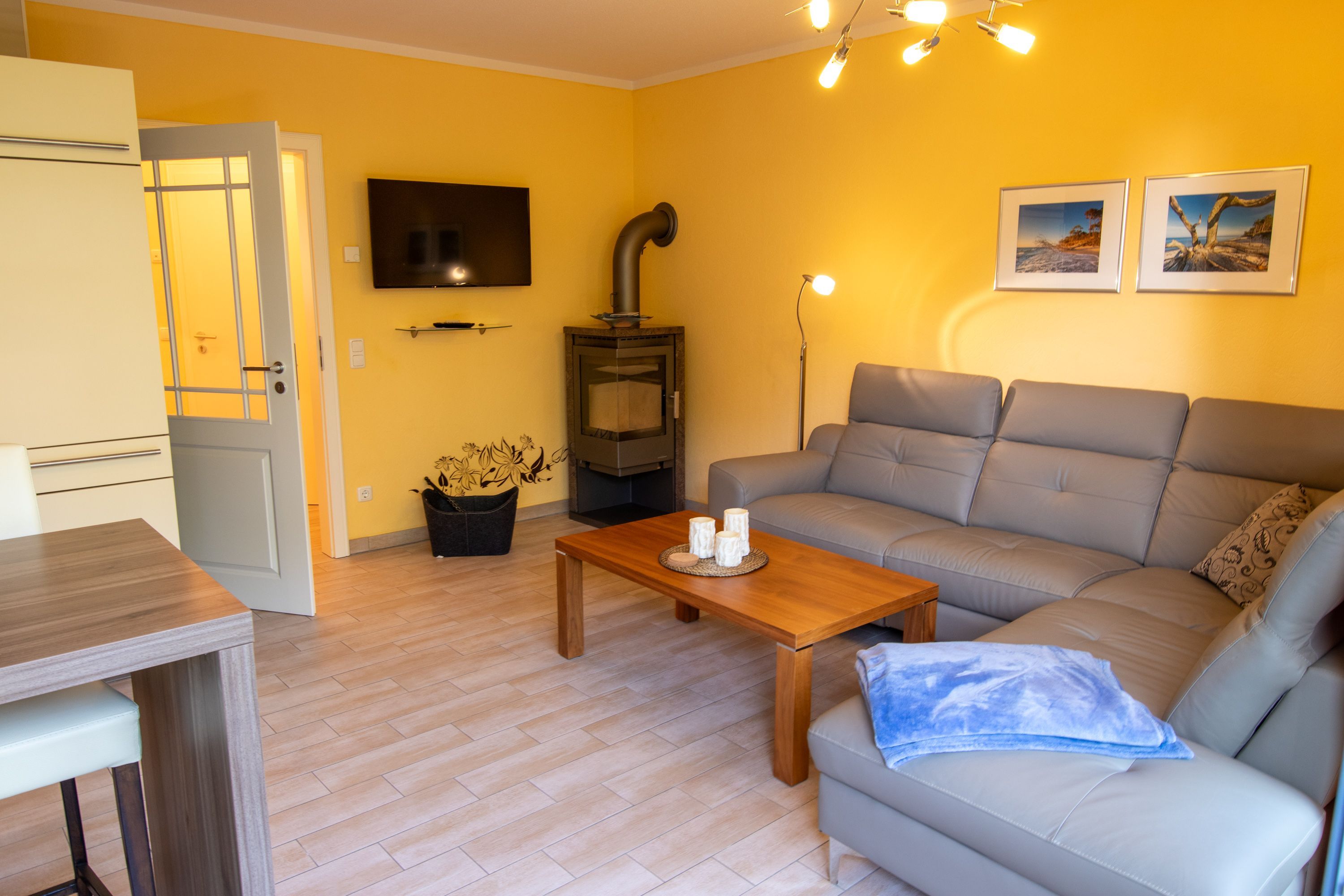 Die 50 m² große Ferienwohnung besteht aus einem modern eingerichteten Wohnzimmer mit Kamin, Sat-TV und integrierter, voll ausgestatteter Küche mit Sitzplätzen, einem separaten Schlafzimmer mit Doppelbett und einem hochwertigen Bad mit Dusche und WC. Die Fußbodenheizung und Insektenschutzgitter an den Fenstern runden das Angebot ab. Zur Ferienwohnung gehört ein PKW-Stellplatz direkt am Haus. Fahrräder und Strandutensilien können Sie separat in einem Abstellraum unterstellen.