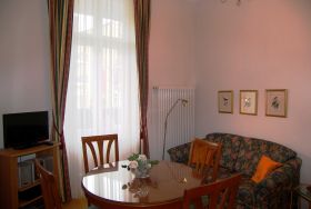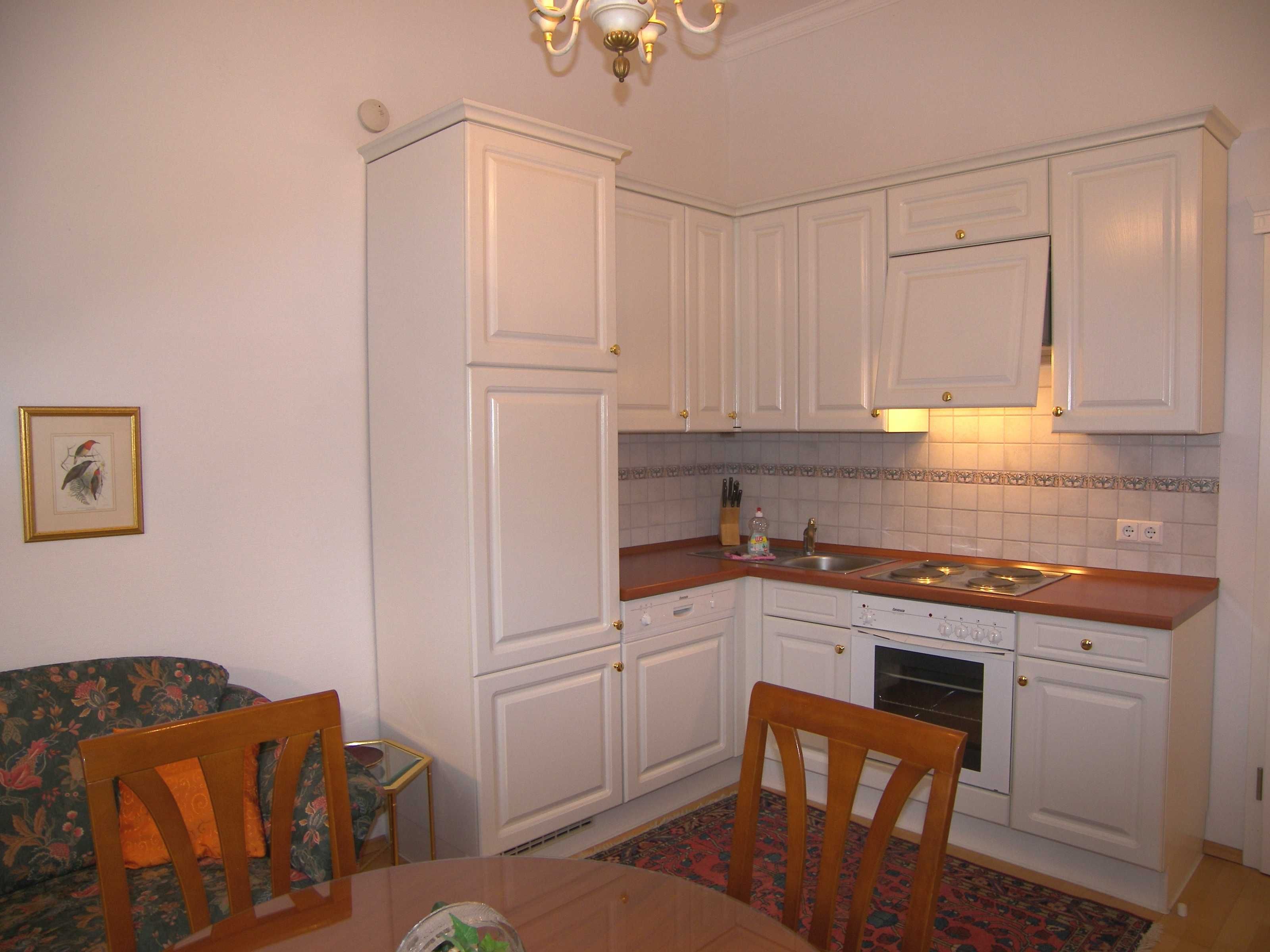 Die Wohnung ist exklusiv mit Stilmöbeln in Kirschbaum, hochwertigem Bucheparkett, Stuckdecken und Kassettentüren eingerichtet. Der stillvolle Wohn-Essbereich ist mit einer Couch, Esstisch sowie Flachbild-TV und DVD-Player sowie einer Stereo-Anlage eingericht. Die offene Einbauküche ist mit Backofen, Spülmaschine, Kühlschrank mit Gefrierfach, Kaffeemaschine, Wasserkocher und Toaster ausgestattet. Das separate Schlafzimmer verfügt über ein Doppelbett. Im hochwertigen Bad mit Glasdusche müssen sie außerdem auf Haartrockner und Schminkspiegel nicht verzichten. Die Wohnung besitzt einen sonnigen Balkon mit entsprechenden Möbeln. W-LAN steht Ihnen kostenfrei zur Verfügung.