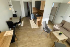 Die Ferienwohnung befindet sich in einem Reihenhaus. Die Küchenzeile ist offen zum Wohnbereich.