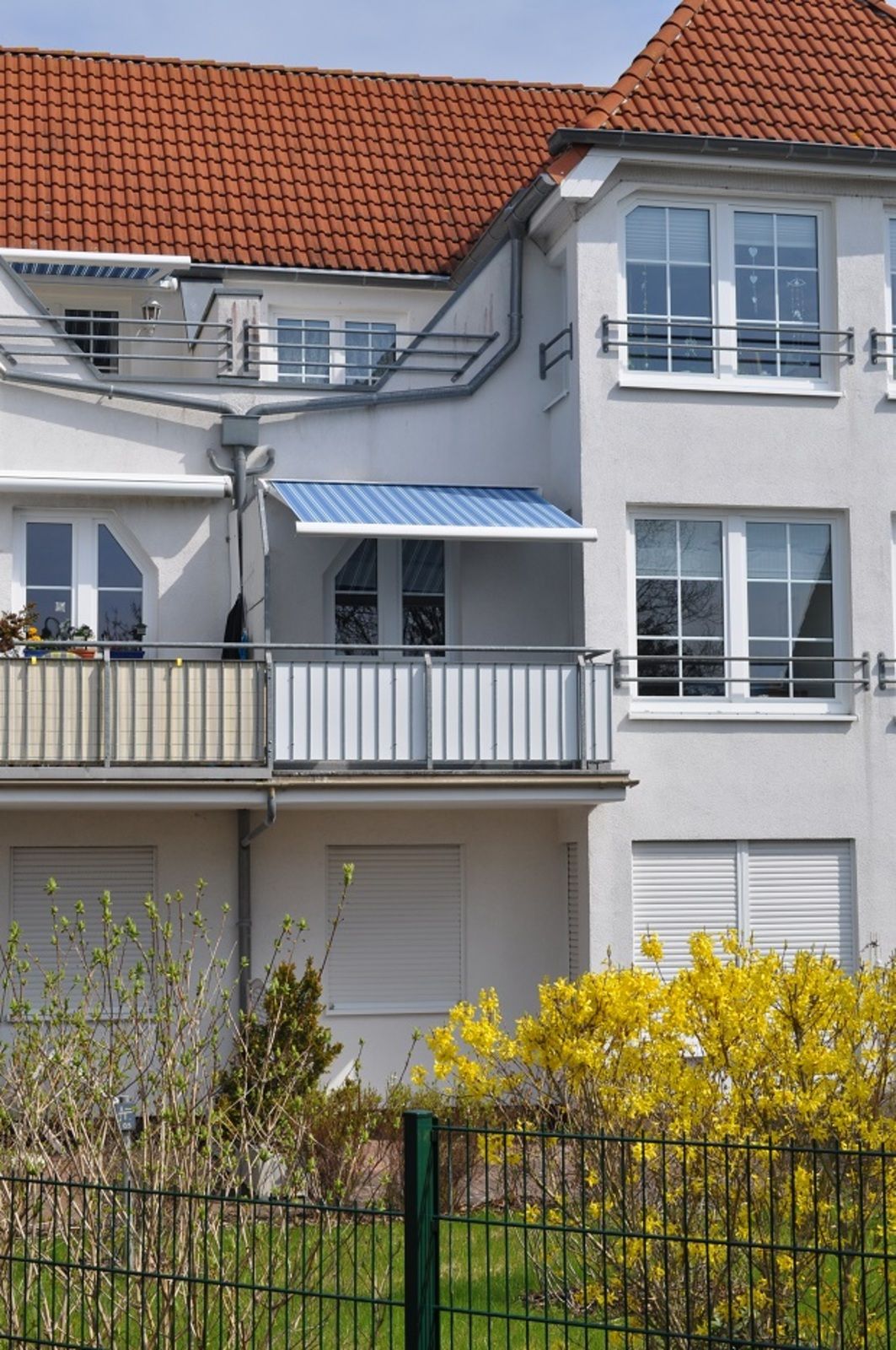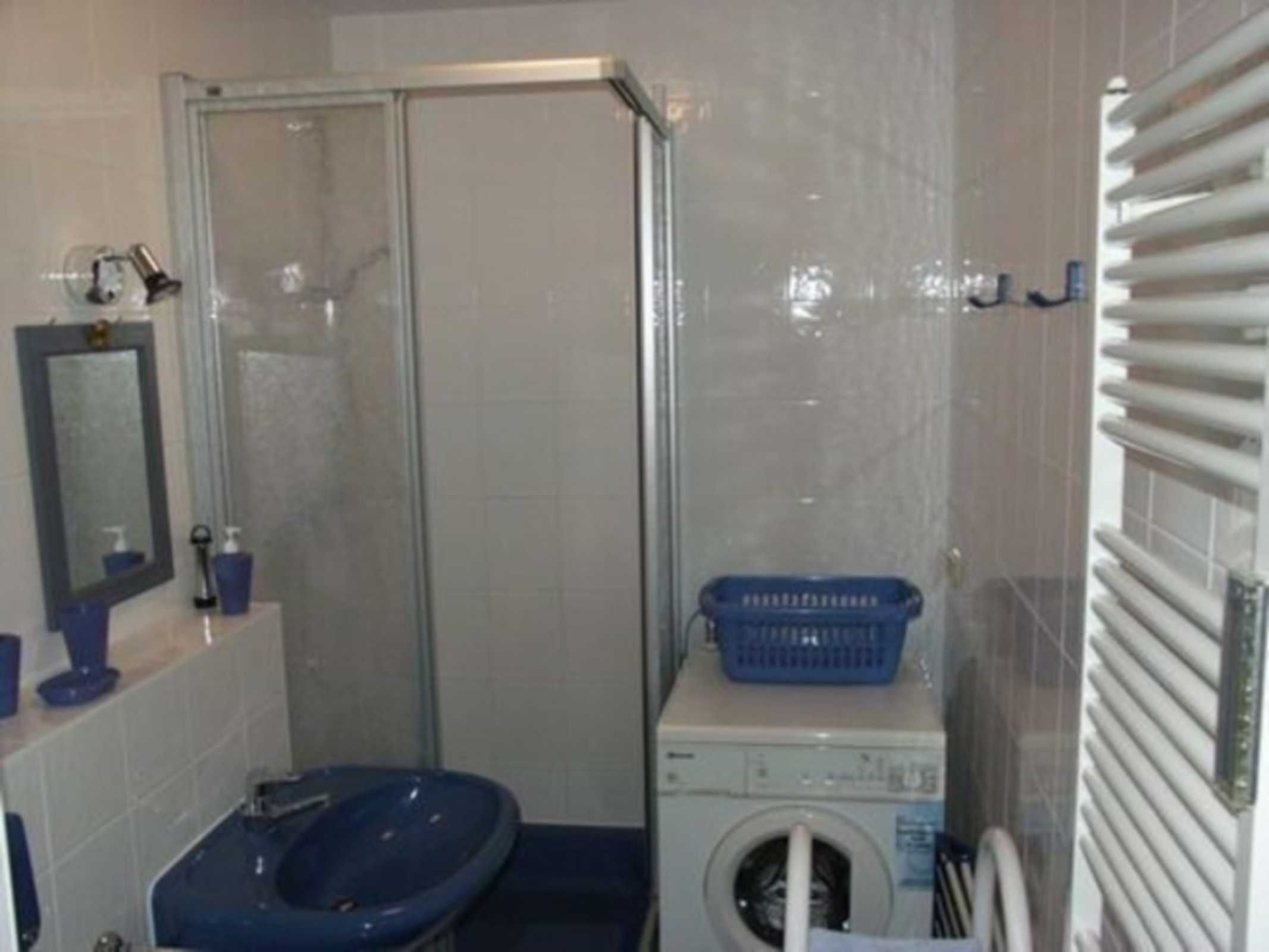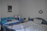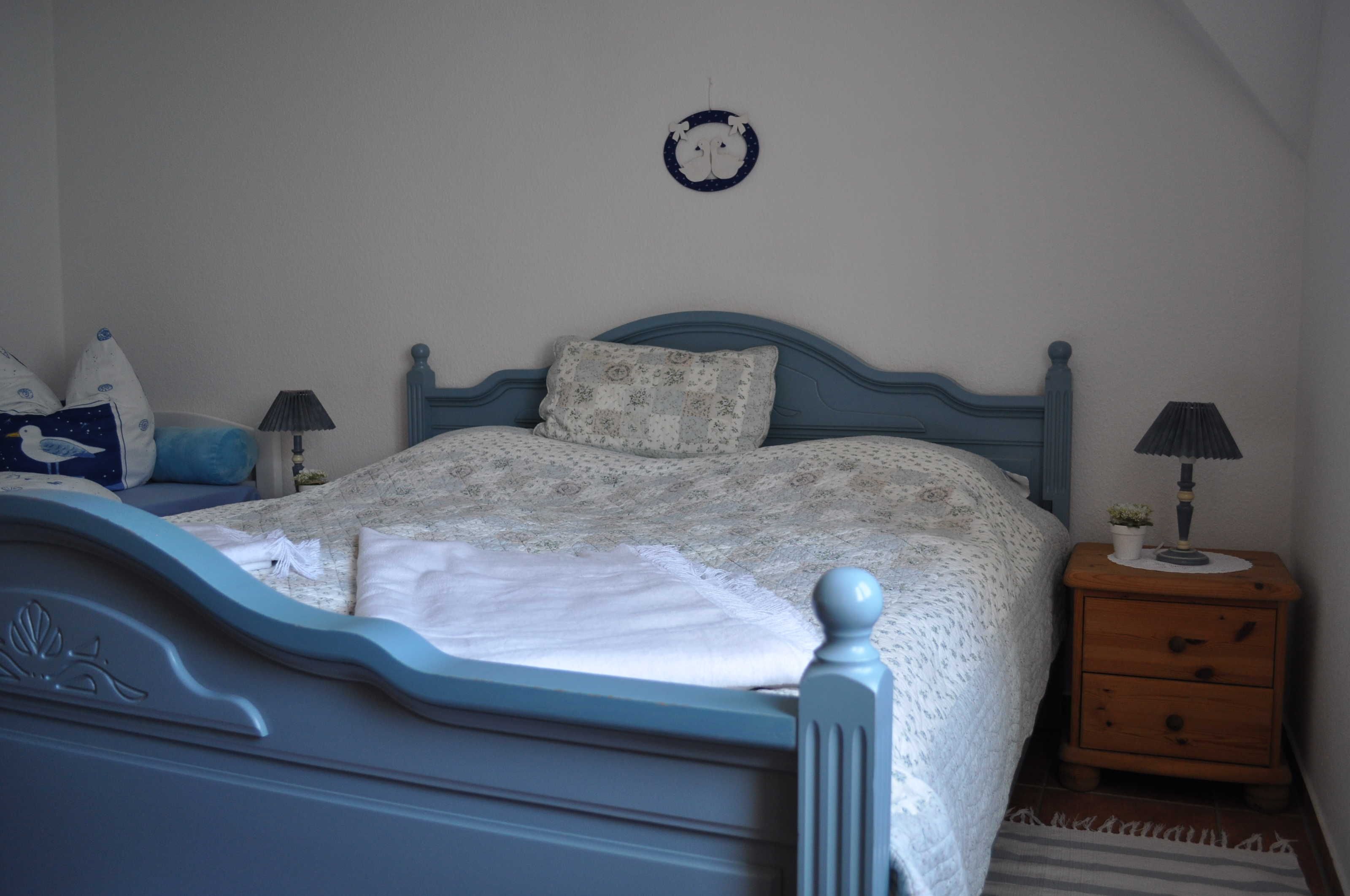 Das Schlafzimmer ist mit einem Doppelbett (180x200 cm) und einem Kinderbett (90x190cm) ausgestattet. Zur Grundausstattung der Wohnung gehört auch eine Waschmaschine im Duschbad. Ein Trockenraum befindet sich im Keller. Ein zweiter im abschließbaren und überdachten Fahrradunterstand.