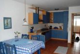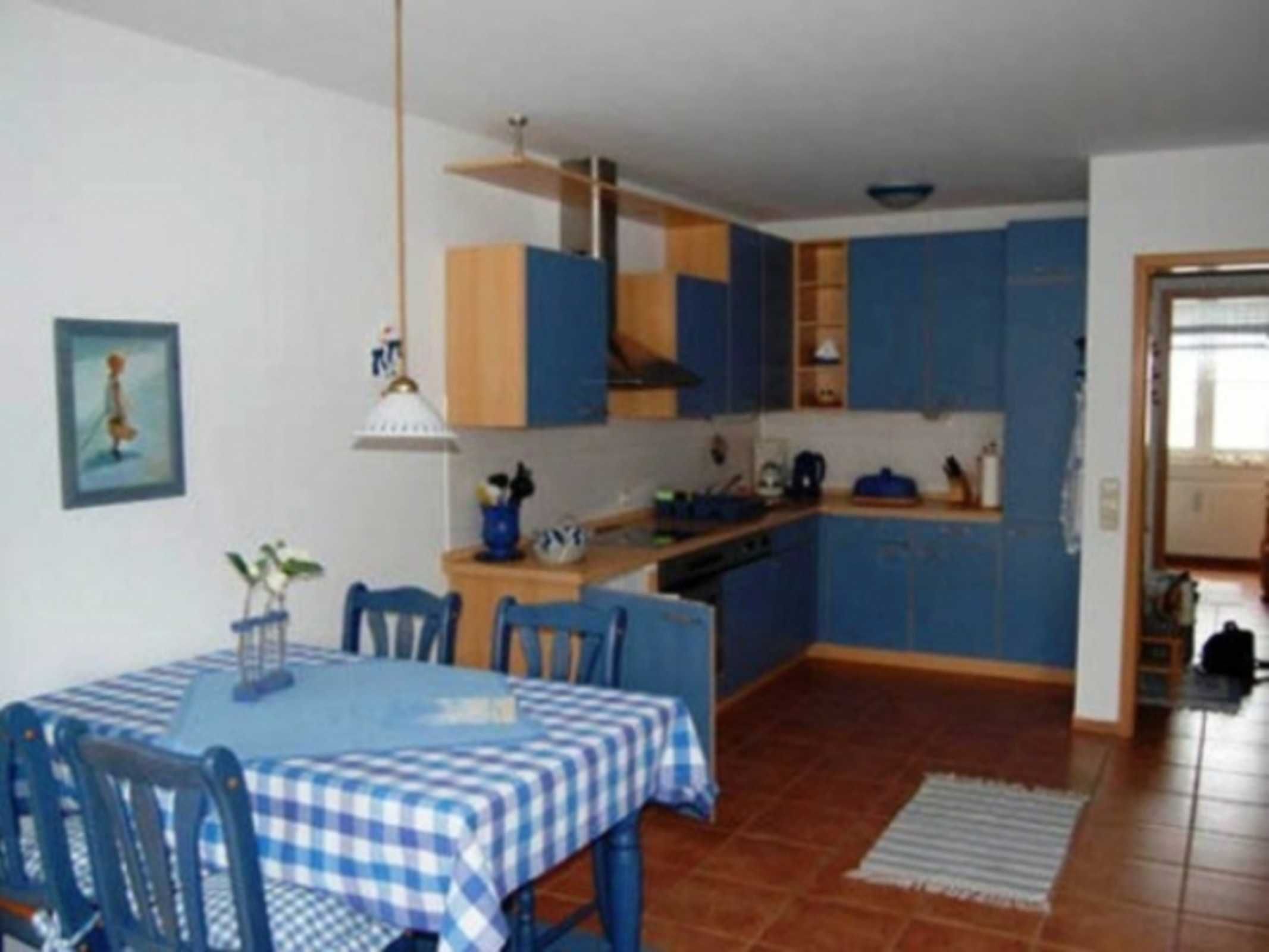 Farblich sind alle Möbelstücke und die Accessoires in der gesamten Wohnung in harmonischen Blautönen und natürlichen braunen Kiefertönen so aufeinander abgestimmt, dass diese Farbstimmung den besonderen Charme der Wohnungseinrichtung ausmacht. Der in einem warmen, hellen, rotbraunen Farbton geflieste Fußboden ist mit Teppichen und Läufern, farblich aufeinander abgestimmt und trägt so zum gemütlichen Ambiente der Wohnung bei.