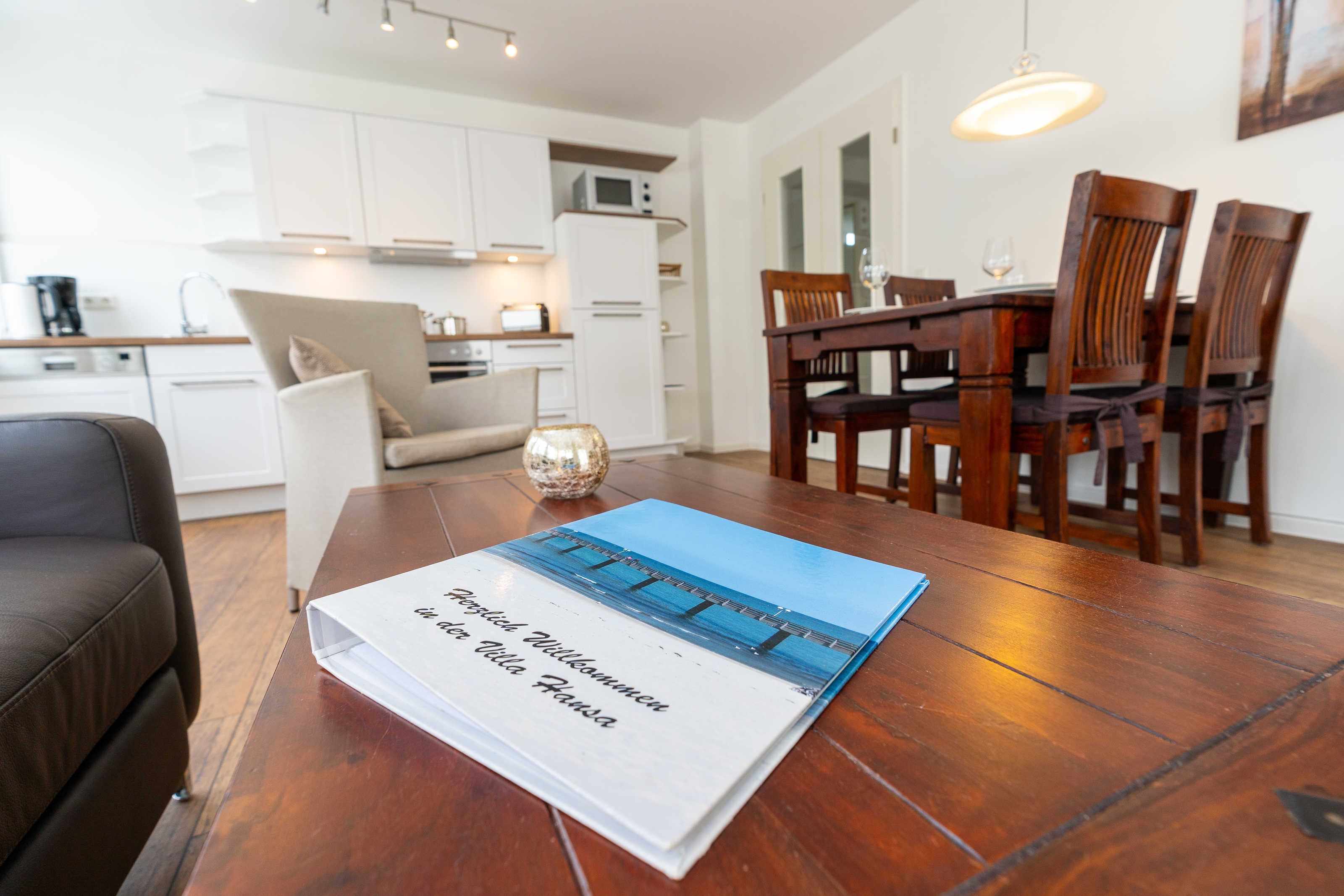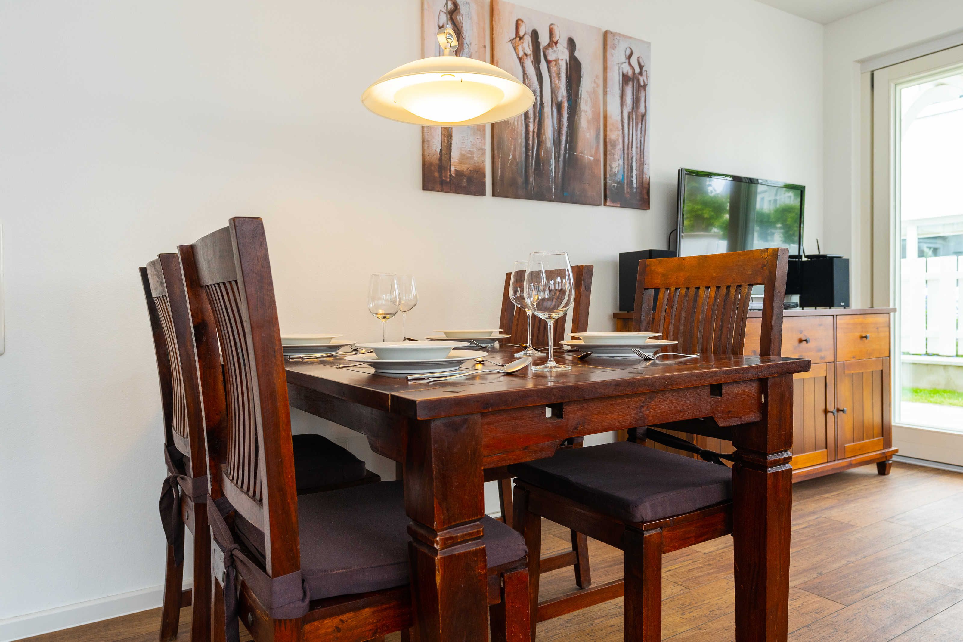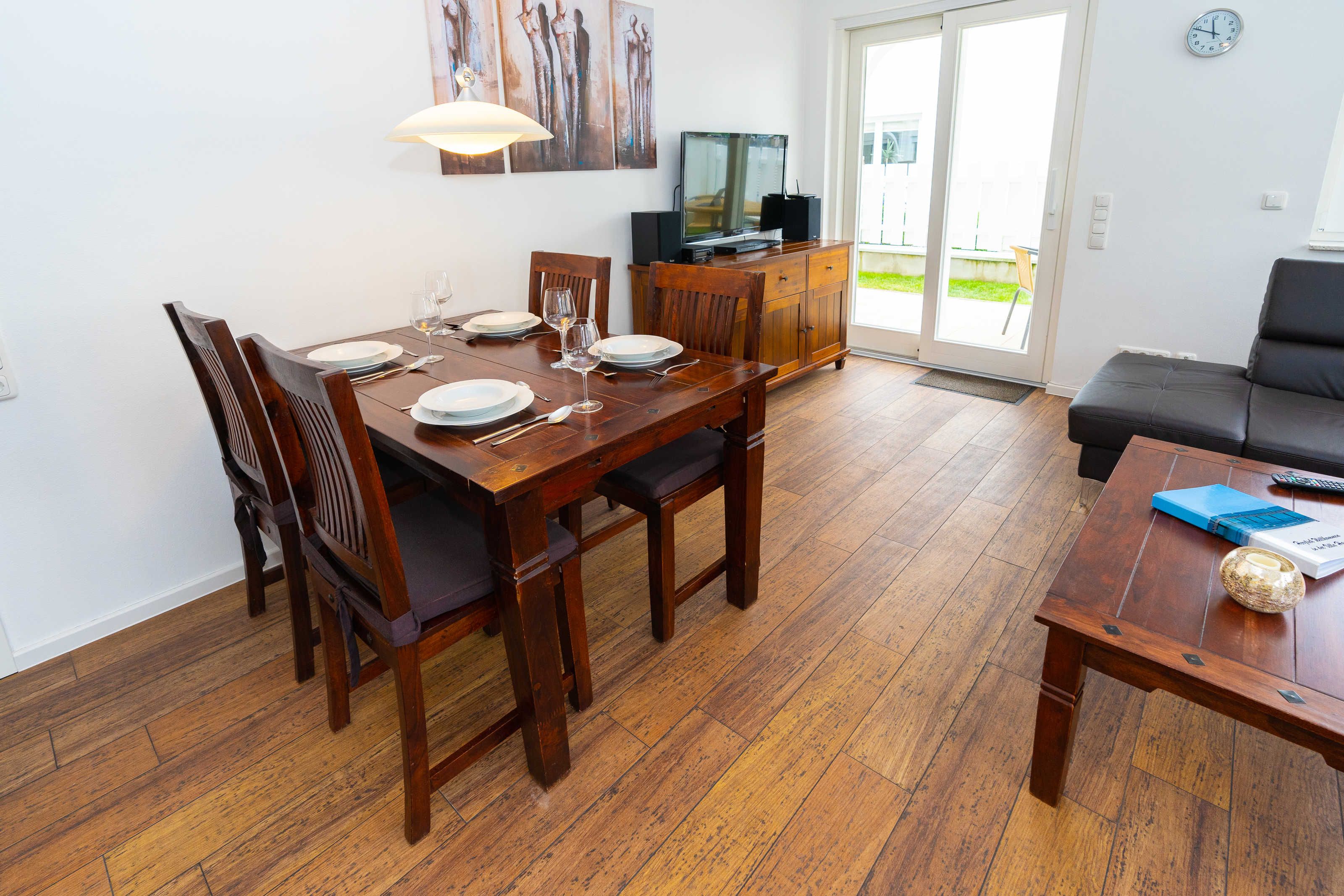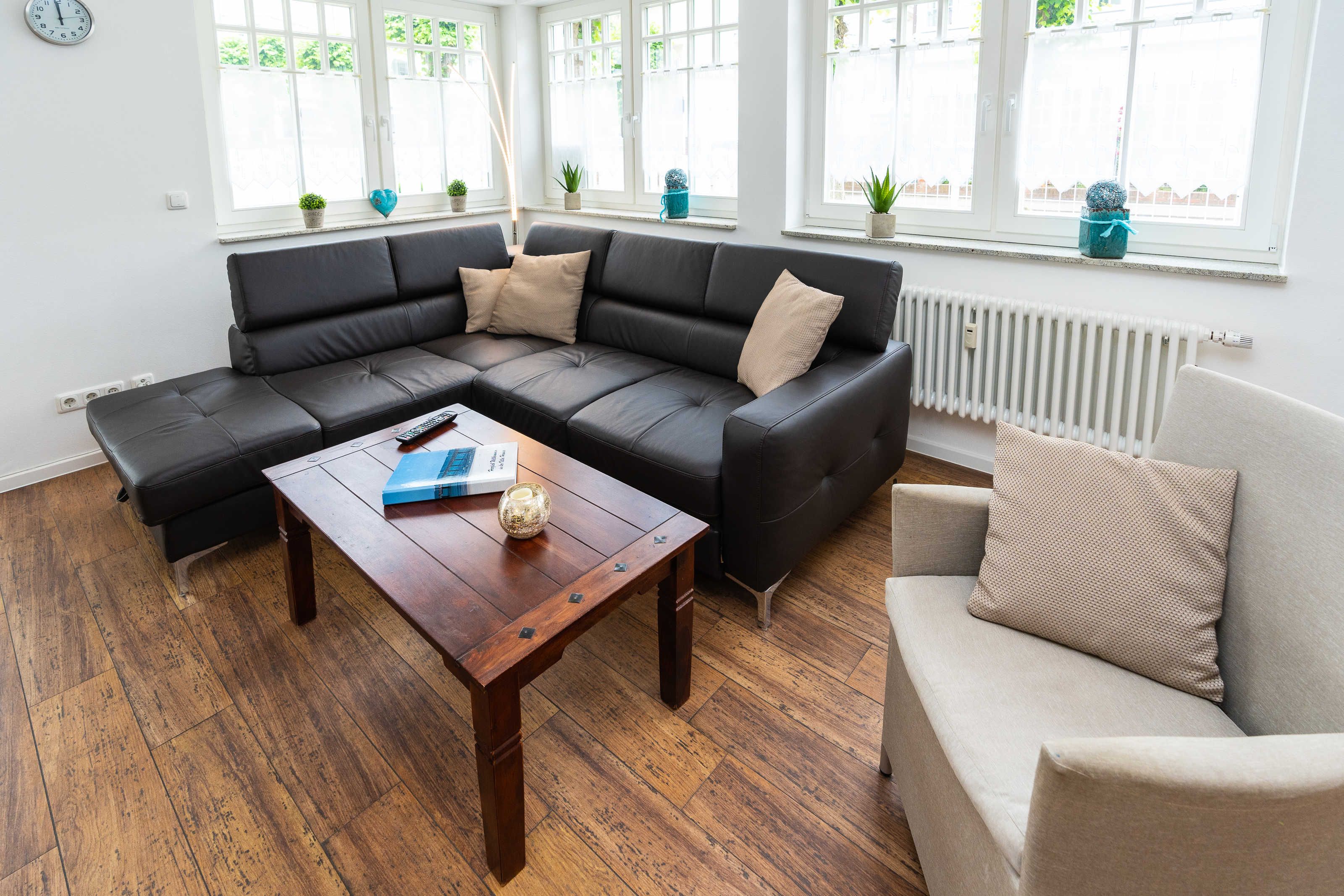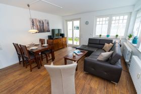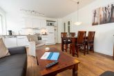 Ein geschmackvoll eingerichtetes Wohnzimmer mit hochwertiger Schlafmöglichkeit sorgt in der Komfort-Ferienwohnung Hansa für Ihre Wohlfühlatmosphäre. Es schließt sich eine nach Süd-Westen ausgerichtete Terrasse an, auf der sich der Sonnenschein fast den ganzen Tag über genießen lässt. Zu der komplett ausgestatteten Küche im Landhausstil gehören ein Kühlschrank mit Gefriermöglichkeit, ein Backofen, eine Mikrowelle und ein Geschirrspüler. Zwei gemütliche Schlafzimmer sind mit je einem Boxspring-Doppelbett eingerichtet. Des Weiteren gehören zwei gepflegte Duschbäder zur Ferienwohnung.