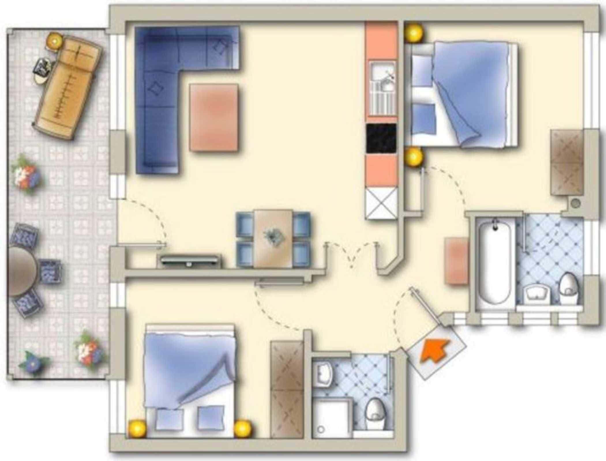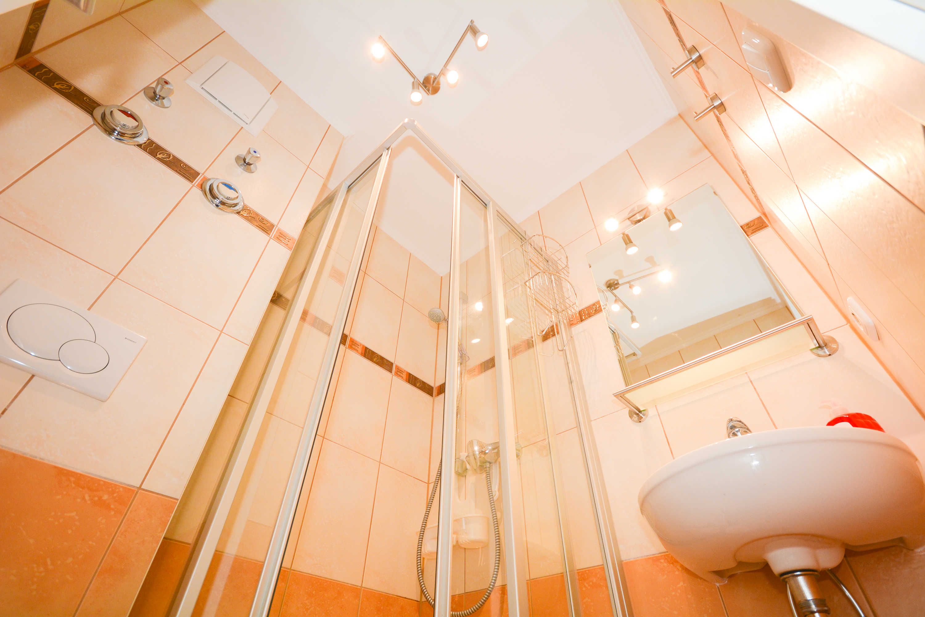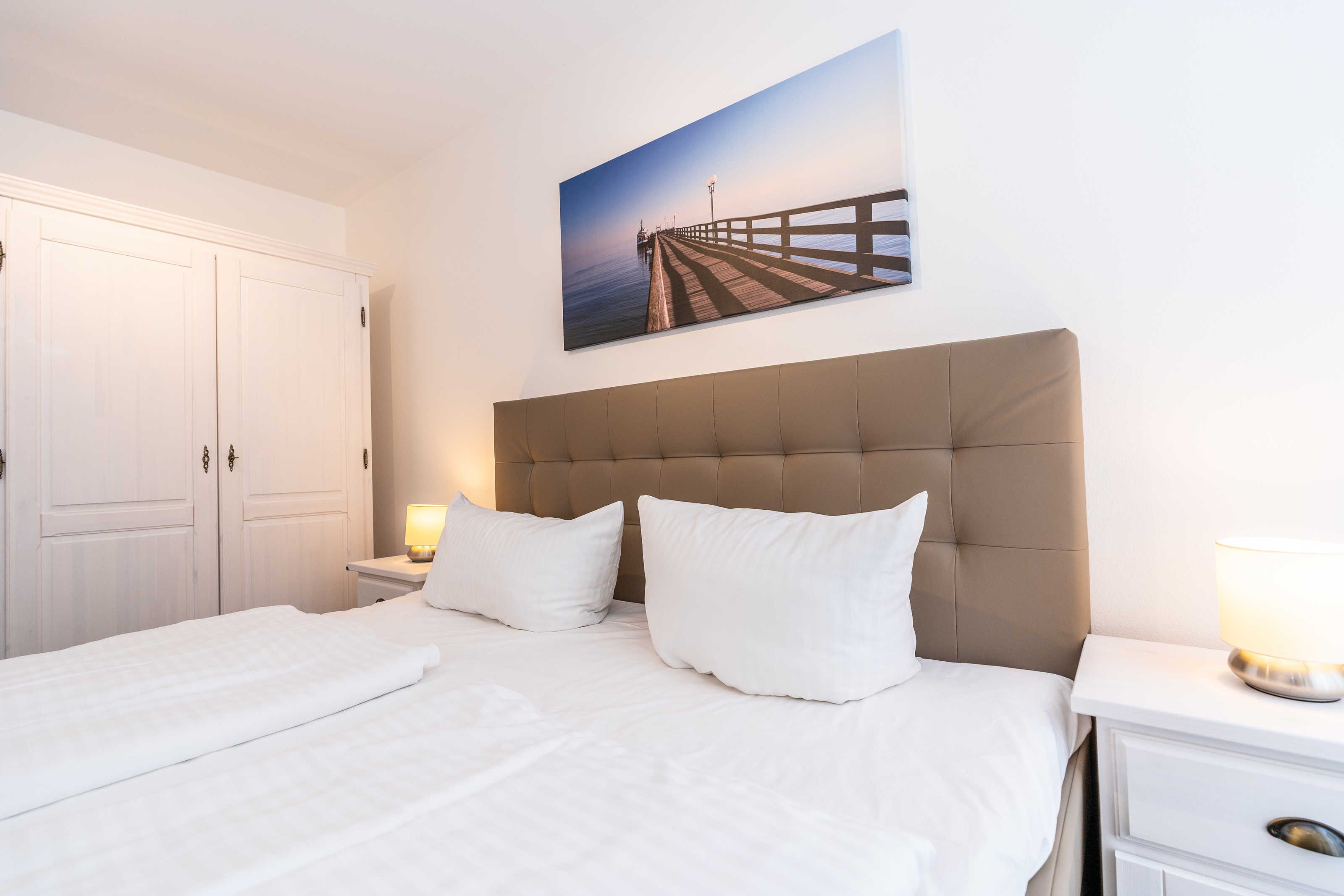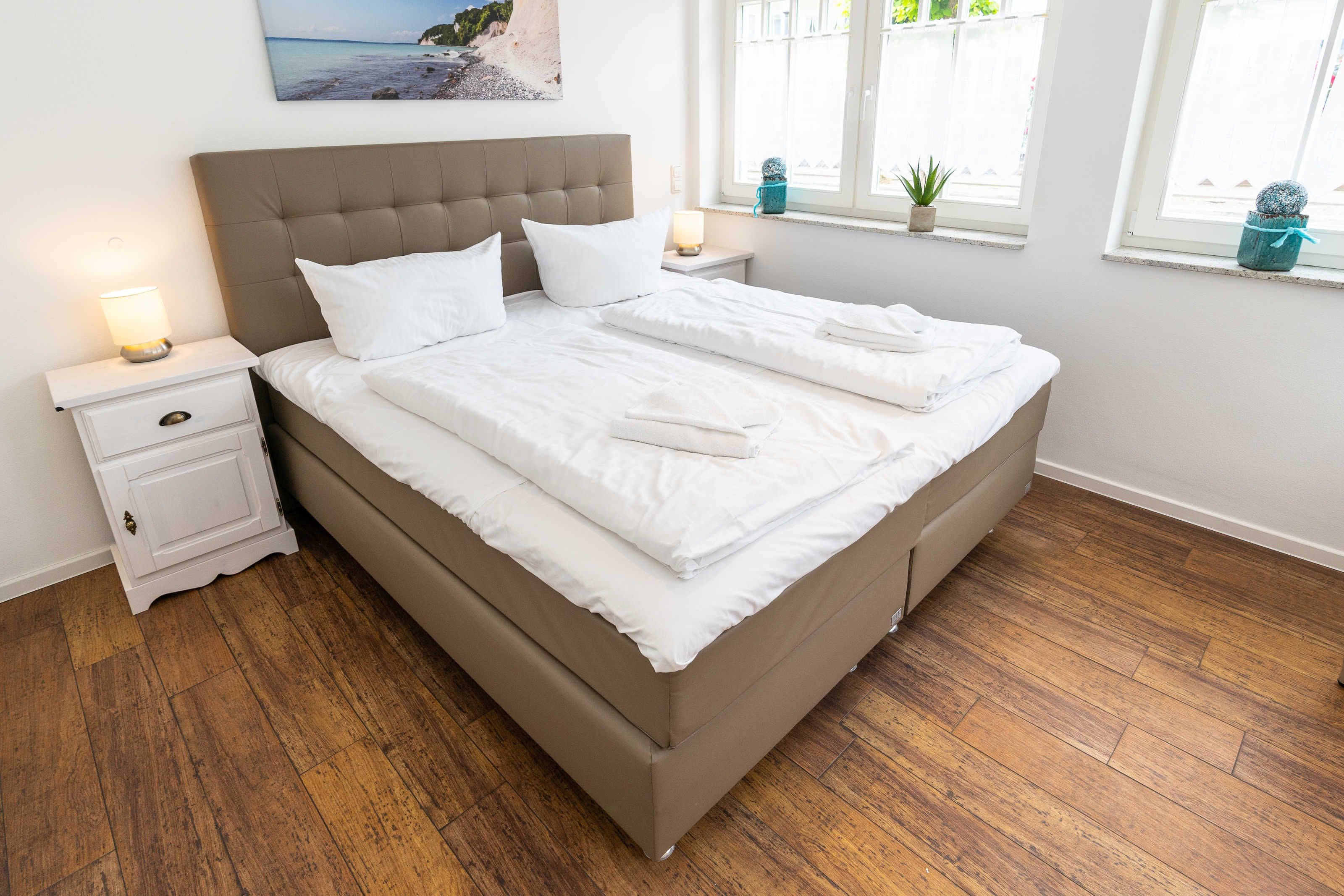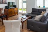 Ein geschmackvoll eingerichtetes Wohnzimmer mit hochwertiger Schlafmöglichkeit sorgt in der Komfort-Ferienwohnung Hansa für Ihre Wohlfühlatmosphäre. Es schließt sich eine nach Süd-Westen ausgerichtete Terrasse an, auf der sich der Sonnenschein fast den ganzen Tag über genießen lässt. Zu der komplett ausgestatteten Küche im Landhausstil gehören ein Kühlschrank mit Gefriermöglichkeit, ein Backofen, eine Mikrowelle und ein Geschirrspüler. Zwei gemütliche Schlafzimmer sind mit je einem Boxspring-Doppelbett eingerichtet. Des Weiteren gehören zwei gepflegte Duschbäder zur Ferienwohnung.