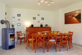 Das Ferienhaus verfügt über insgesamt 3 Schlafzimmer (2 x à 1,80 x 2,00 m und 1 x 1,60 x 2,00 m) die für jeweils 2 Personen ausgelegt sind. Zwei der Schlafräume verfügen zusätzlich über ein ausziehbares Rollbett/Einzelbett (ebenfalls mit Lattenrost und Matratzen) für die jeweilige 7. und 8. Person (Liegefläche 0,70 x 1,80 m). Auf der gemütlichen Couch im Wohnzimmer kann man das Kaminfeuer am besten genießen; TV und Stereoanlage sind vorhanden. Eine offene voll ausgestattete Küche mit Herd, Backofen, Dunstabzugshaube, Geschirrspüler, Mikrowelle, Kaffeeemaschine und Wasserkocher lässt keine Wünsche offen. Das Haus verfügt ausserdem über 2 Bäder mit Dusche und WC. Babybett und Hochstuhl sind ebenfalls vorhanden.