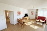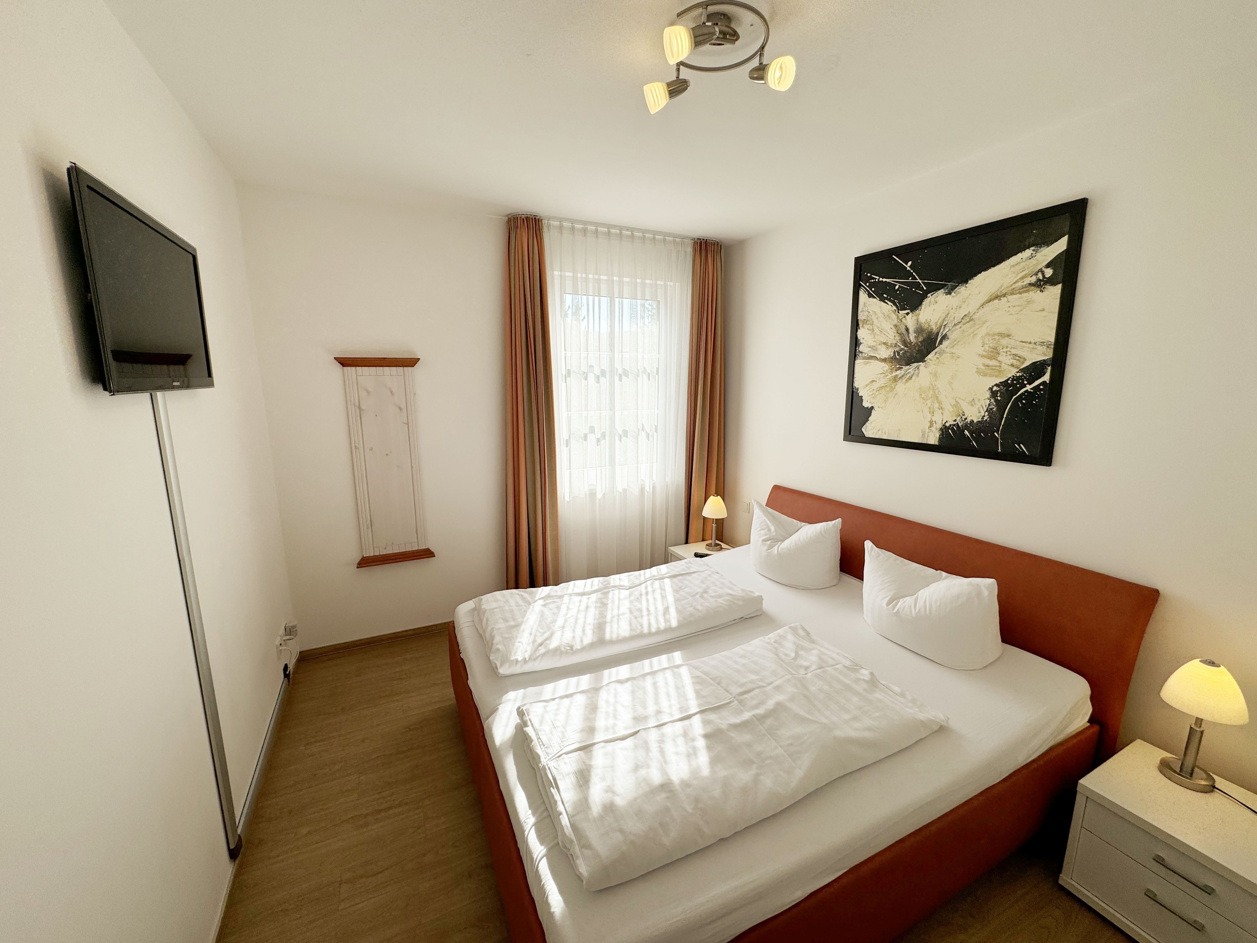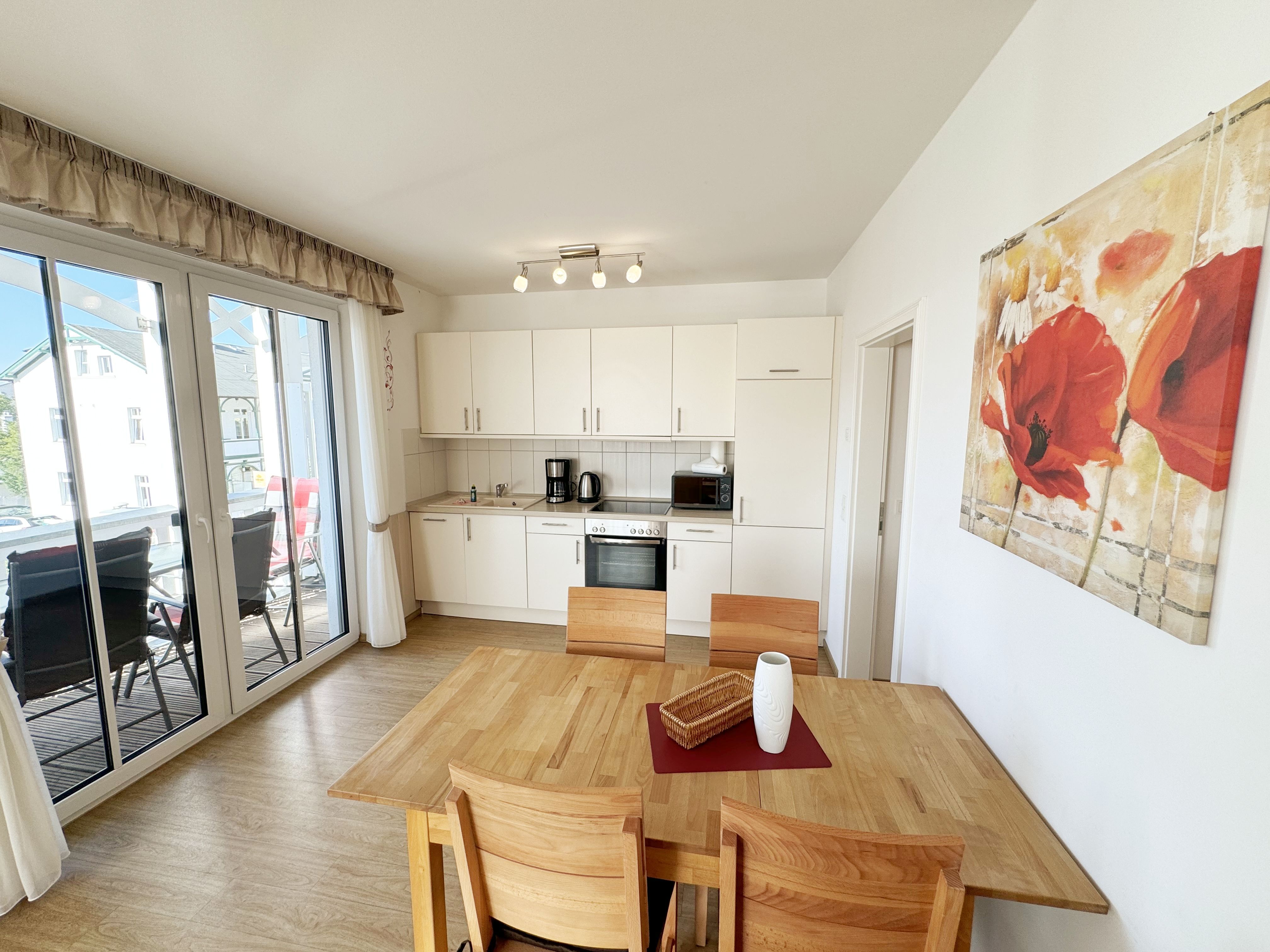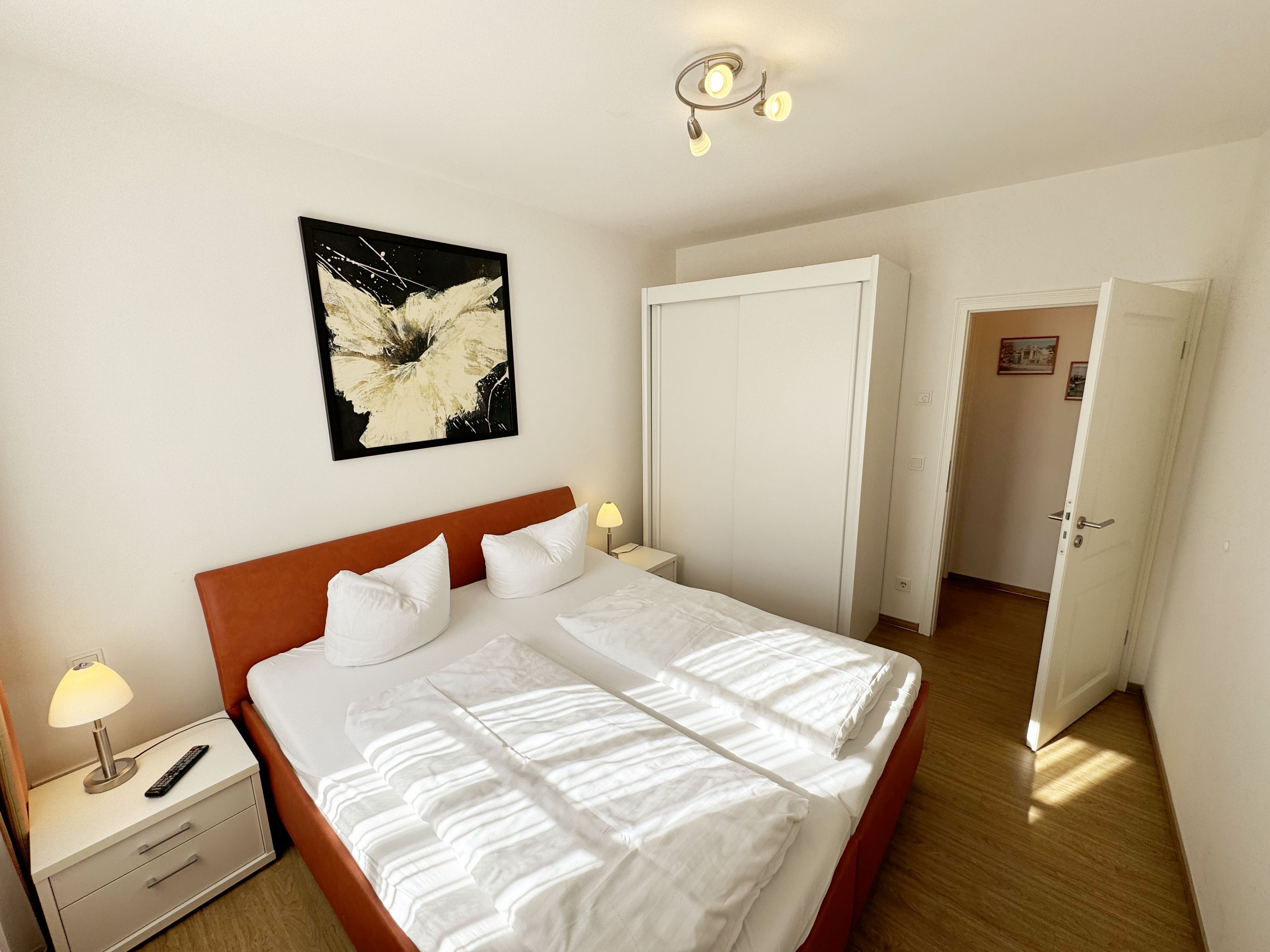 Die gemütlich eingerichtete 3-Raumwohnung Nr. 06 (Nichtraucherwohnung) in der Villa Annika befindet sich in der 1. Etage. Mit Ihren ca. 66 qm bietet Sie Ihnen ausreichend Platz für max. 2 bis 4 Personen. Vom Flurbereich erreichen Sie alle Räumlichkeiten. Der Wohnbereich ist mit einem 2 x 2-Sitzer Couch, einer Leselampe, einem Sideboard mit LCD-TV, WLAN-Zugang, einem DAB-Radio und einer Küchenzeile ausgestattet. Die Küchenzeile ist komplett ausgestattet und beinhaltet ein Cerankochfeld, einen Backofen, einen Geschirrspüler, eine Mikrowelle, einen Kühlschrank mit Gefrierfach, einer Kaffeemaschine, einem Toaster, einem Wasserkocher sowie diversen Küchenutensilien. Angrenzend befindet sich der Essplatz. Vom Wohnbereich gelangen Sie auf Ihren bestuhlten Balkon (Süd/West). Das Tageslicht-Bad verfügt über eine Dusche mit flachem Einstieg, ein WC, einen Waschplatz, Ablageregal, einem Handtuchtrockner, einem beleuchteten Kosmetikspiegel, Insektenschutzgitter und einem Fön. Ein Gäste-WC mit Waschbecken rundet den Sanitärbereich ab. Die beiden Schlafzimmer bestehen jeweils aus einem Doppelbett (2 x 0,90m x 2,00m), verstellbaren Lattenrosten, Nachttischablagen und Beleuchtung, einer Kleiderablage, einem Kleiderschrank sowie Insektenschutzgitter. Eines der Schlafzimmer verfügt zusätzlich über einen TV. In allen Räumen sorgt eine Fußbodenheizung für angenehme Wärme. Im kleinen Abstellraum befinden sich Reinigungsutensilien, ein Wäscheständer mit Wäscheklammern sowie ein Staubsauger. Ein eigener PKW-Stellplatz (Nr.06) ist für Sie in der hauseigenen Tiefgarage (Einfahrtshöhe 1,90m) vorhanden, sowie eine Fahrradabstellmöglichkeit auf dem Grundstück. 1 gut erzogenes Haustier ist gegen eine Gebühr in der Wohnung ein gern gesehener Gast. Die Erstausstattung eines Wäschepaketes (komplette Bettwäsche, 1 Duschhandtuch, 1 kleines Handtuch) können Sie bis 14 Tage vor Anreise gegen einen Aufpreis dazu buchen oder durch eigene ergänzen. Ab 2 gebuchten Paketen erhalten Sie einmalig 1 Geschirrhandtuch und 1 Duschvorleger hinzu.