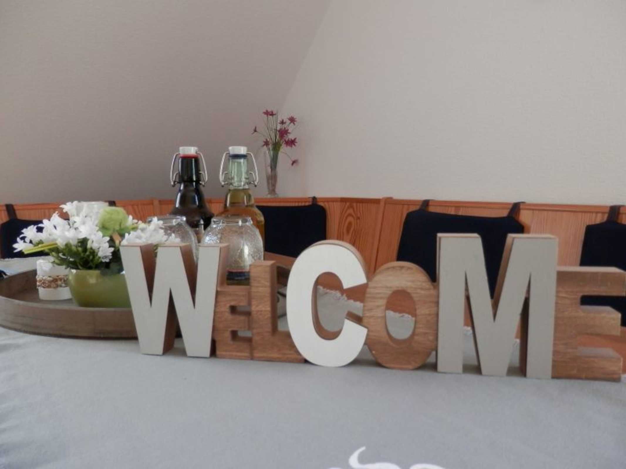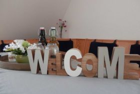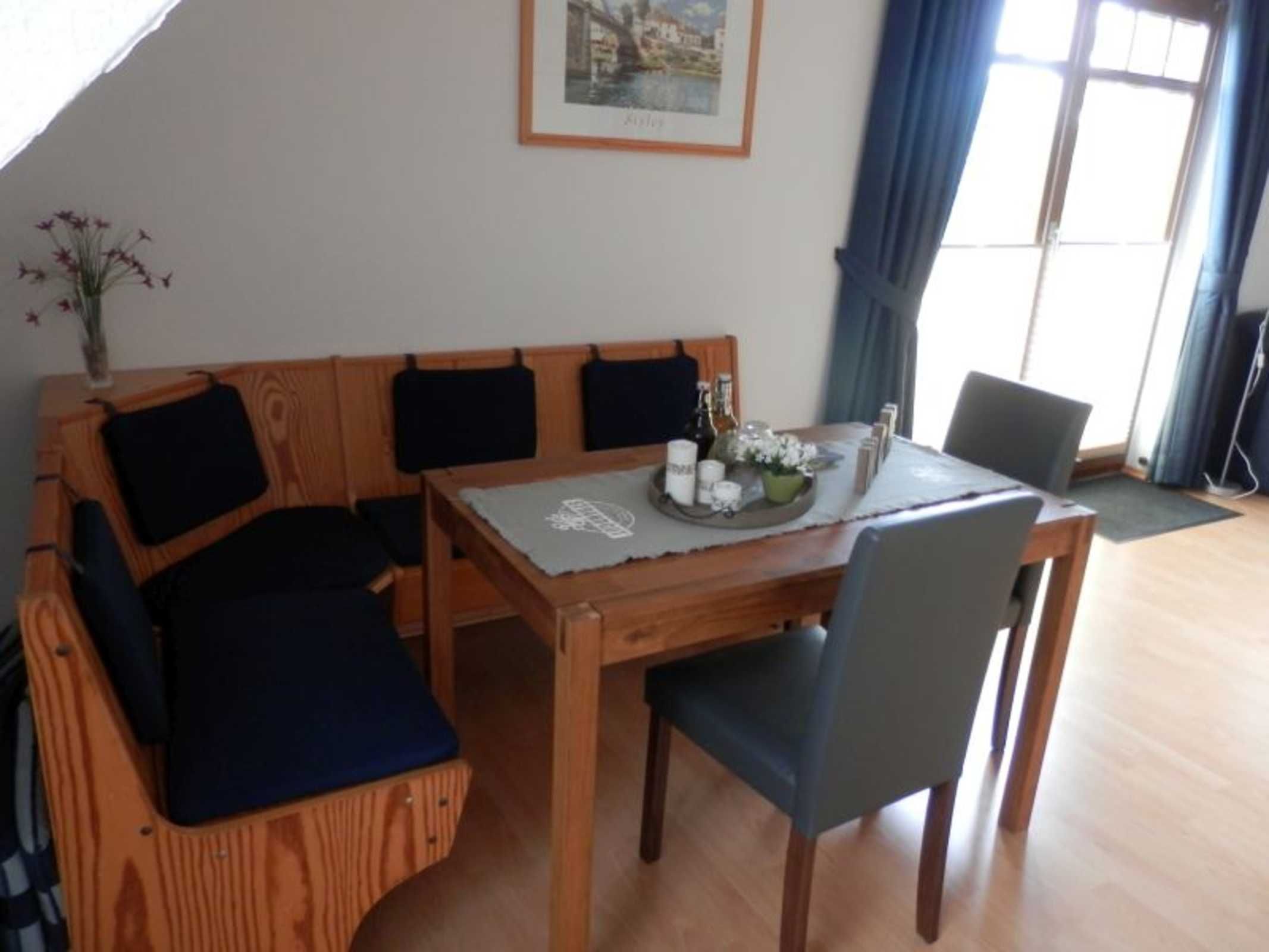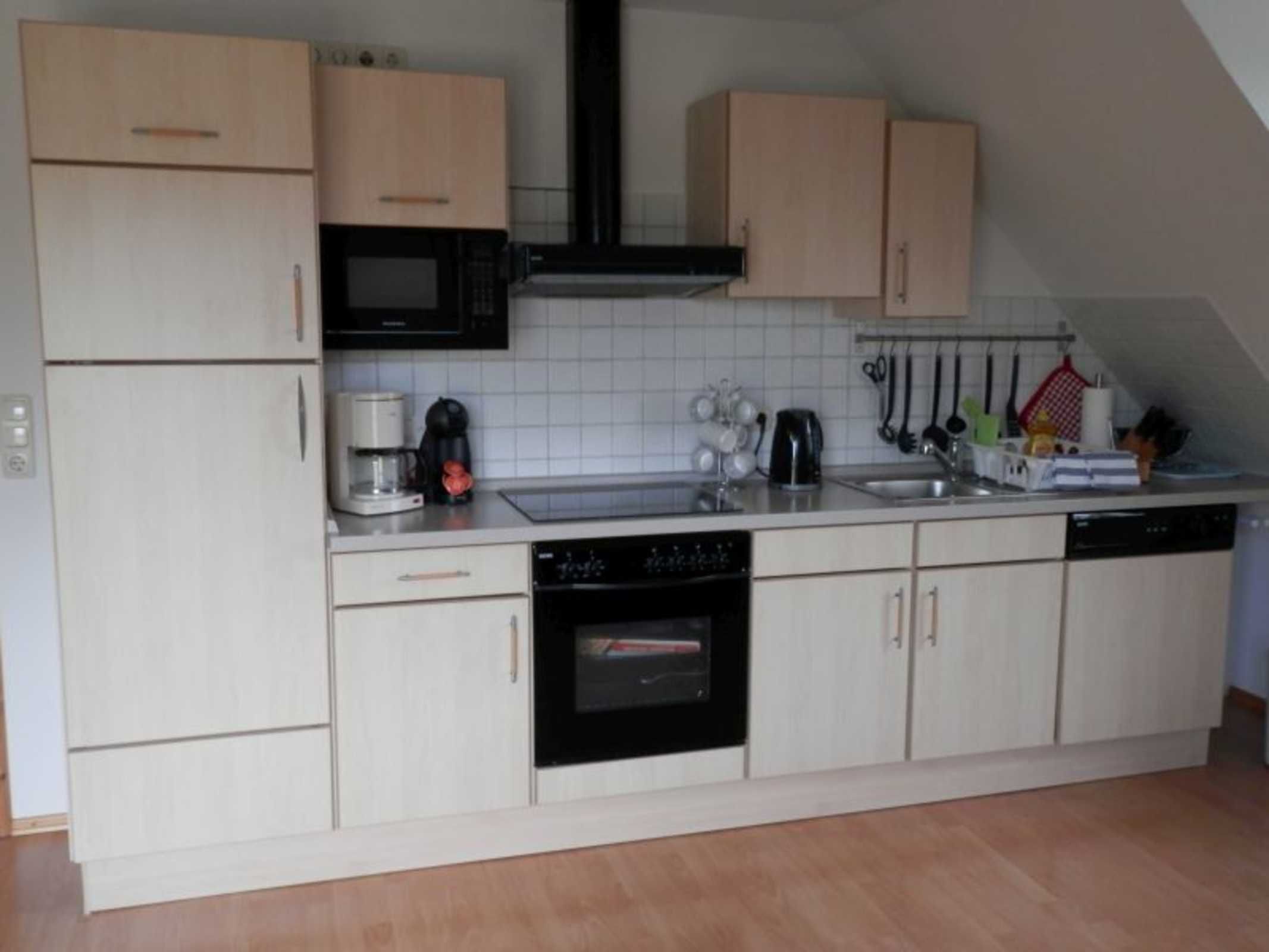 Unsere Ferienwohnung befindet sich auf der 1. Etage und besteht aus einem großen hellen Wohnraum, ausgestattet mit Sitzecke, Wohnzimmertisch, Flat-TV und Stereoanlage, einer Küche mit Essecke, die u.a. mit Geschirrspüler, Mikrowelle und Backofen ausgestattet ist.