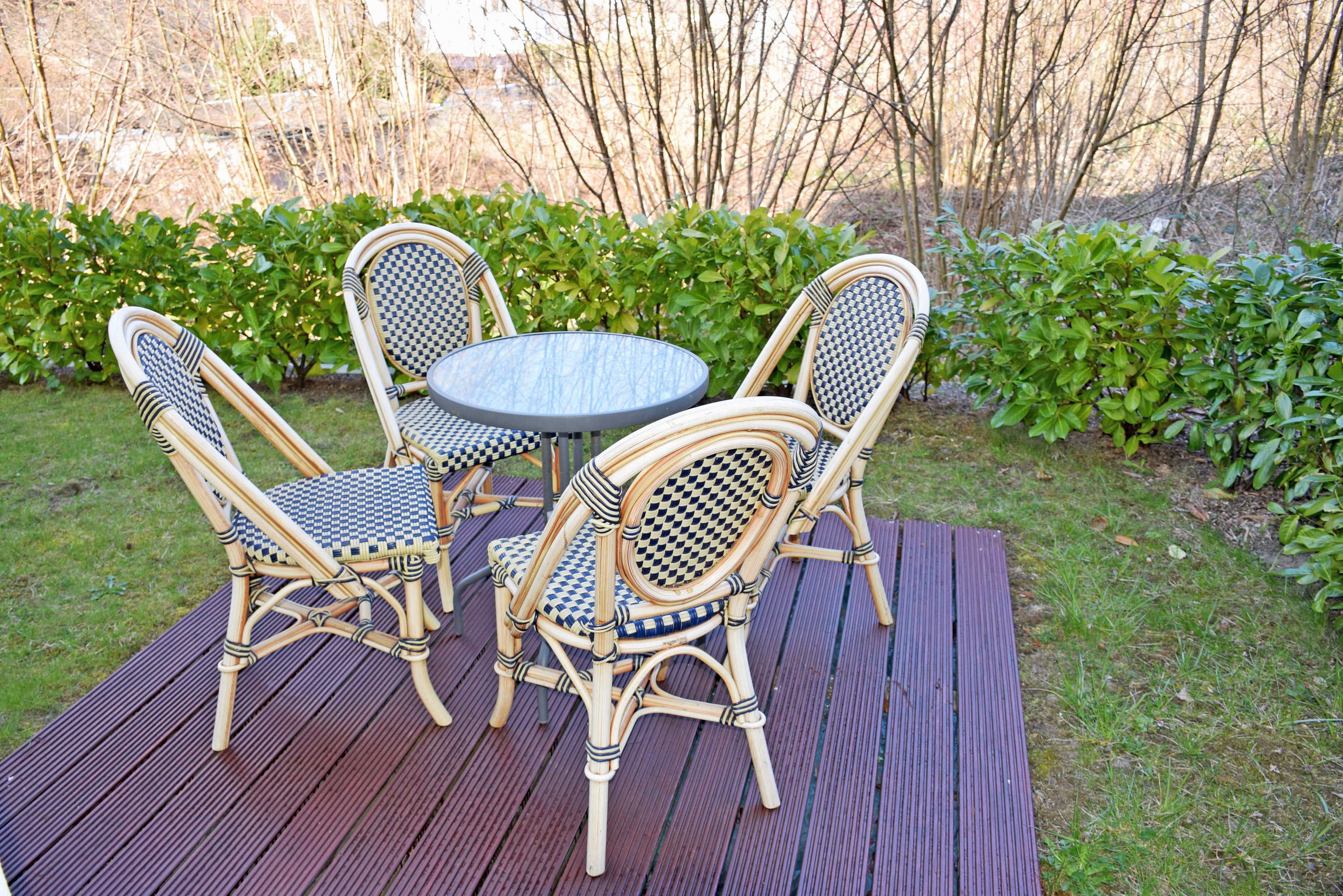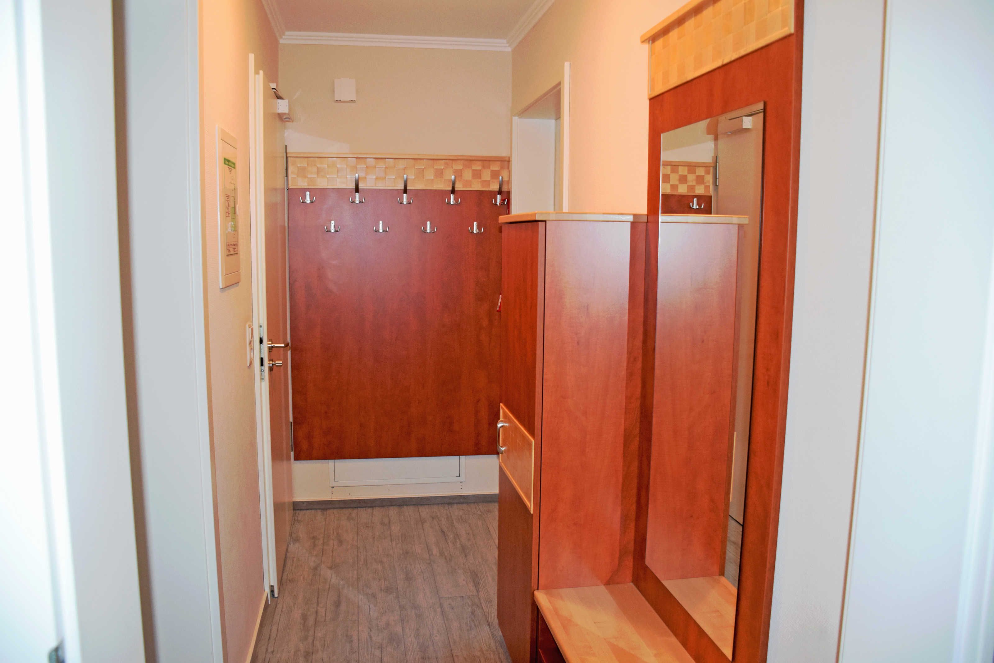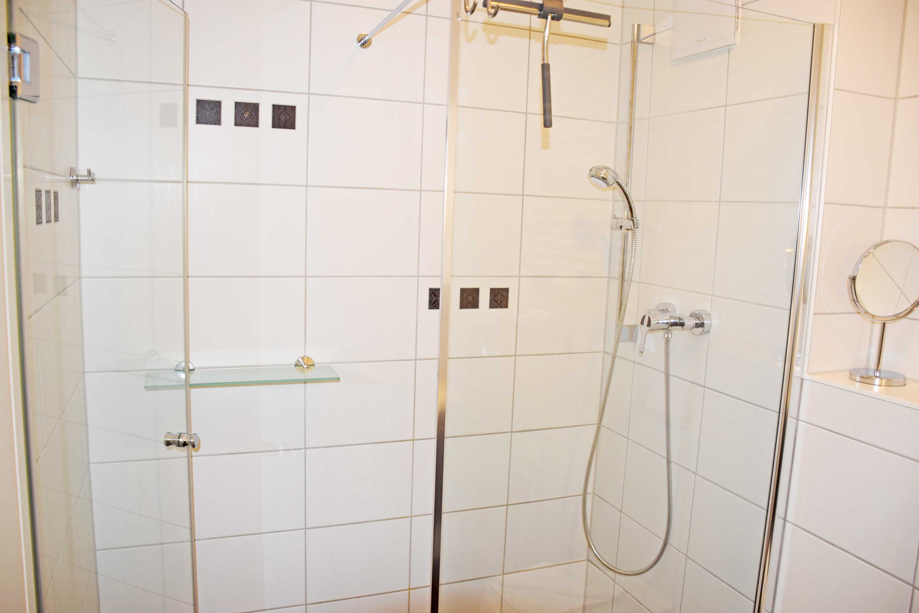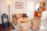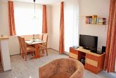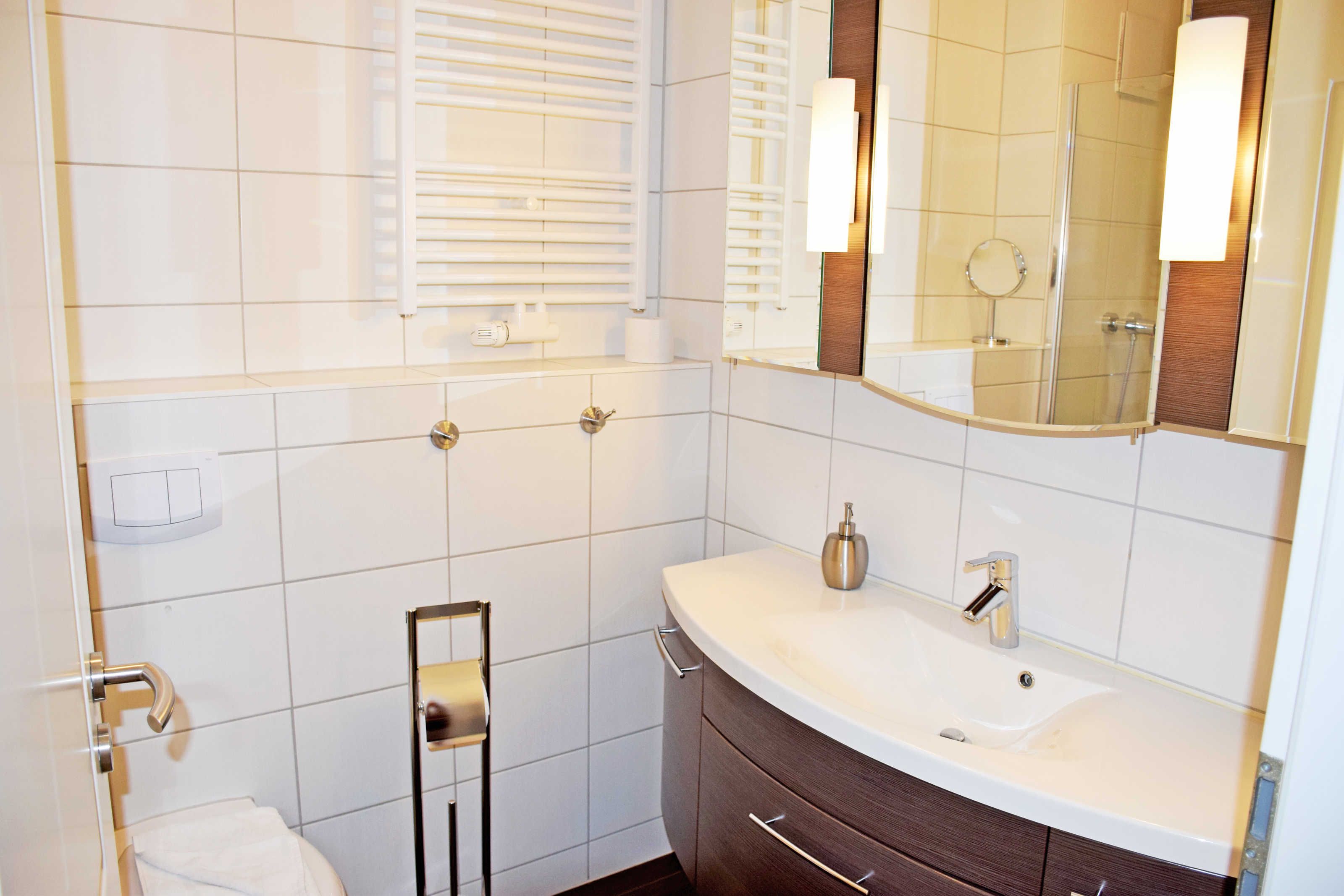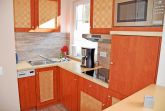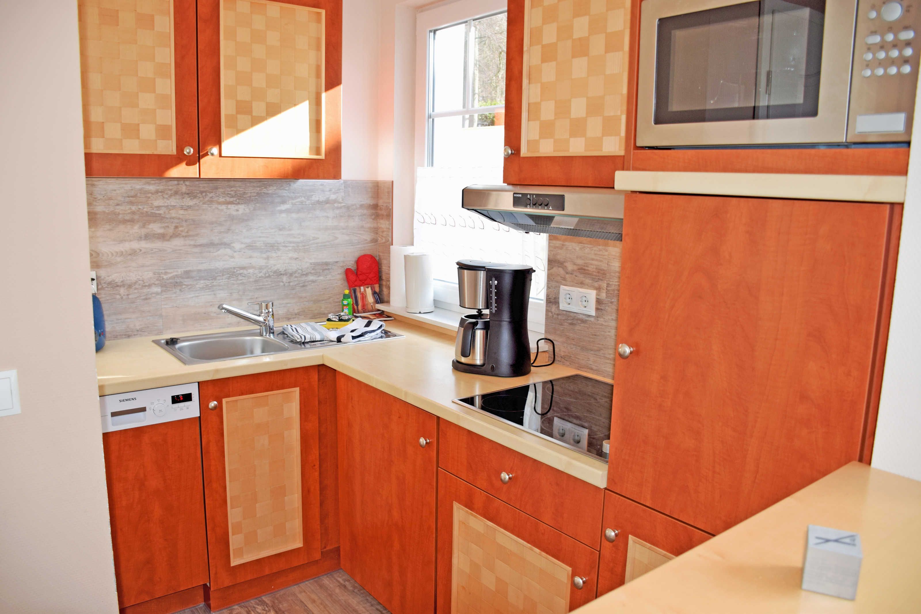 Die Küchenzeile neben dem Wohnzimmer ist mit einem Herd, Ablufthaube, Geschirrspüler, Wasserkocher, Kaffeemaschine, Toaster, Mikrowelle mit Grillfunktion und Kühlschrank komplett ausgestattet. Das moderne Bad verfügt über einen Waschtisch mit Spiegelschrank, Dusche, WC einem Handtuchtrockner sowie einem Haartrockner. Zu diesem Appartement gehört auch ein Balkon mit Gartenmöbeln.In unserem Haus befindet sich ebenfalls ein zusätzlicher Raum für alle Wohneinheiten mit Waschmaschine, Wäschetrockner (Münzautomat) sowie einer Bügeleinrichtung.