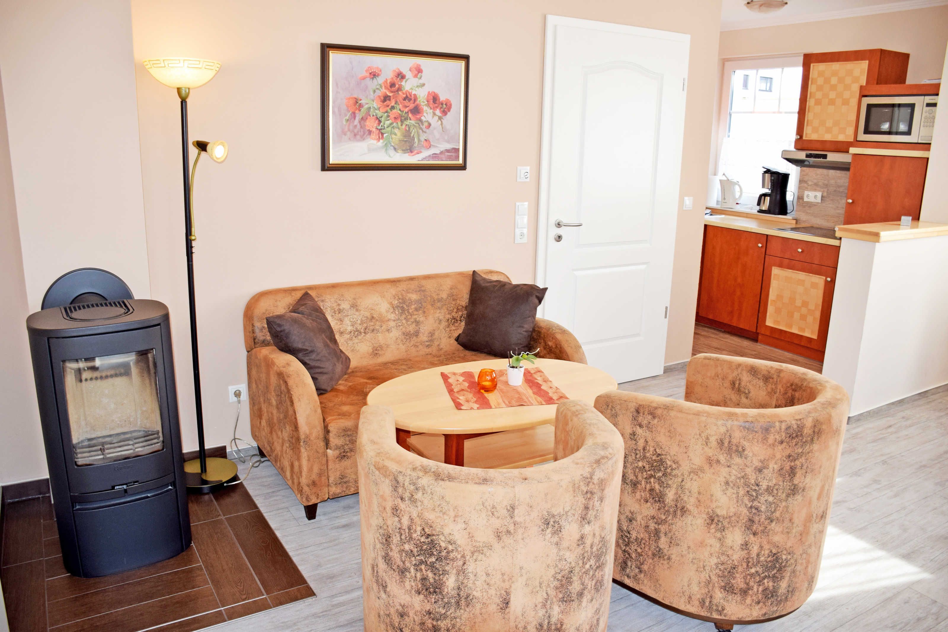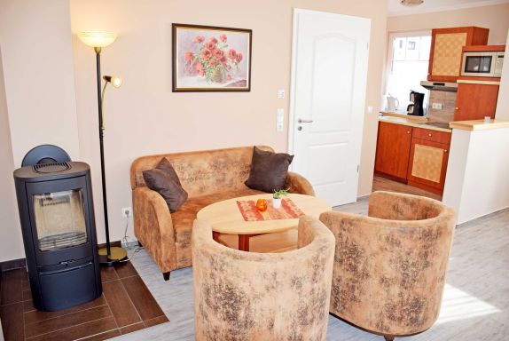 Unsere im ersten bzw. zweiten Obergeschoss befindlichen Ferienappartements Mönchgut sind ca. 60 qm groß, bieten Platz für maximal 4 Gäste. Diese wurden sehr liebevoll, modern und komfortabel eingerichtet. Gäste in diesem Appartement können natürlich kostenlos einen Internetanschluss nutzen. Über einen separaten Eingang und einem Flur mit Garderobe gelangt man in den Wohnraum. Hier befinden sich eine Sitzcouch mit Tisch und Sessel, einem Schrank mit TV / Gerät sowie einem Esstisch mit Sitzgelegenheiten. Ein Kamin im Wohnbereich sorgt in den Abendstunden für ein besinnliches Ausklingen des Tages. Diese Wohnung sorgt gerade auch in den Herbst und Wintermonaten für eine gemütliche Atmosphäre.