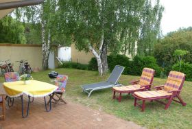 Sehr heller und großzügiger Wohn- und Essbereich mit moderner echter Ledergarnitur mit Recamiere (Aufbettung für die 5. und 6. Person im Wohnzimmer möglich) und moderner Essbereich mit Stühlen aus echtem Leder. Ein großer 48 Fernseher sorgt für ein tolles Bilderlebnis. Moderne Küche mit Ceran-Kochfeld, Geschirrspüler, Mikrowelle, u. a. Chices Schlafzimmer mit Doppelbett, teilw. aus hellem Massivholz, mit Fernseher. Modernes zweites Schlafzimmer mit Doppelbett in blauem Design. Bad mit Dusche und WC, exklusiver Natursteinboden in allen Räumen, möblierte Terrasse (60 m²) nach Süden und Westen orientiert. Der Garten ist mit vielen Pflanzen und kleinen Bäumen liebevoll angelegt - ideal zur Erholung. Abends schaltet sich im Garten eine stimmungsvolle LED-Beleuchtung ein. Ein Paradies für Naturliebhaber.
