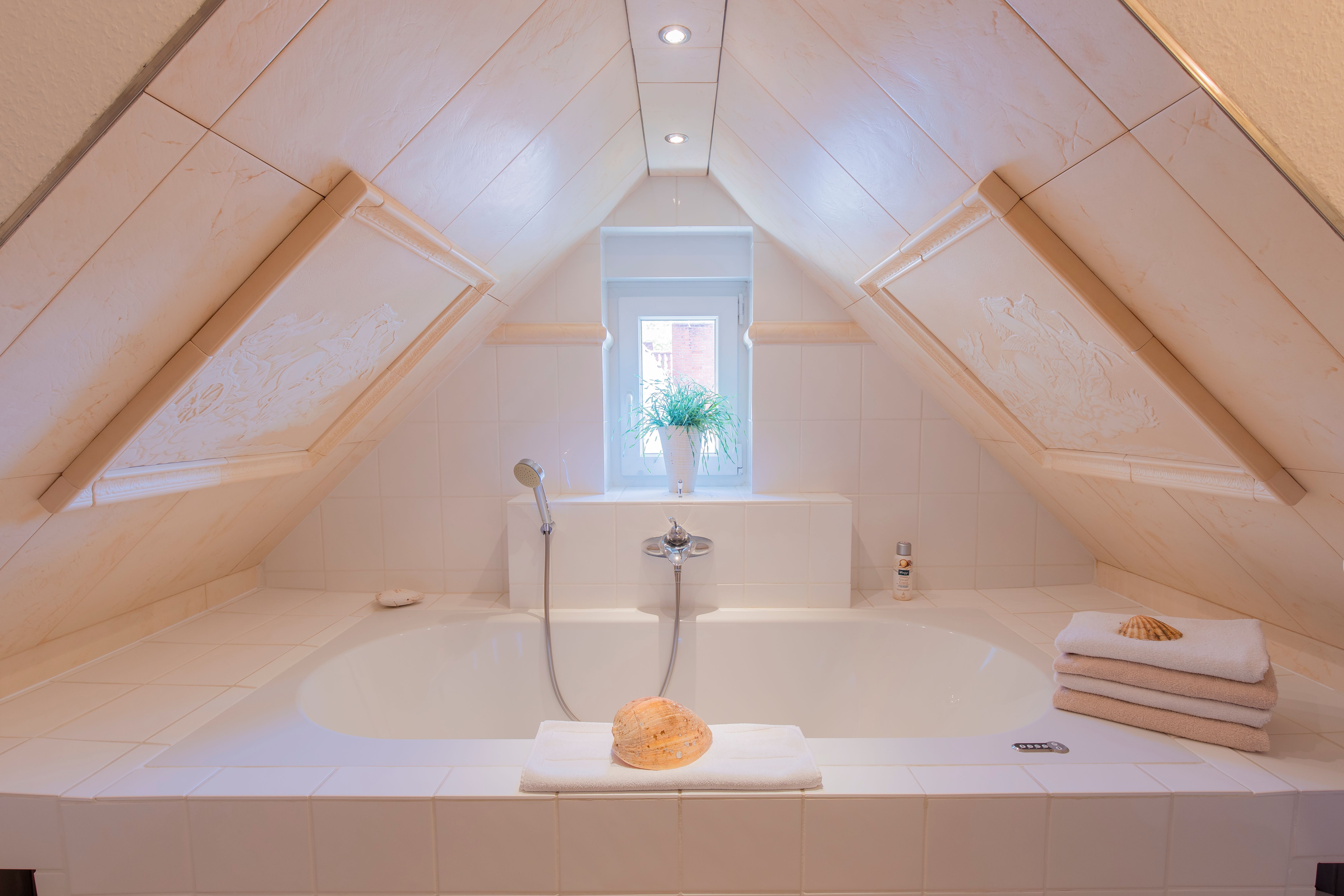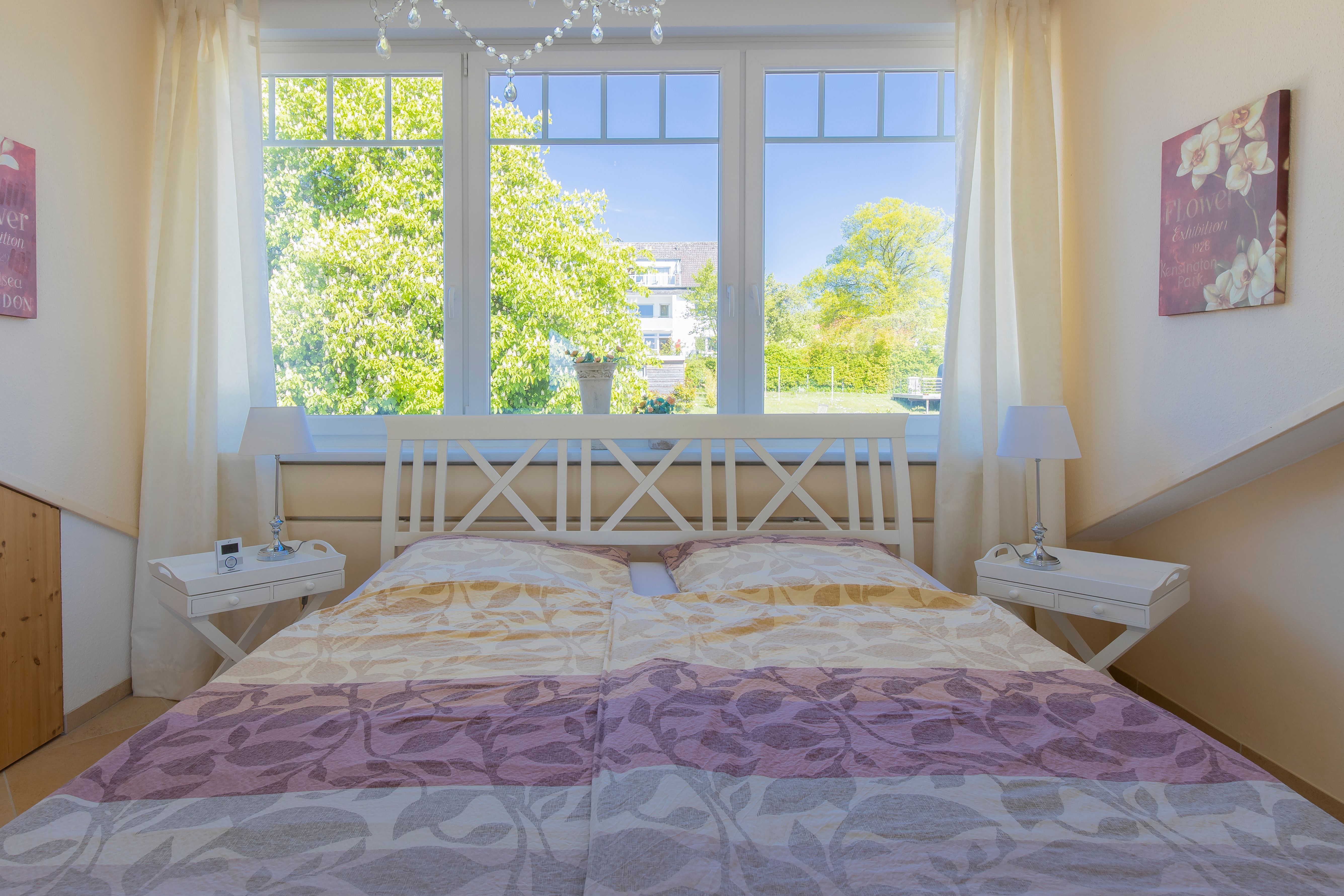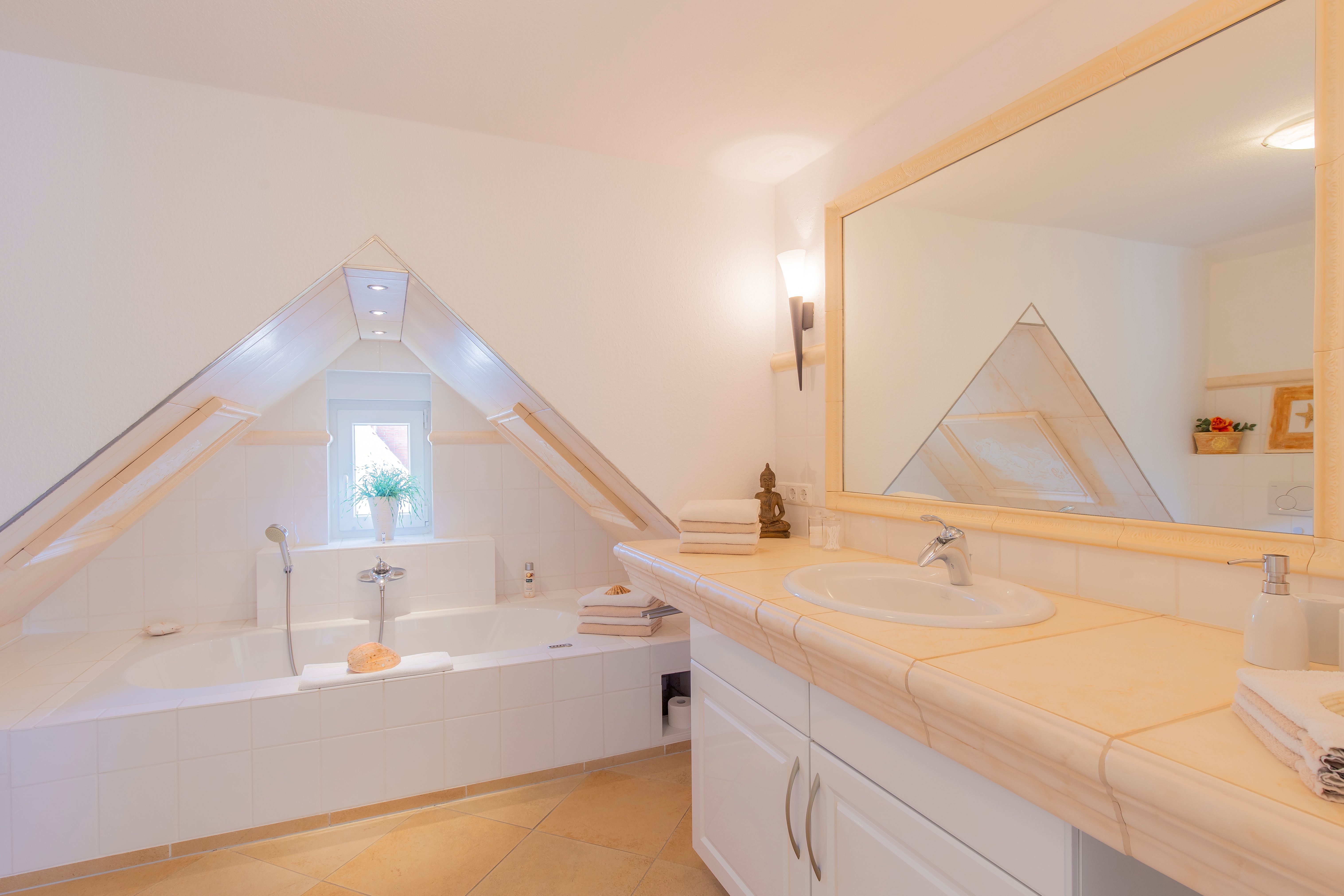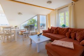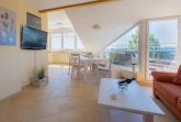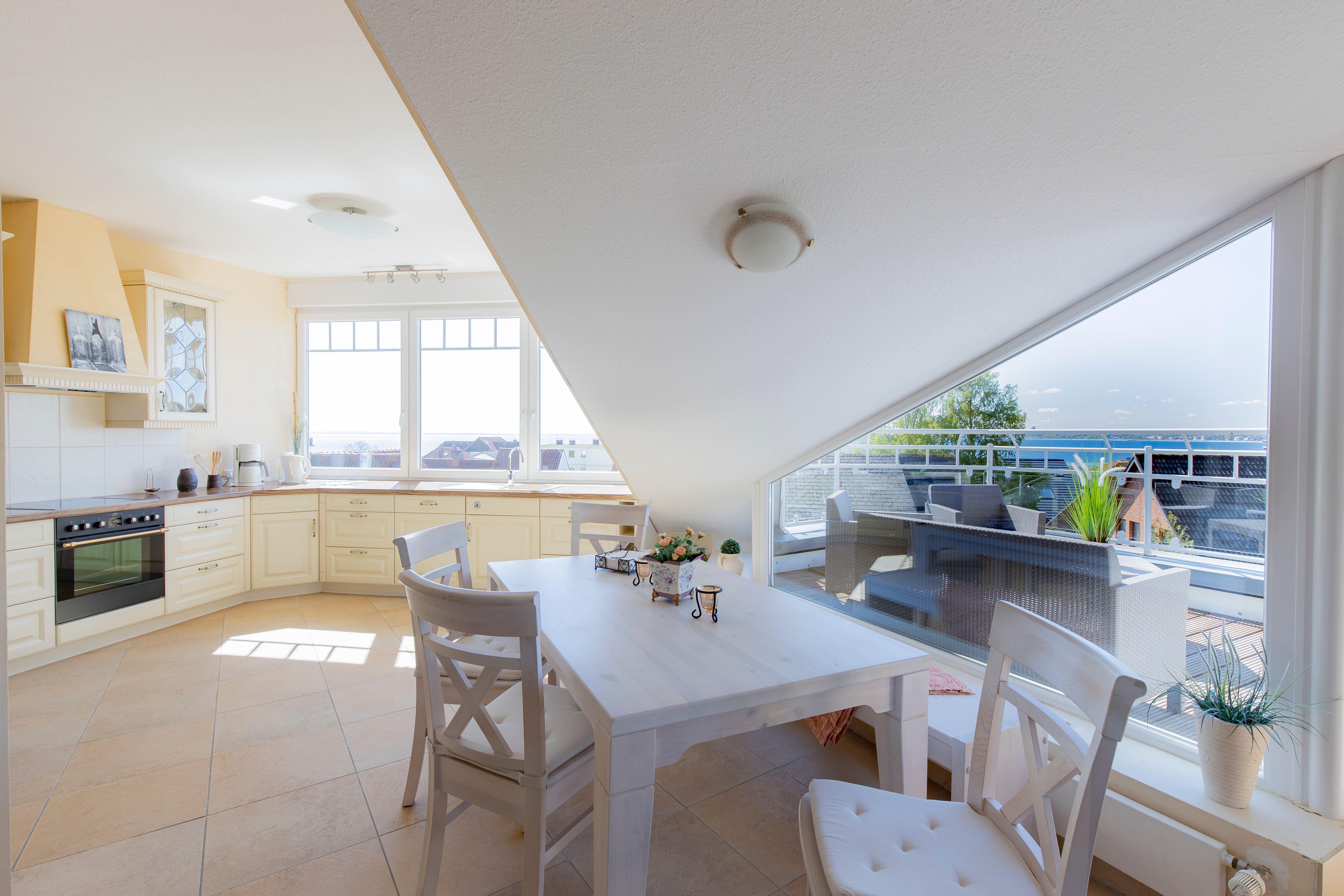 Diese großzügige und komfortable 75 m² große Ferienwohnung Leuchtturm befindet sich im Dachgeschoss. Die kleine, möblierte Loggia lädt am Morgen zum gemütlichen Sonnenfrühstück ein mit Blick über die Lübecker Bucht Richtung Timmendorfer Strand.