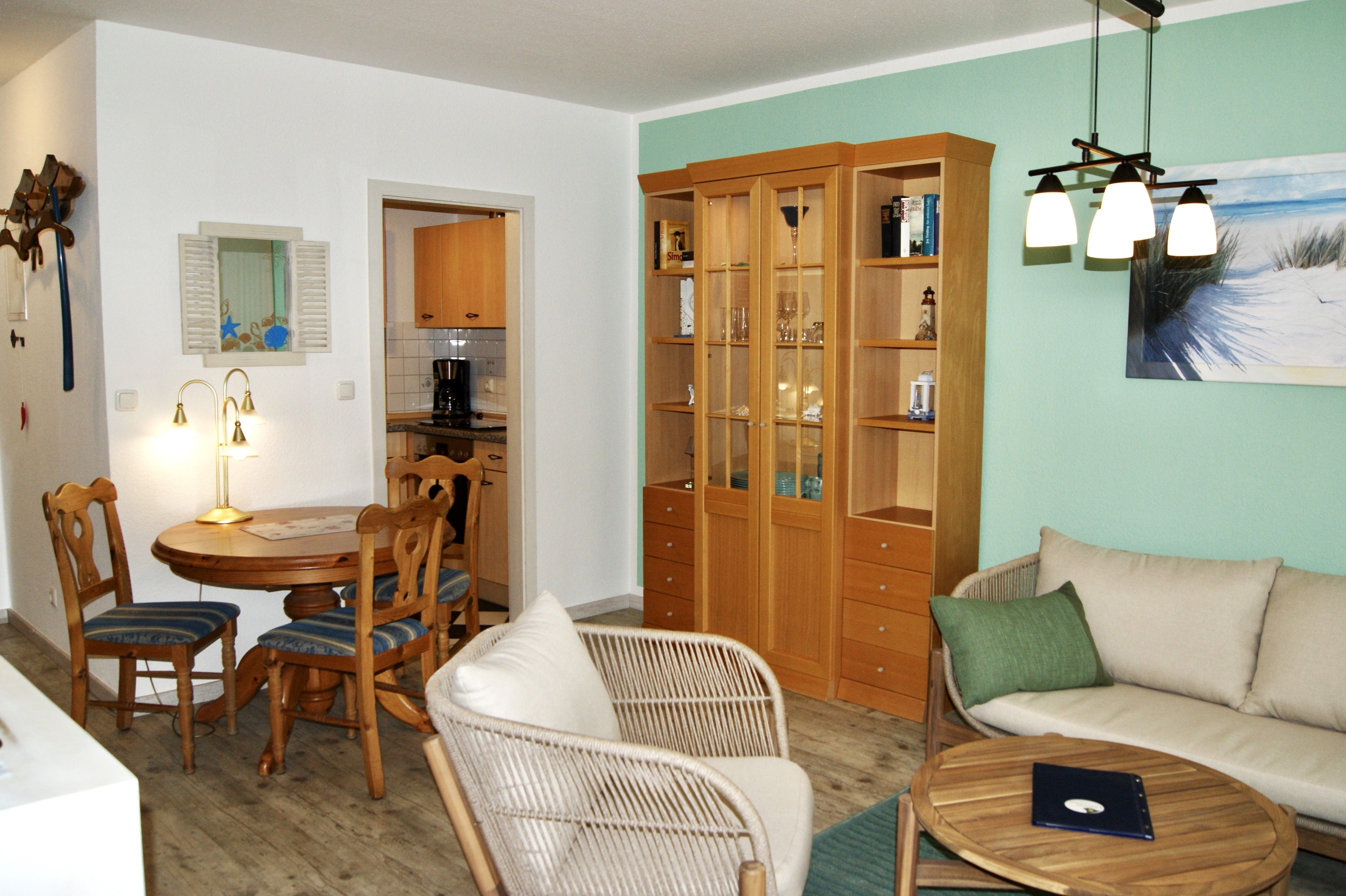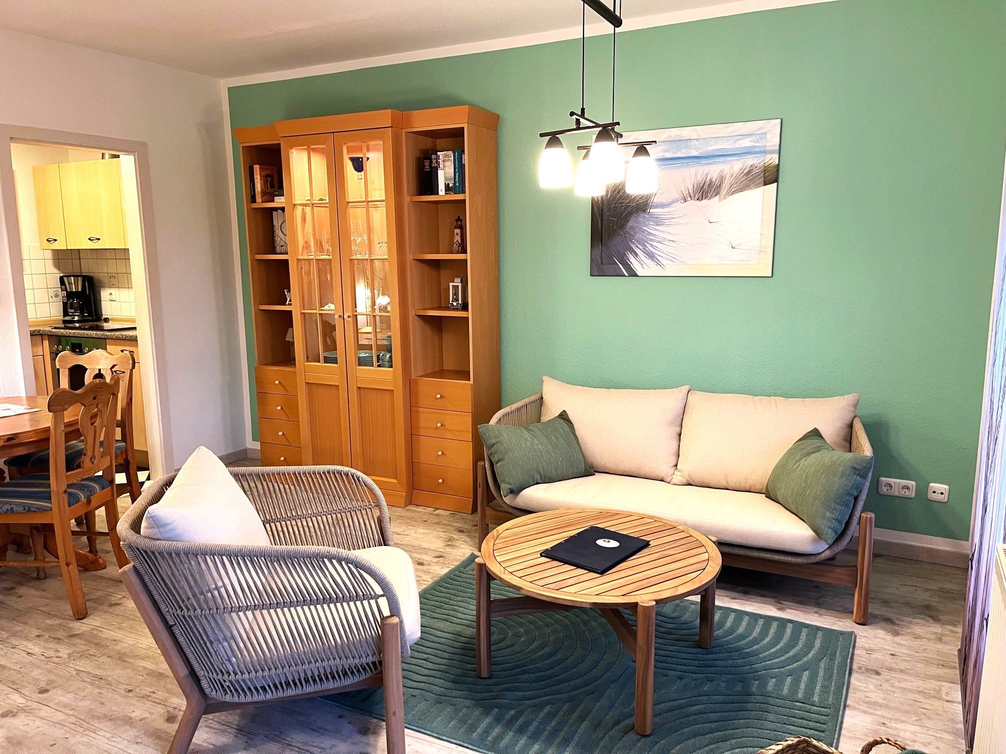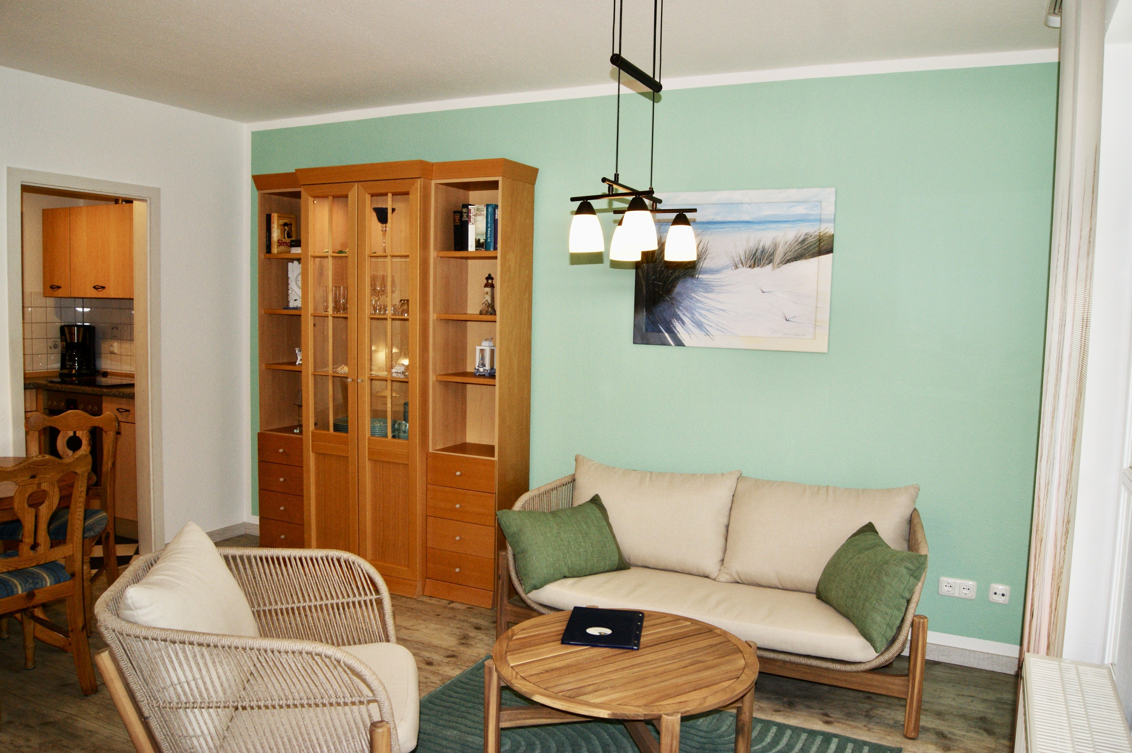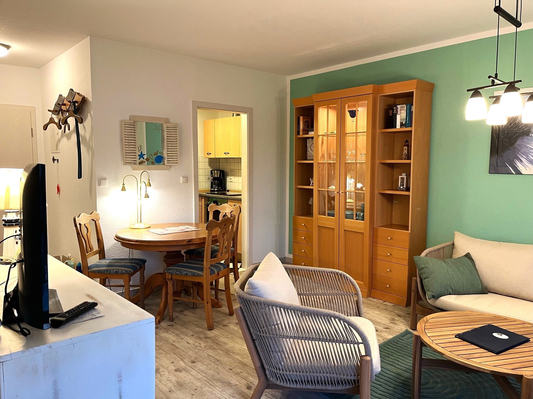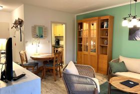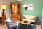 Auf 47 qm Wohnfläche erwarten Sie ein gemütliches Wohnzimmer inkl. offener Küche mit einem Design-Vinyl Boden in Holzoptik, ein im zarten Himmelblau gestrichenes Schlafzimmer (Teppichboden) mit einem bequemen Doppelbett, ein Badezimmer mit WC und Dusche und ein zusätzliches Gäste-WC.
