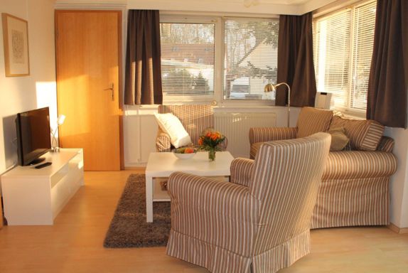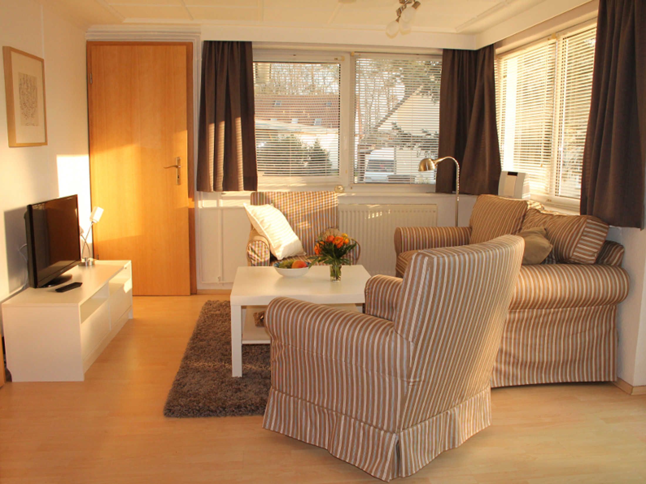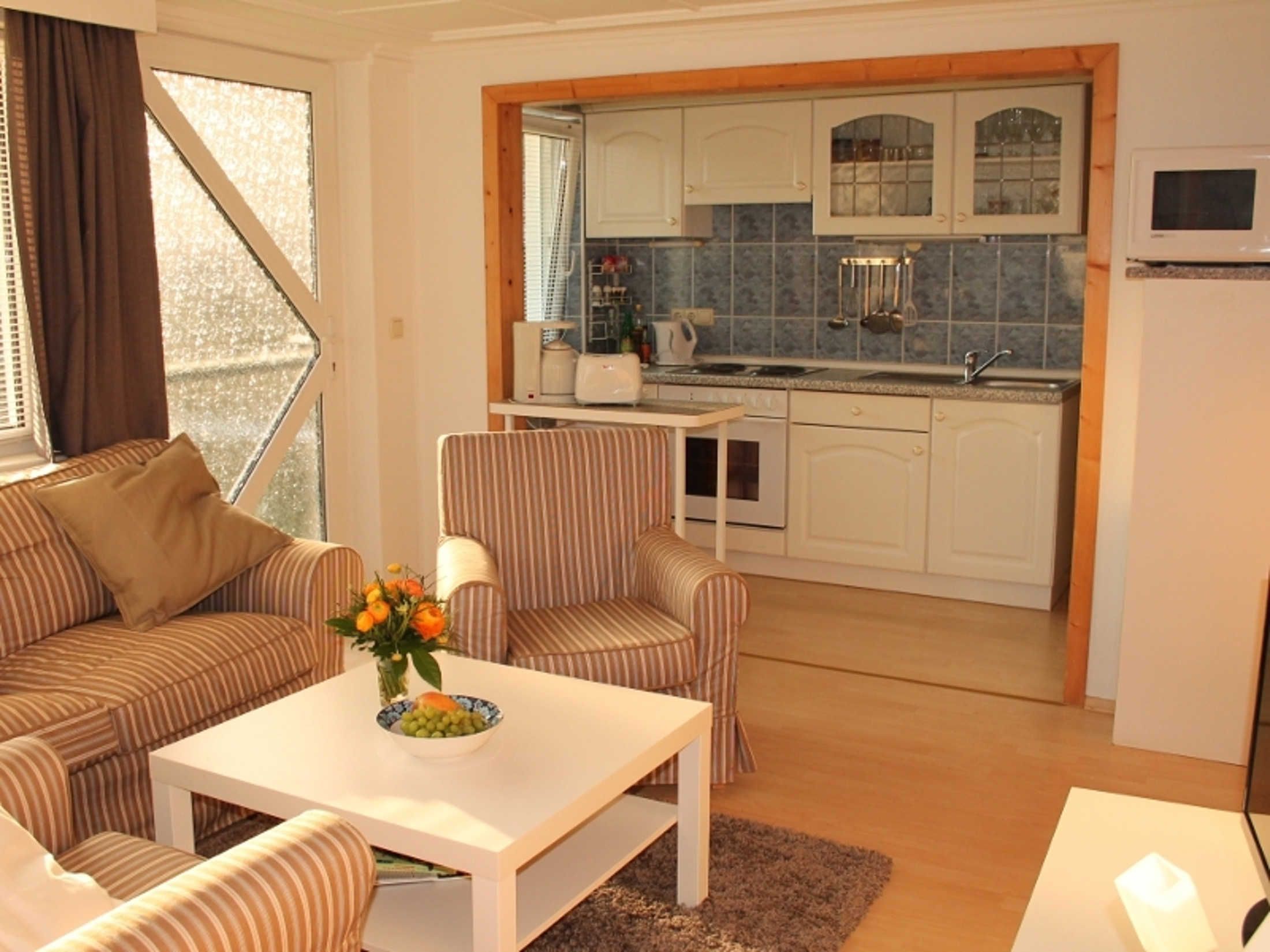 Der Wohnraum mit gemütlichen Sitzplätzen und Fernsehgerät mit Kabel/Sat Anschluss lädt zum Verweilen und Ausruhen ein.