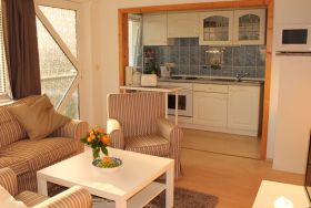 Die Küche ist in diesen Wohnraum integriert und verfügt über alle nötige Ausstattung wie Vier-Platten-Kochfeld, Backofen, Spüle, Dunstabzugshaube und Kühlschrank mit Gefrierfach. Wasserkocher, Kaffeemaschine, Toaster, Mikrowelle und selbstverständlich Geschirr und Besteck runden den Küchenbereich ab.