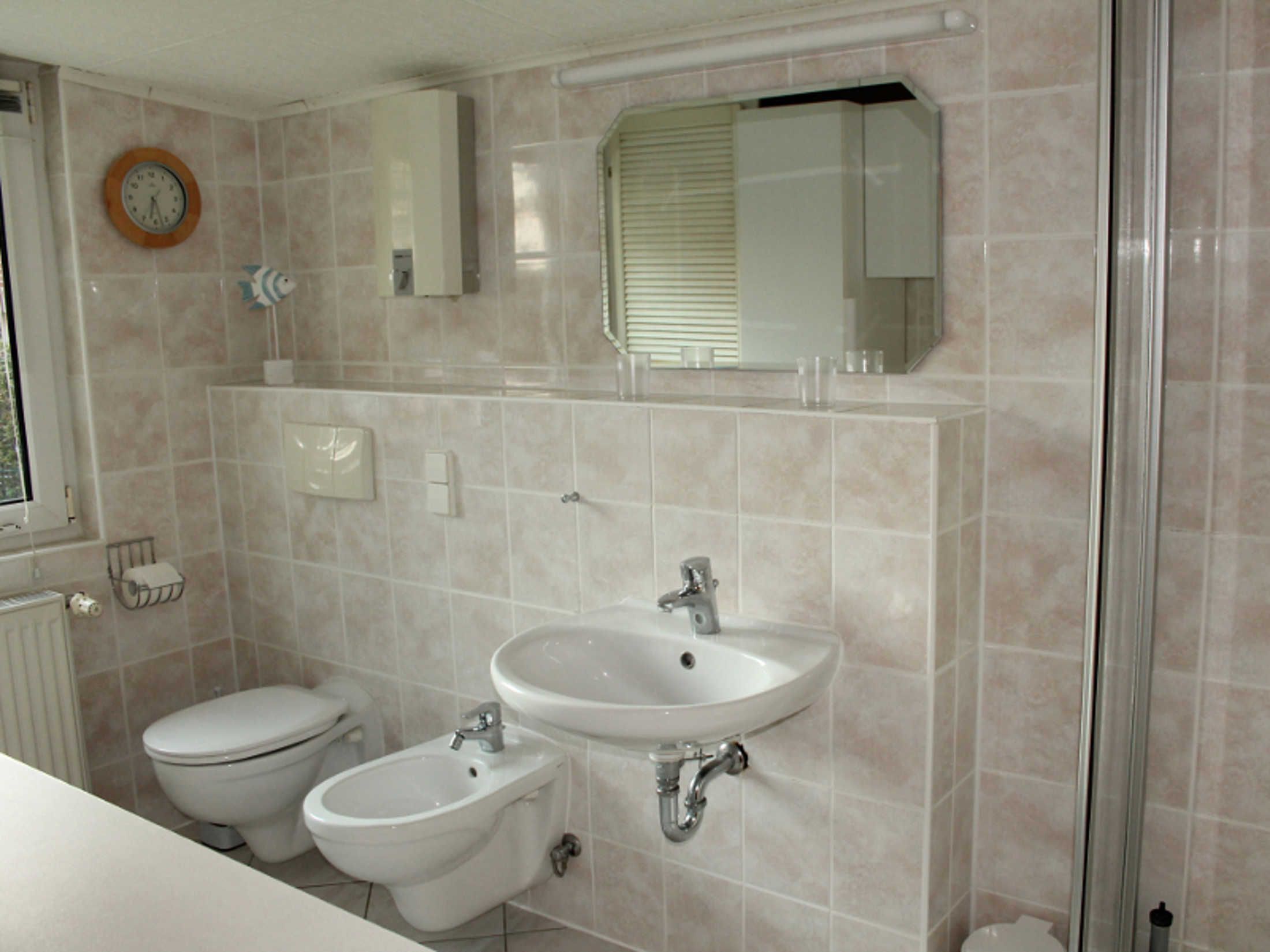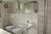 Ein helles freundliches Badezimmer verfügt neben Toilette, Bidet, Waschbecken und Dusche über reichlich Stauraum für den Hygienebedarf im Urlaub.