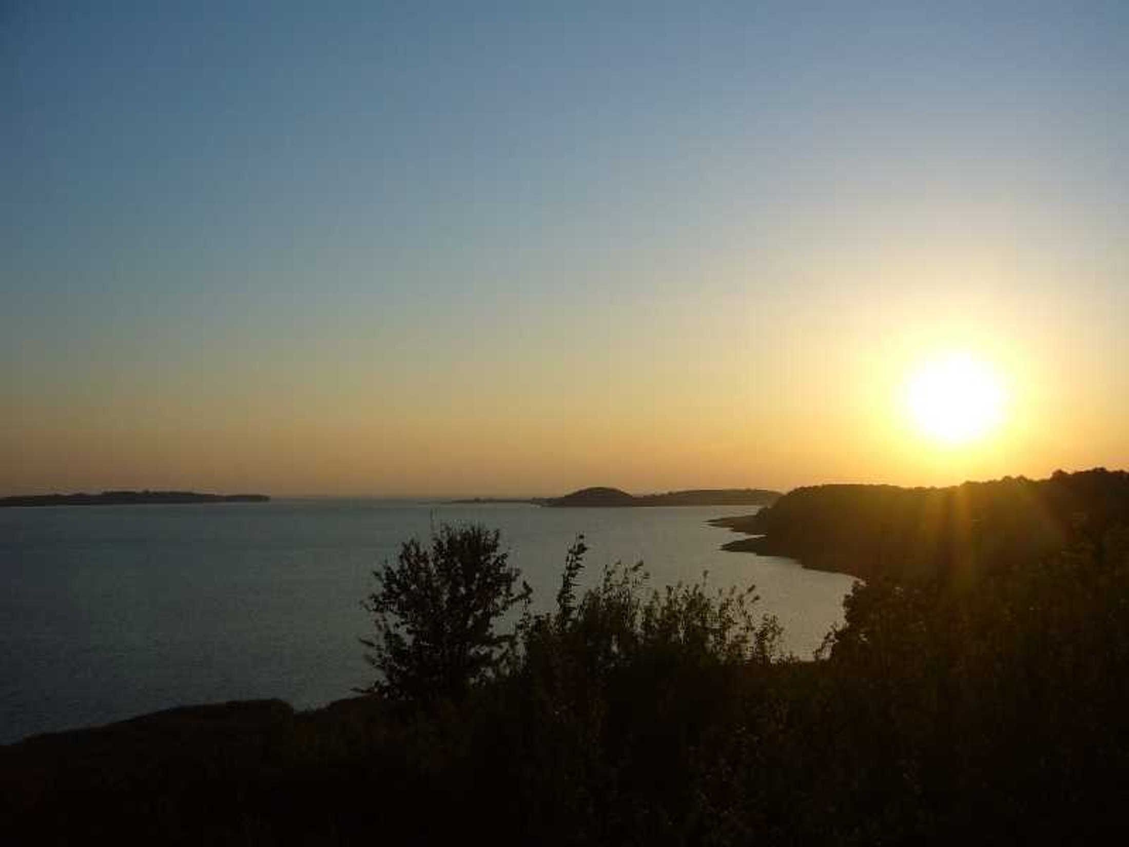 Ein rustikaler überdachter Freisitz, der direkt vom Wohnbereich aus erreicht wird, bietet Gelegenheit, das tägliche Essen zu einem Freilufterlebnis werden zu lassen, das Steak frisch vom Grill zu verzehren, zu lesen oder auch die im Haus absolut nicht erwünschte Zigarette zu rauchen. Zur Sommersaison stehen zwei Gartenliegen mit Tischchen zur Verfügung. Somit kann man auch am Ferienhaus, in Kühlschranknähe, der Sonne frönen. Eine fest installierte Wäschespinne im Garten nimmt die nassen Badesachen auf, trockenes Wetter vorausgesetzt.