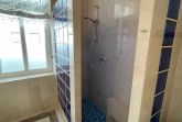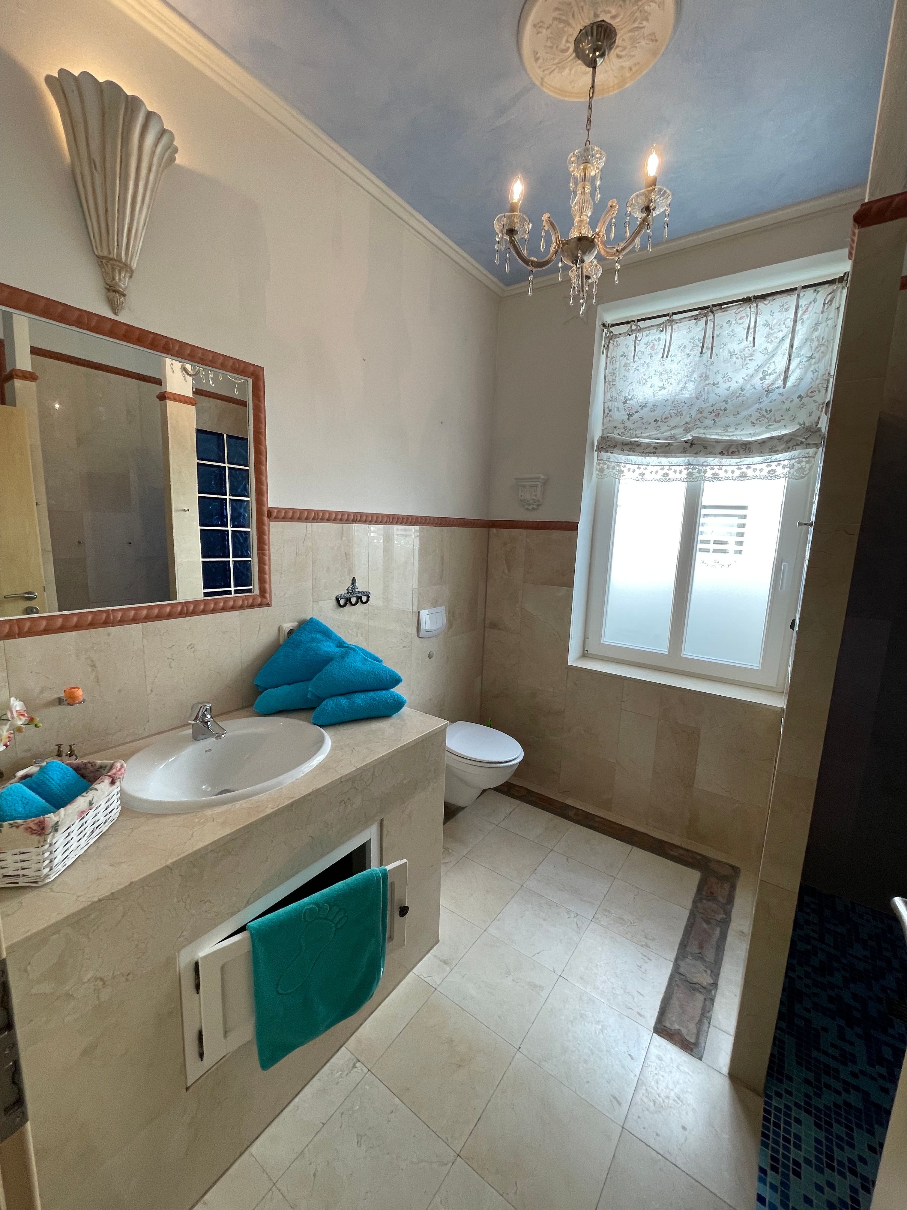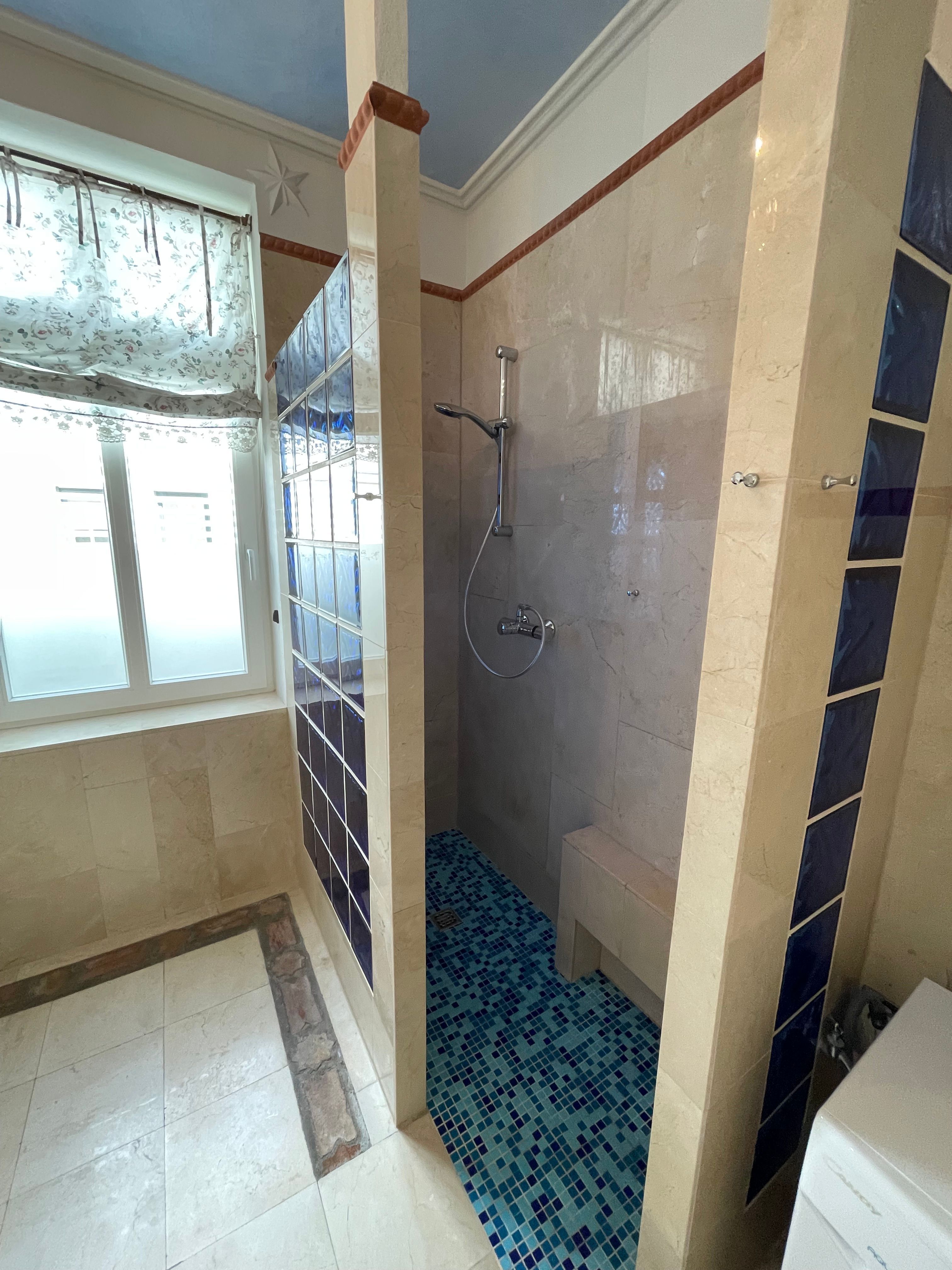 Marmor Duschbad mit WC, Fenster und Fußbodenheizung.