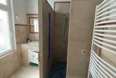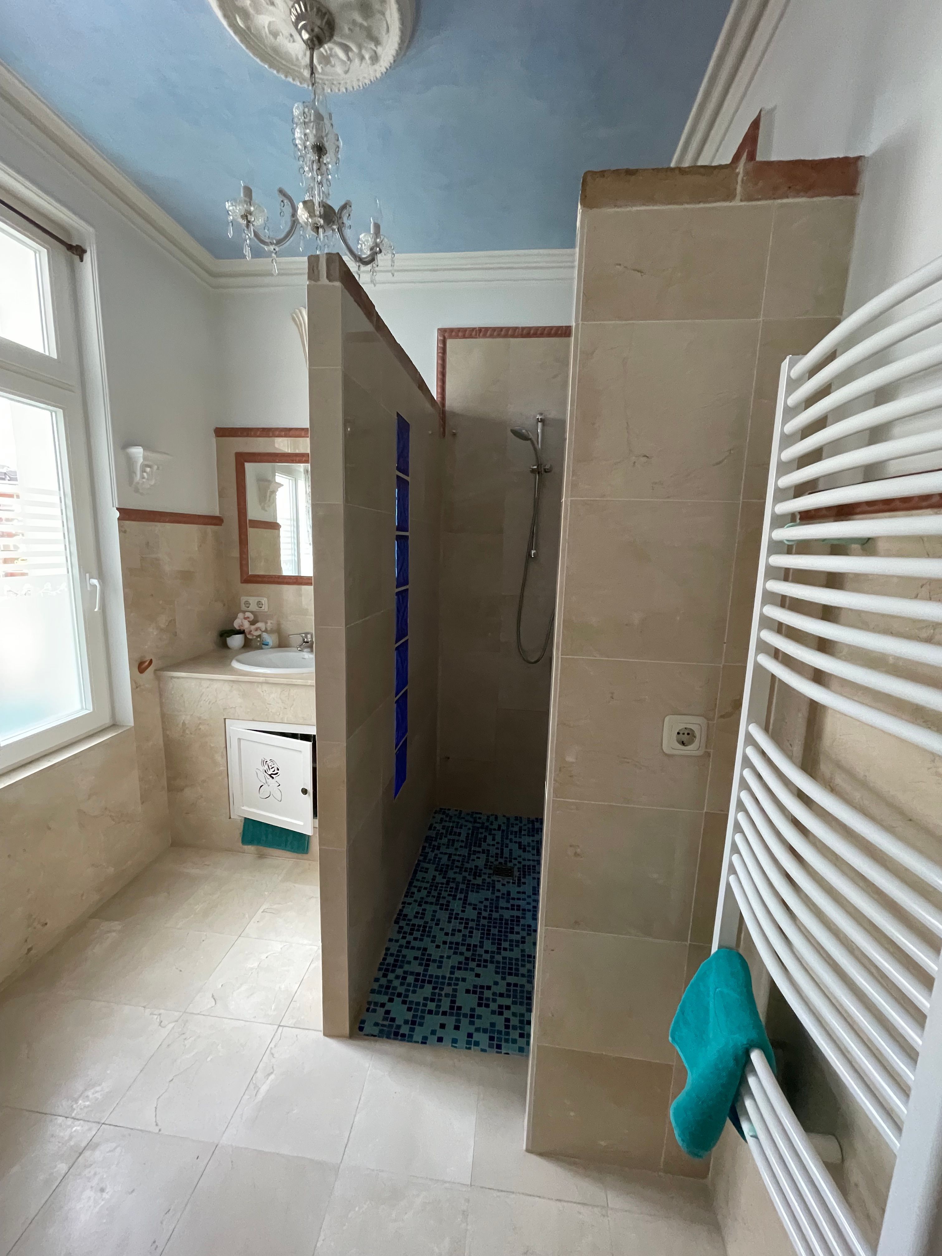 Marmor-Duschbad mit WC, Fenster und Fußboden- Heizung.