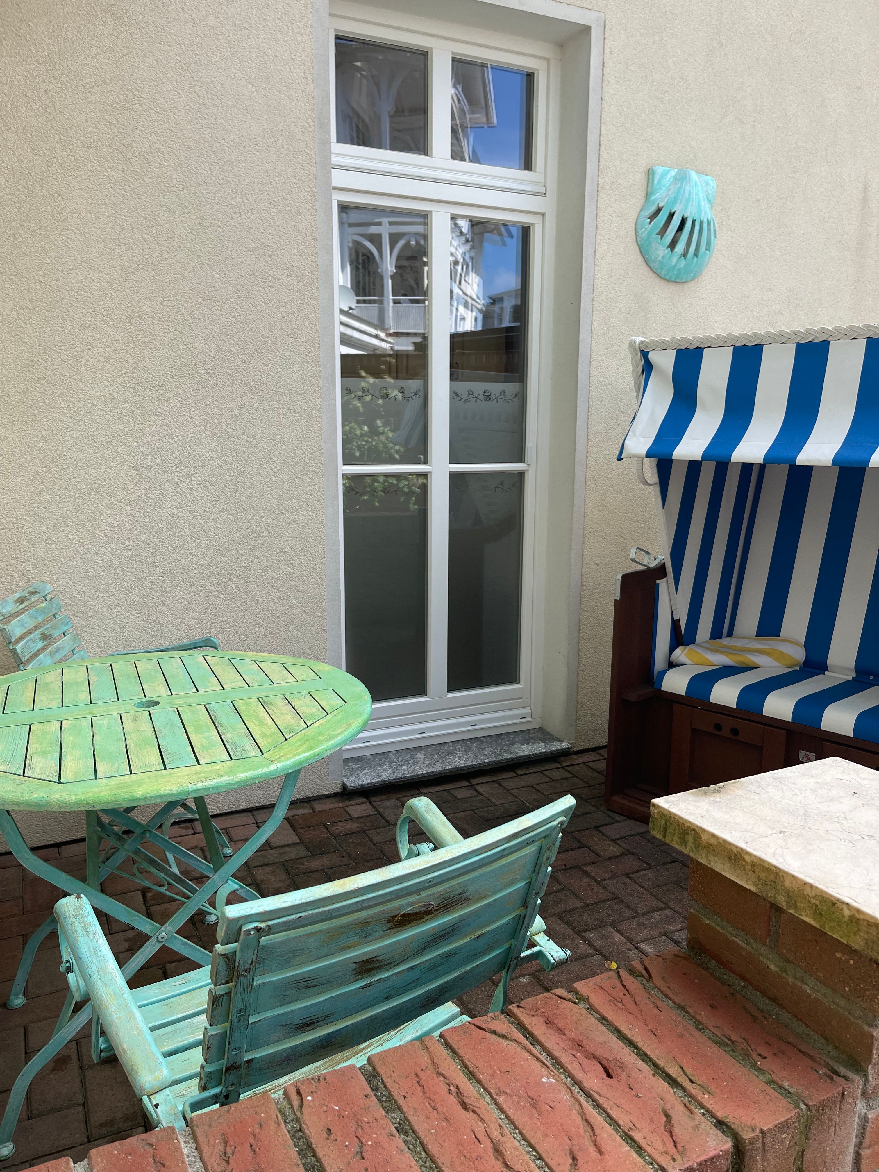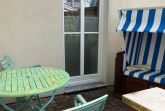 Liebevoll eingerichtete Ferienwohnung im Erdgeschoss, mit Terrasse und Strandkorb in nordwestlicher Richtung.