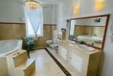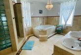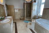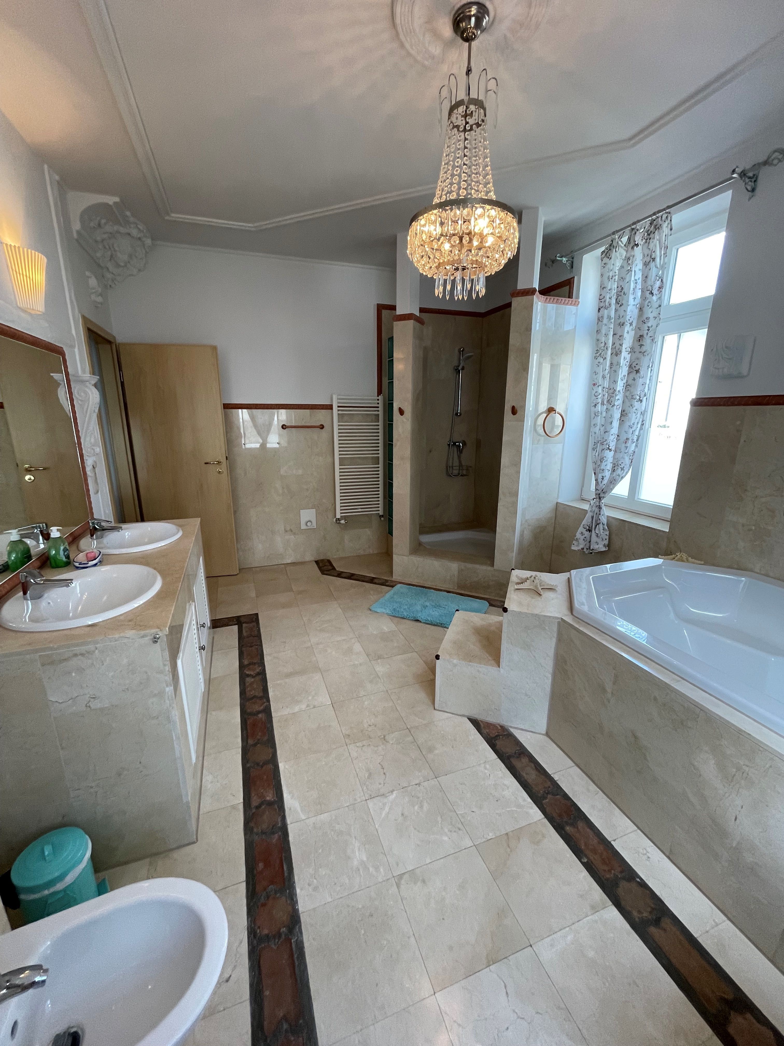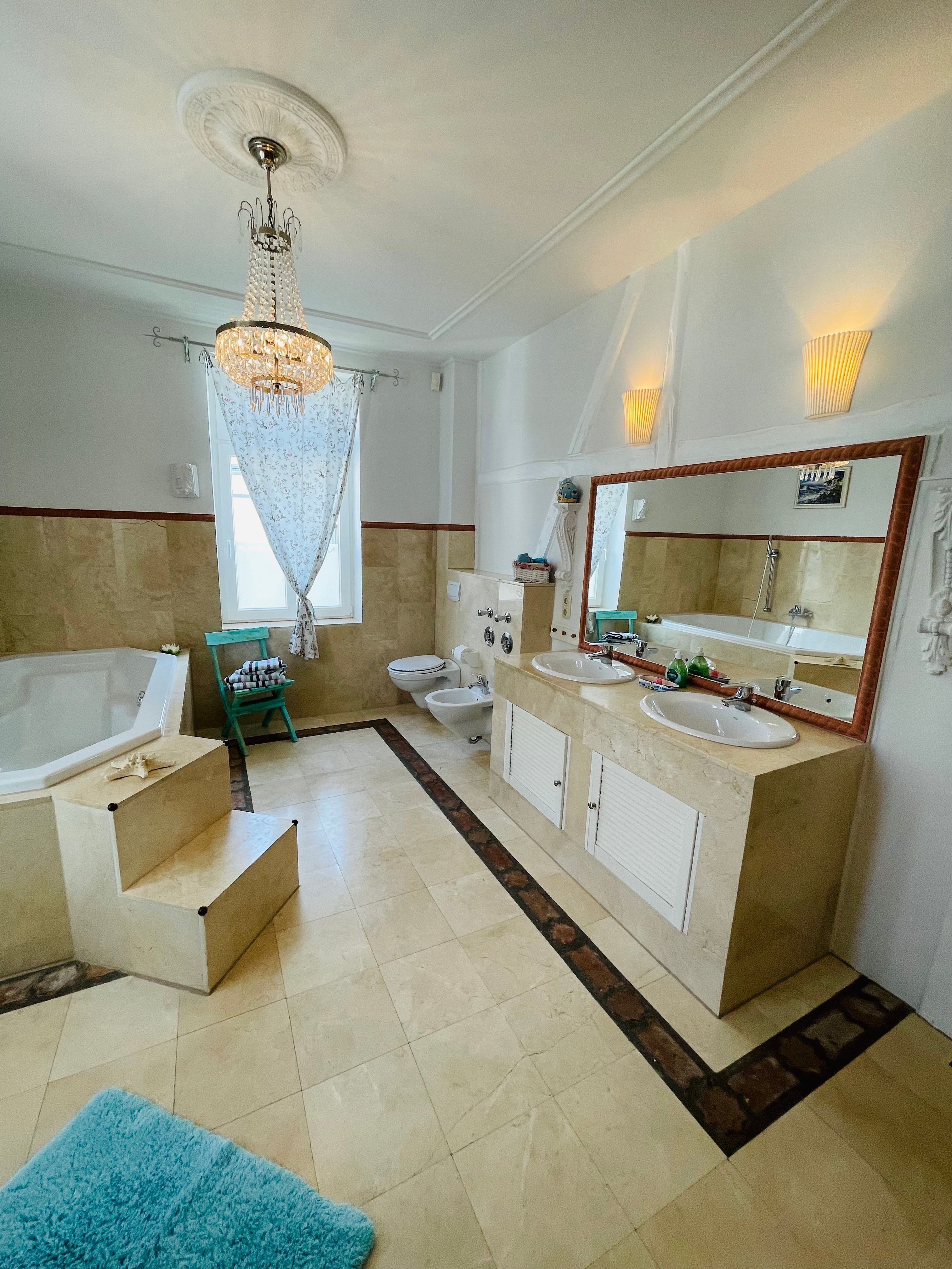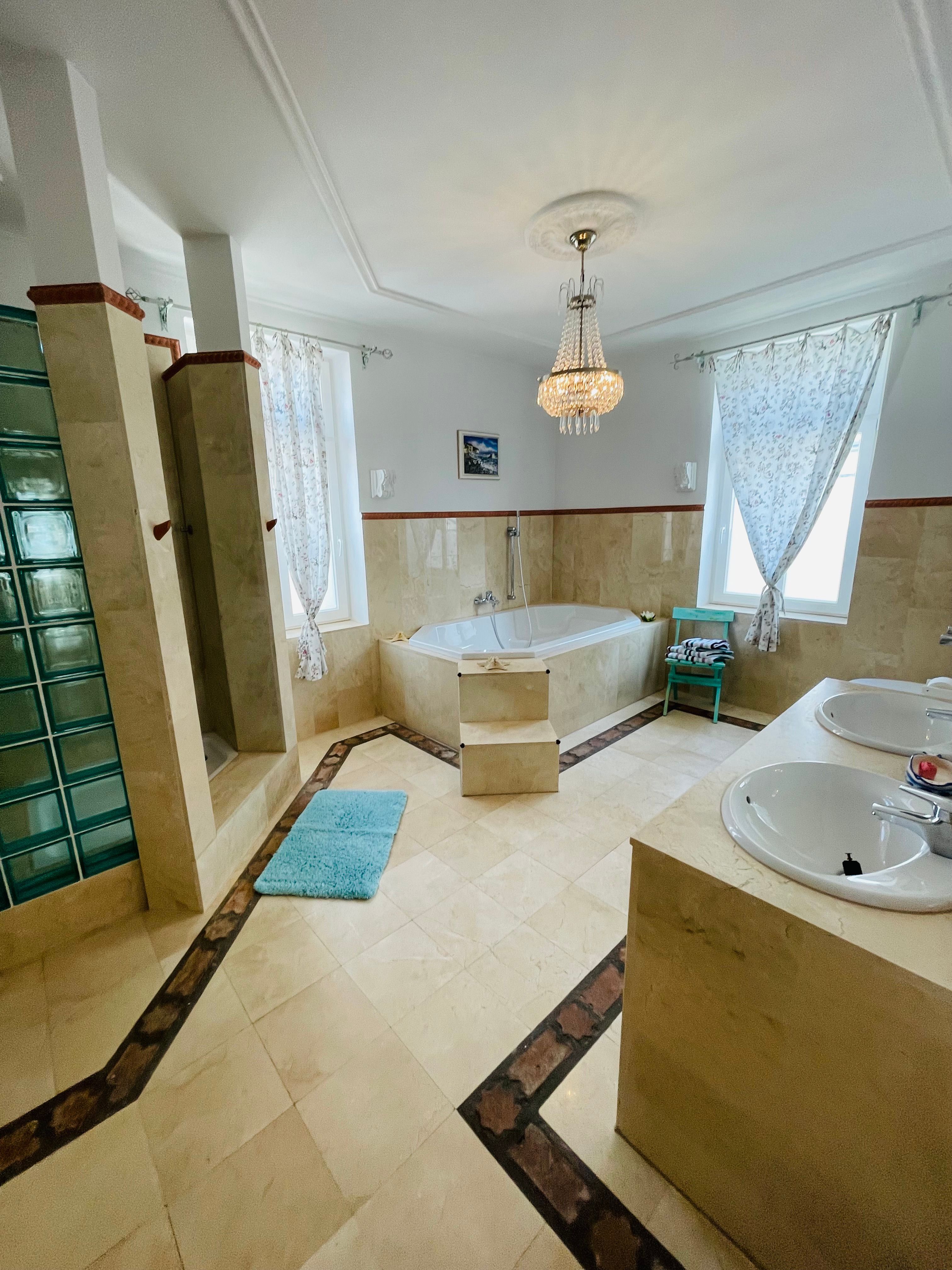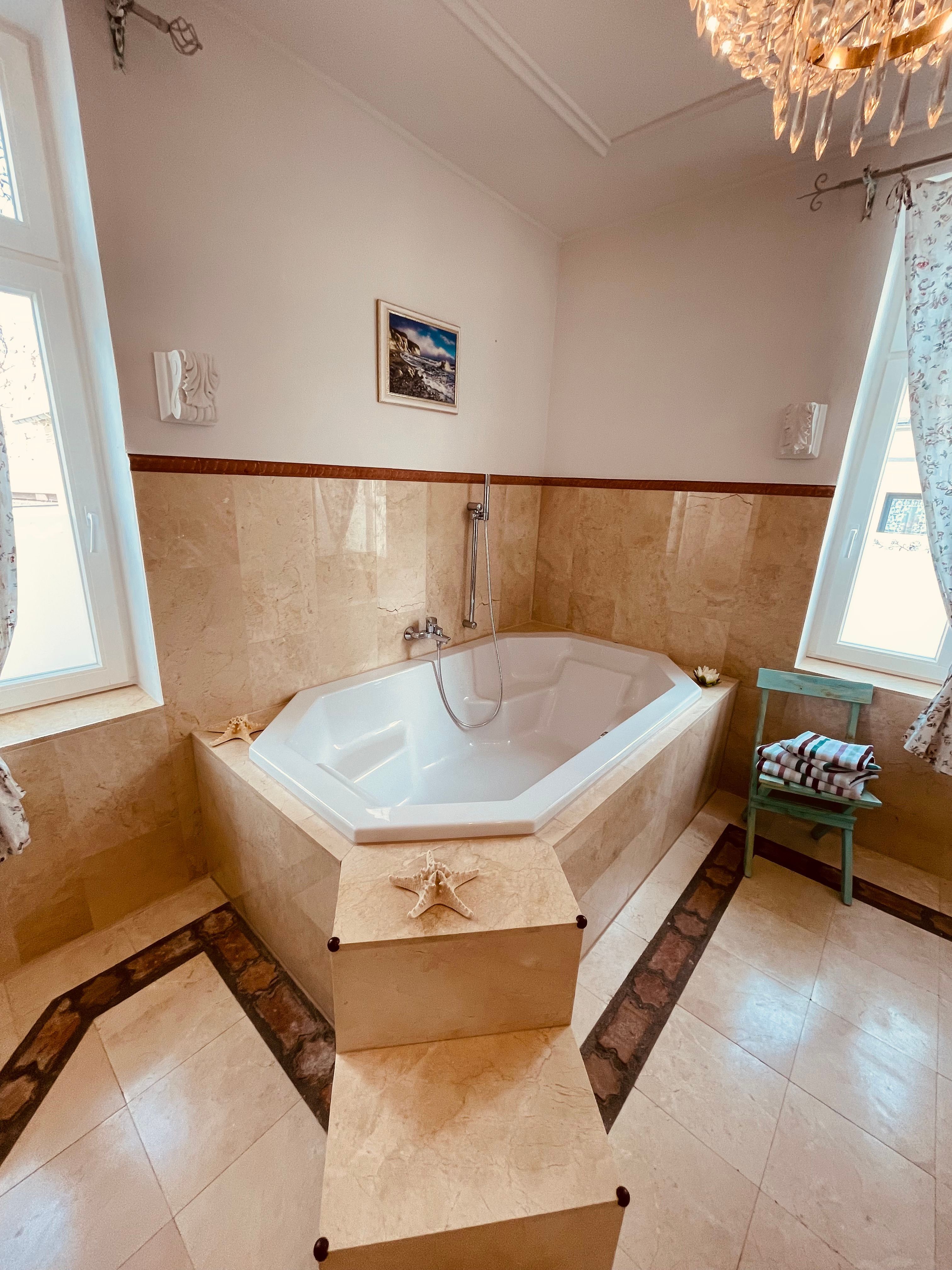 Marmor Duschbad mit Fußbodenheizung, großer Badewanne, Fenstern, BD und WC.
