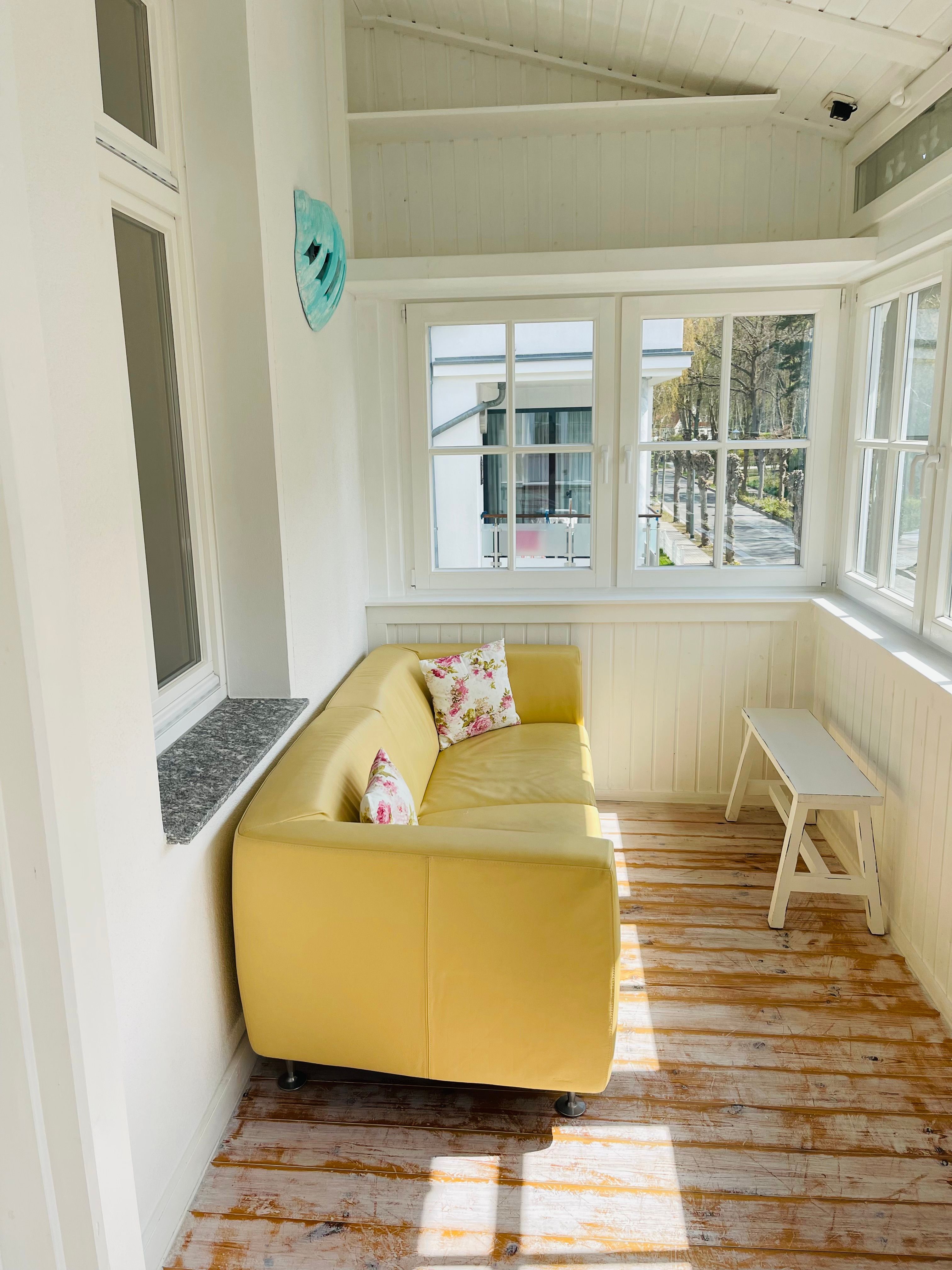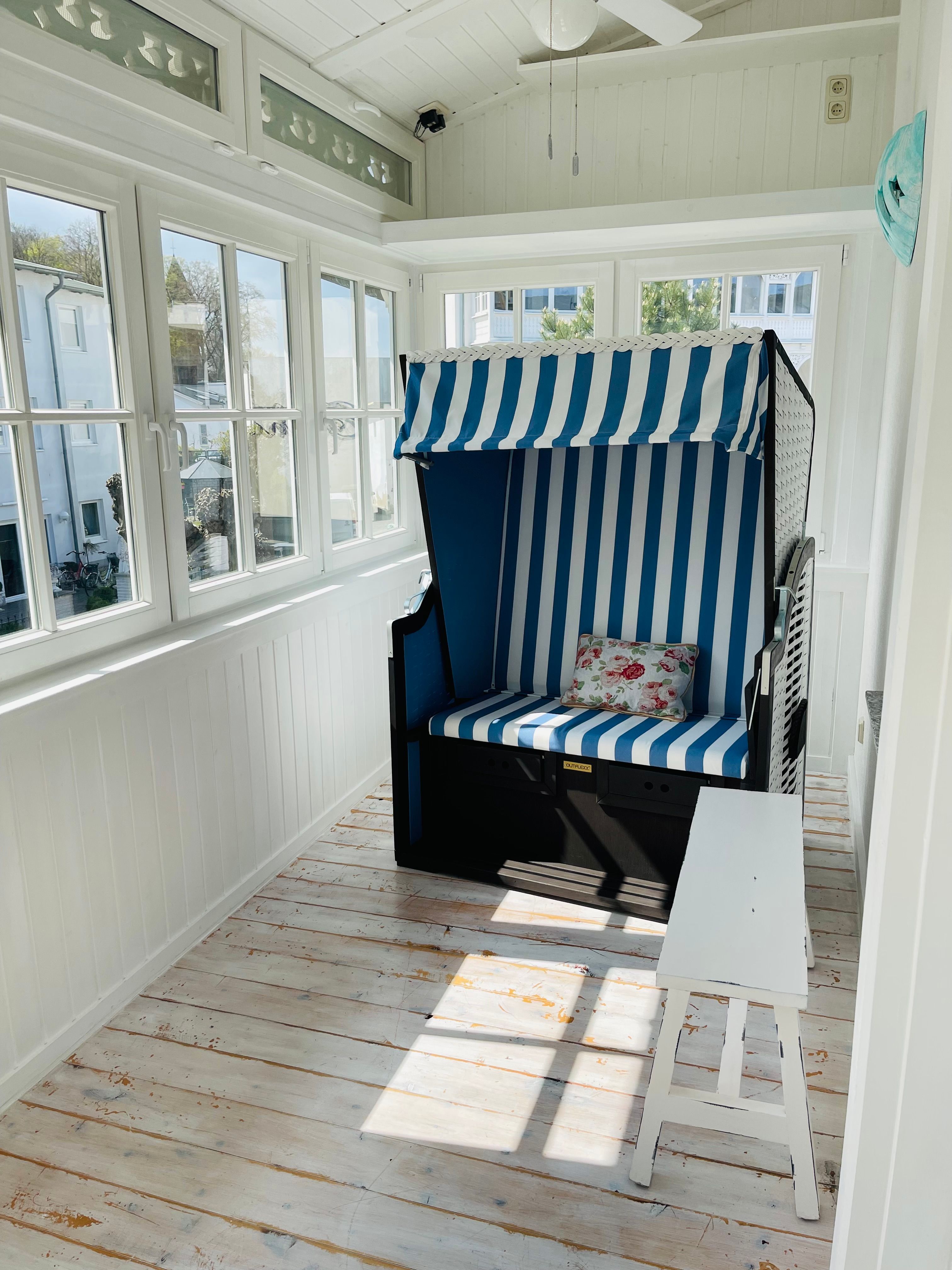 Liebevoll eingerichtete Ferienwohnung im 1.Obergeschoss, mit zwei Wintergärten, Sofa und Strandkorb in südlicher Richtung.