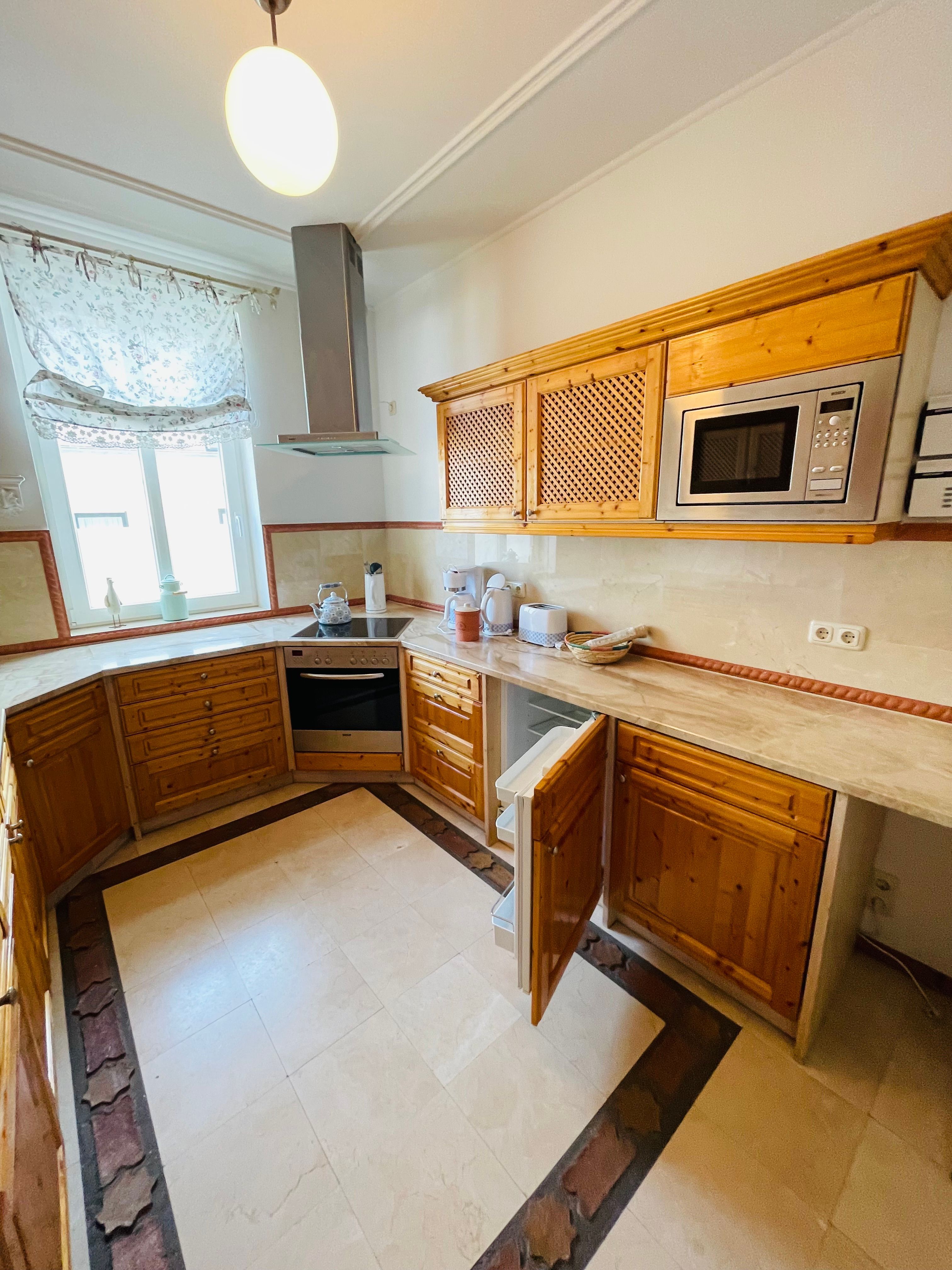 Eine voll ausgestatteter Küche mit Geschirrspüler, Microwelle, E-Herd mit Backofen, Tief-Kühlschrank uvm, sowie ein in Marmor gehaltenes Bad mit Dusche oder Badewanne, Fußbodenheizung, Föhn, Bügeleisen, Bügelbrett und Hanftuchtrockner. Der Stellplatz für Ihren PKW und Fahrradschuppen befinden sich am Haus.