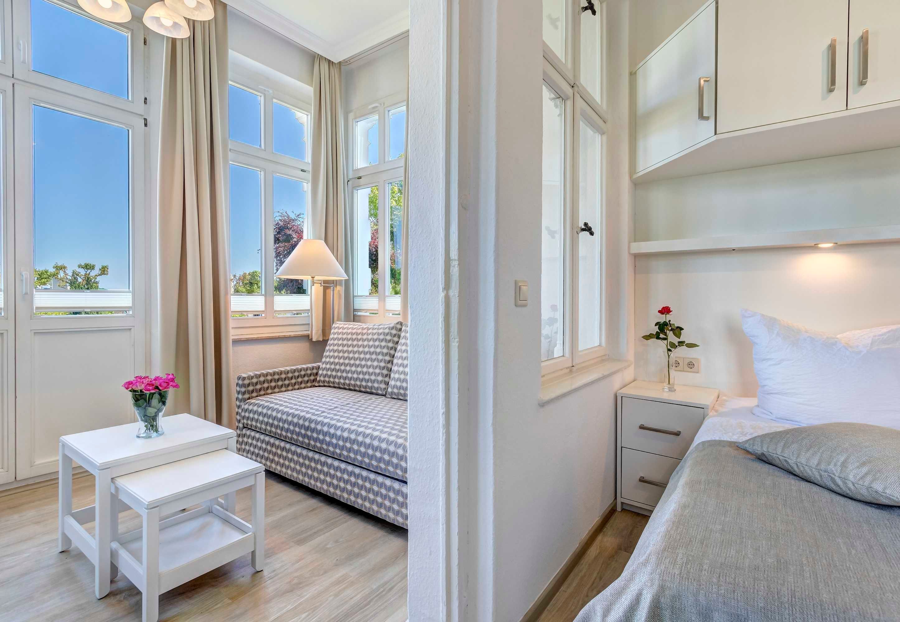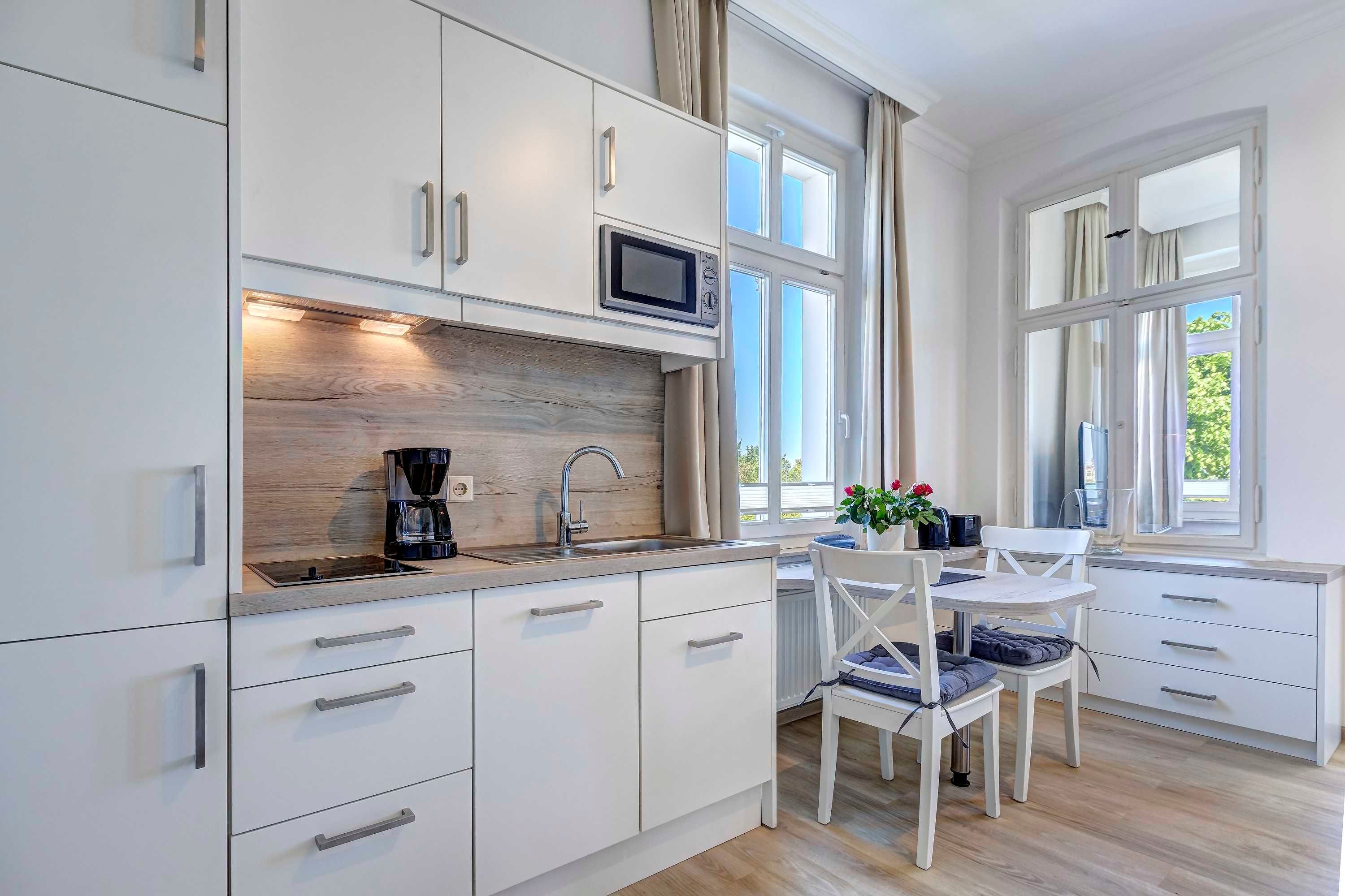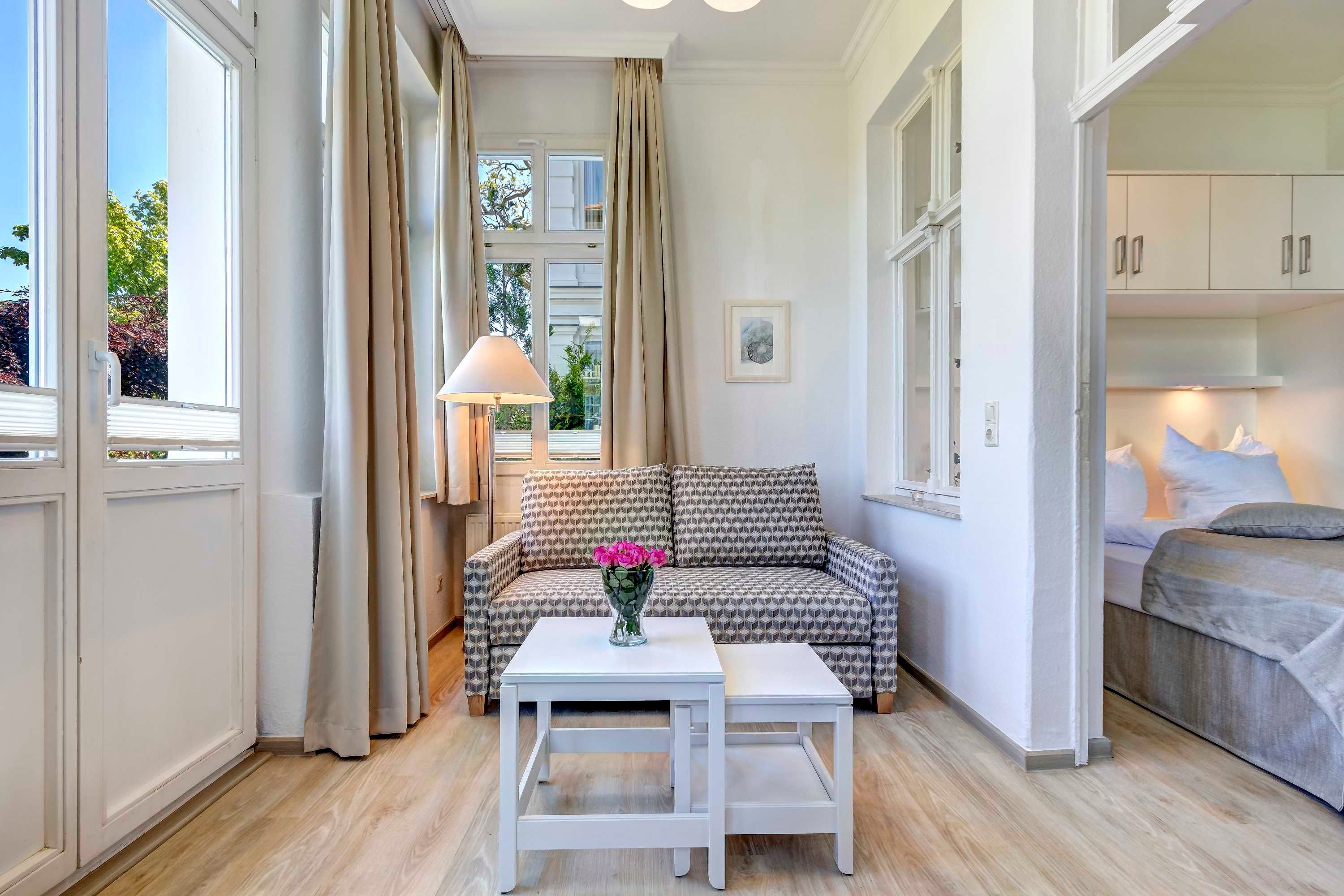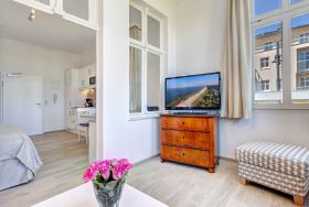 Das gemütliche 2-Zimmer-Appartement EG 1 befindet sich im Erdgeschoss der Villa Germania nur 40 Meter vom Strand entfernt, direkt an der Strandpromenade des Seebades Ahlbeck. Es verfügt über einen Kombiraum mit einem Doppelbett, Essbereich und einer mit Kaffeemaschine, Wasserkocher, Toaster, Mikrowelle voll ausgestatteten Küchenzeile. Der separate Wohnbereich mit gemütlicher Sitzgruppe befindet sich in der geschlossenen, verglasten Veranda, von welcher aus Sie einen direkten Zugang in den großen Gartenbereich und auf die Terrasse haben.