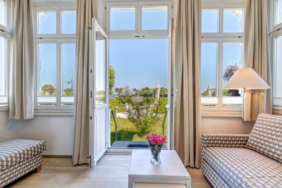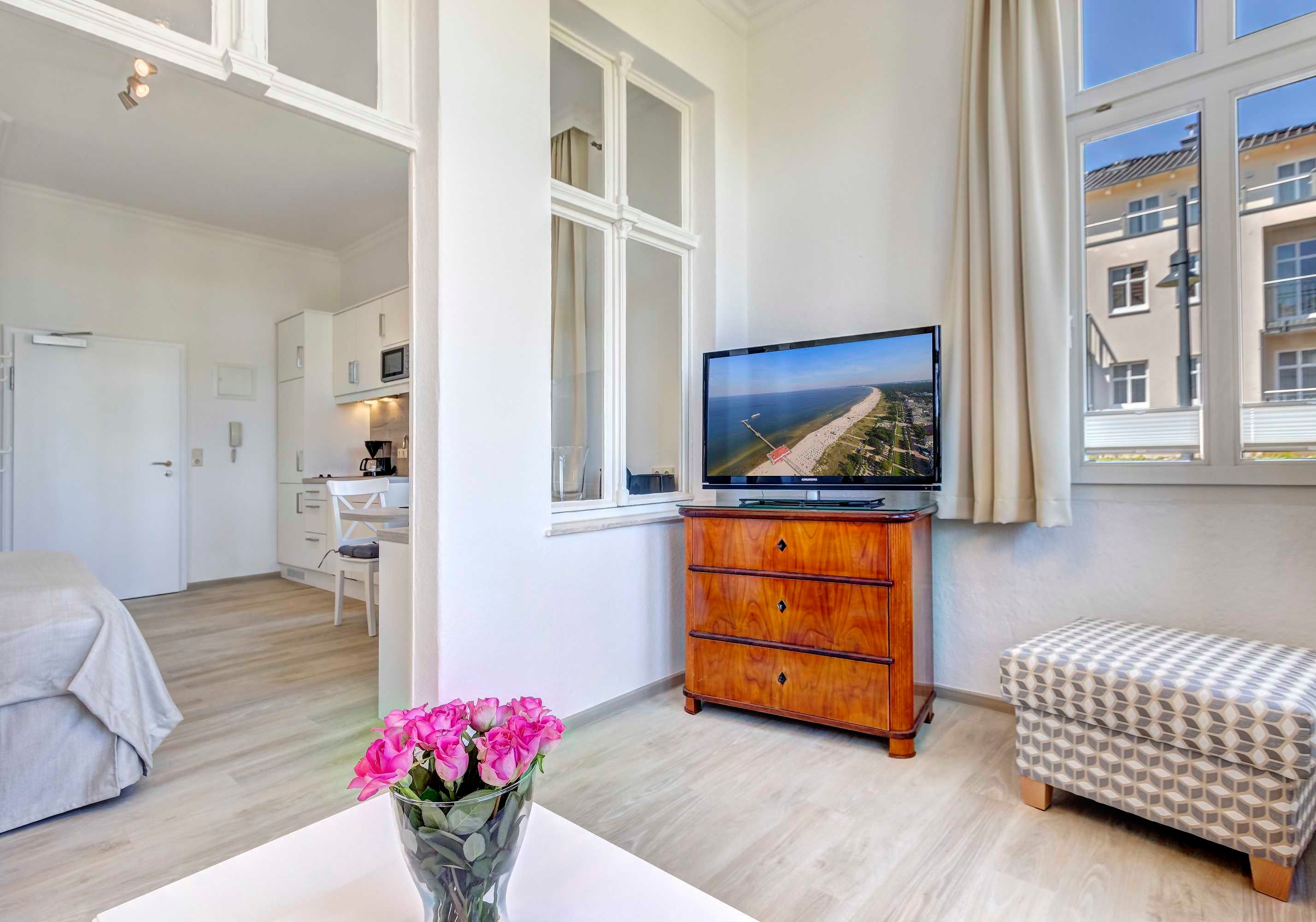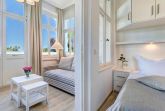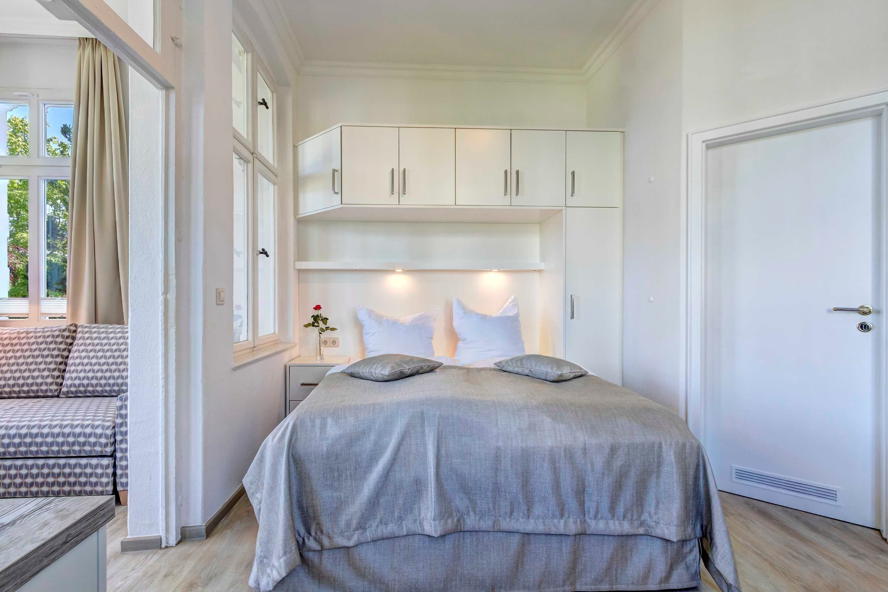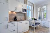 Das gemütliche 2-Zimmer-Appartement EG 1 befindet sich im Erdgeschoss der Villa Germania nur 40 Meter vom Strand entfernt, direkt an der Strandpromenade des Seebades Ahlbeck. Es verfügt über einen Kombiraum mit einem Doppelbett, Essbereich und einer mit Kaffeemaschine, Wasserkocher, Toaster, Mikrowelle voll ausgestatteten Küchenzeile. Der separate Wohnbereich mit gemütlicher Sitzgruppe befindet sich in der geschlossenen, verglasten Veranda, von welcher aus Sie einen direkten Zugang in den großen Gartenbereich und auf die Terrasse haben.
