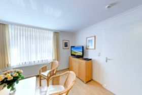 Das gemütliche 2-Zimmer-Appartement Sout. 1 befindet sich im Untergeschoss der Villa Germania nur 40 Meter vom Strand entfernt und hat einen separaten Eingang. Es verfügt über ein separates Schlafzimmer mit einem Doppelbett und einen Wohnbereich mit gemütlicher Sitzgruppe, einem Essbereich sowie einem zus. Einzelbett. Die separate Küche ist mit Kaffeemaschine, Wasserkocher, Toaster, Mikrowelle, Backofen sowie Geschirrspüler voll ausgestattet. Das Bad verfügt über Dusche und WC. Zum Appartement gehört darüber hinaus eine Terrasse nach Süden mit Gartenmöbeln., Die Wohnung liegt im Soutterrain, hat aber durch das Grundstücksgefälle einen separaten Eingang und durch normal große Fenster eine gute Belichtung. Ein Pkw-Stellplatz steht Ihnen auf dem Grundstück kostenfrei zur Verfügung. Alle Wohnungen in der Villa Germania haben passwortgeschütztem DSL-WLAN Internetzugang (gerätegebunden, Euro 1,50 pro Tag und Gerät).