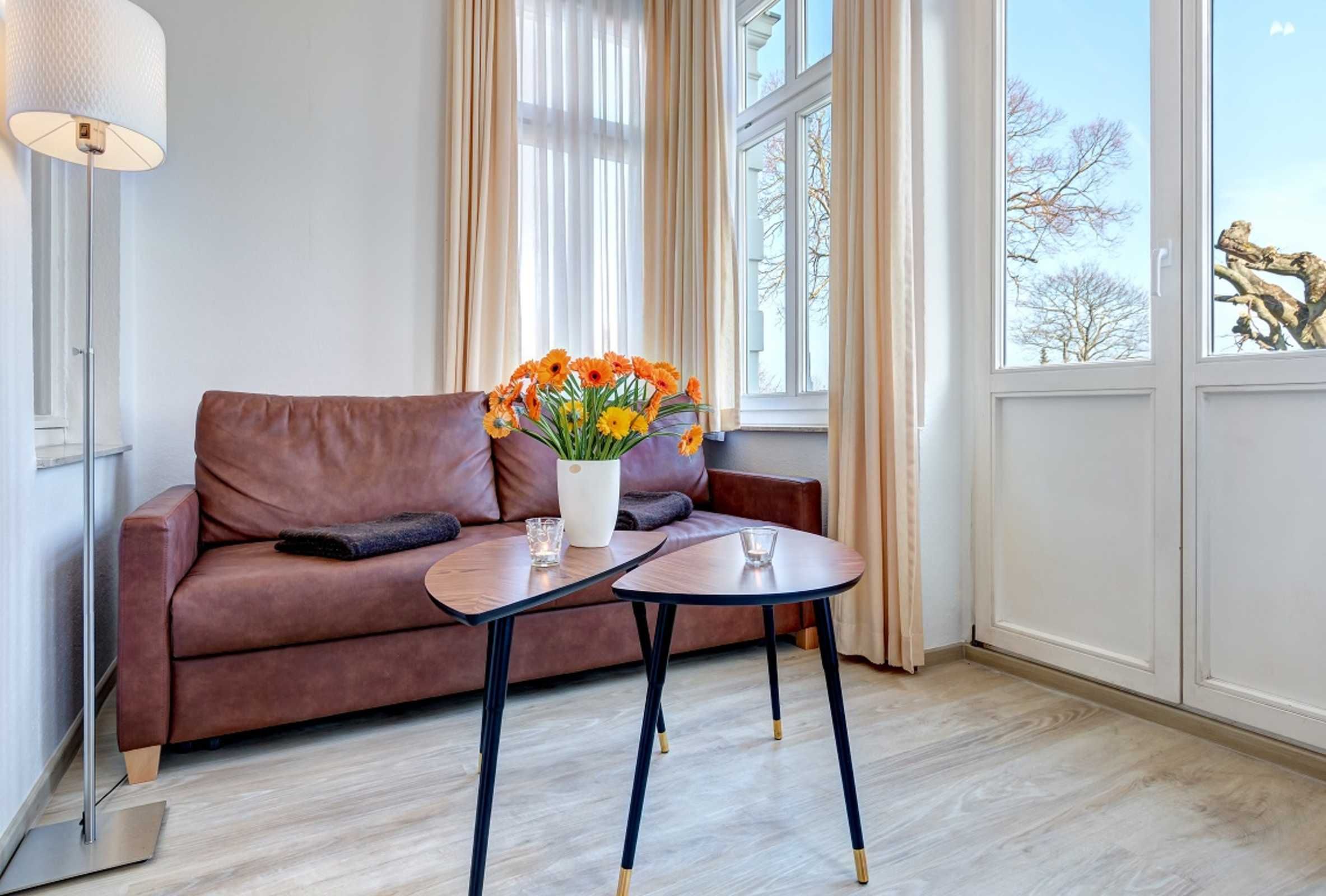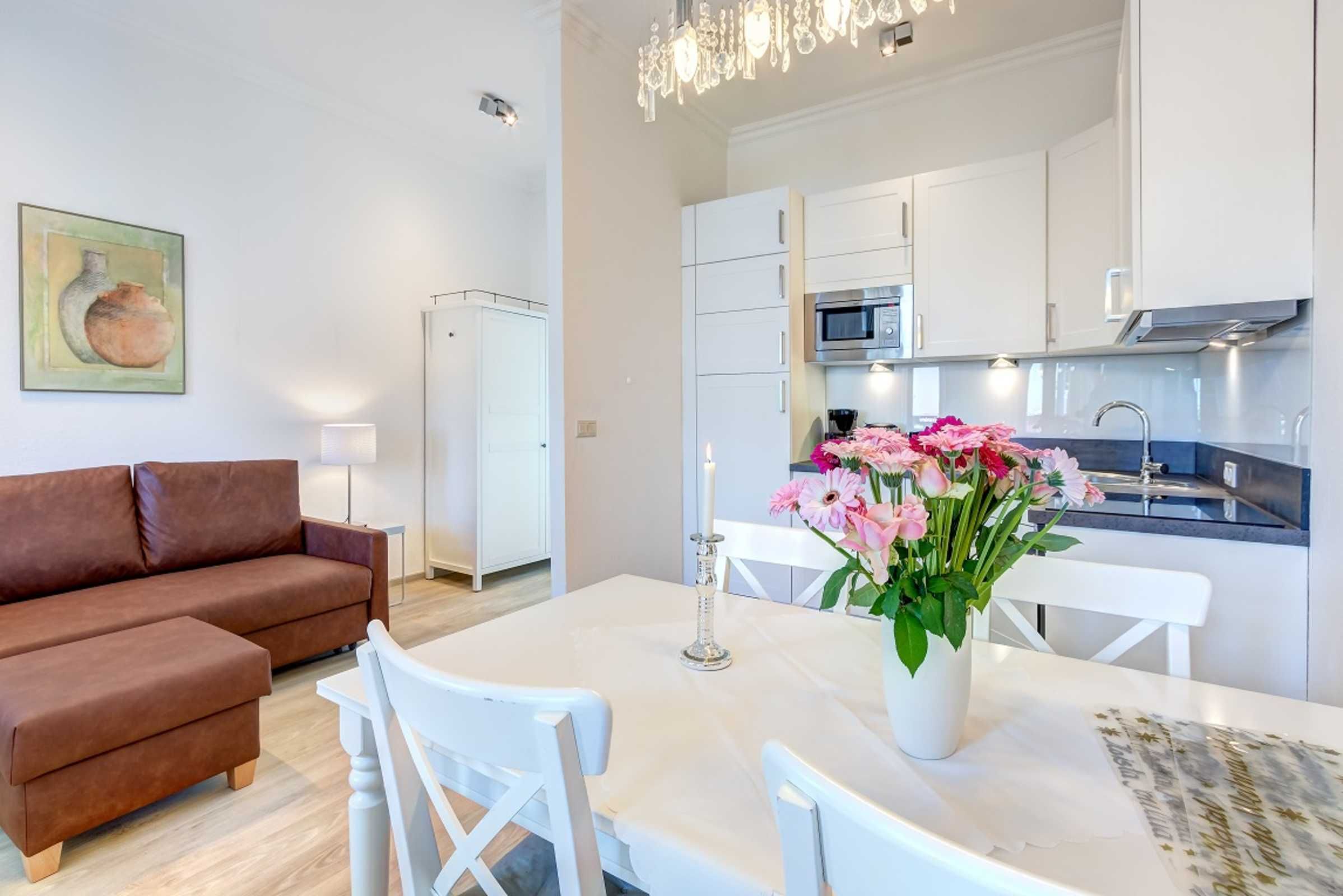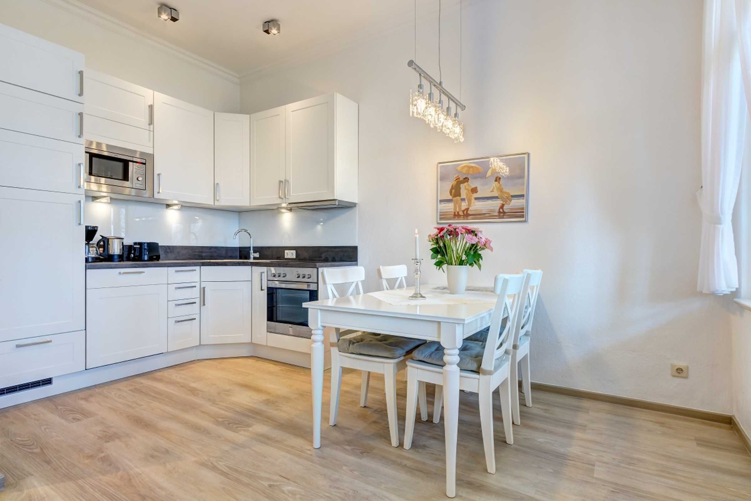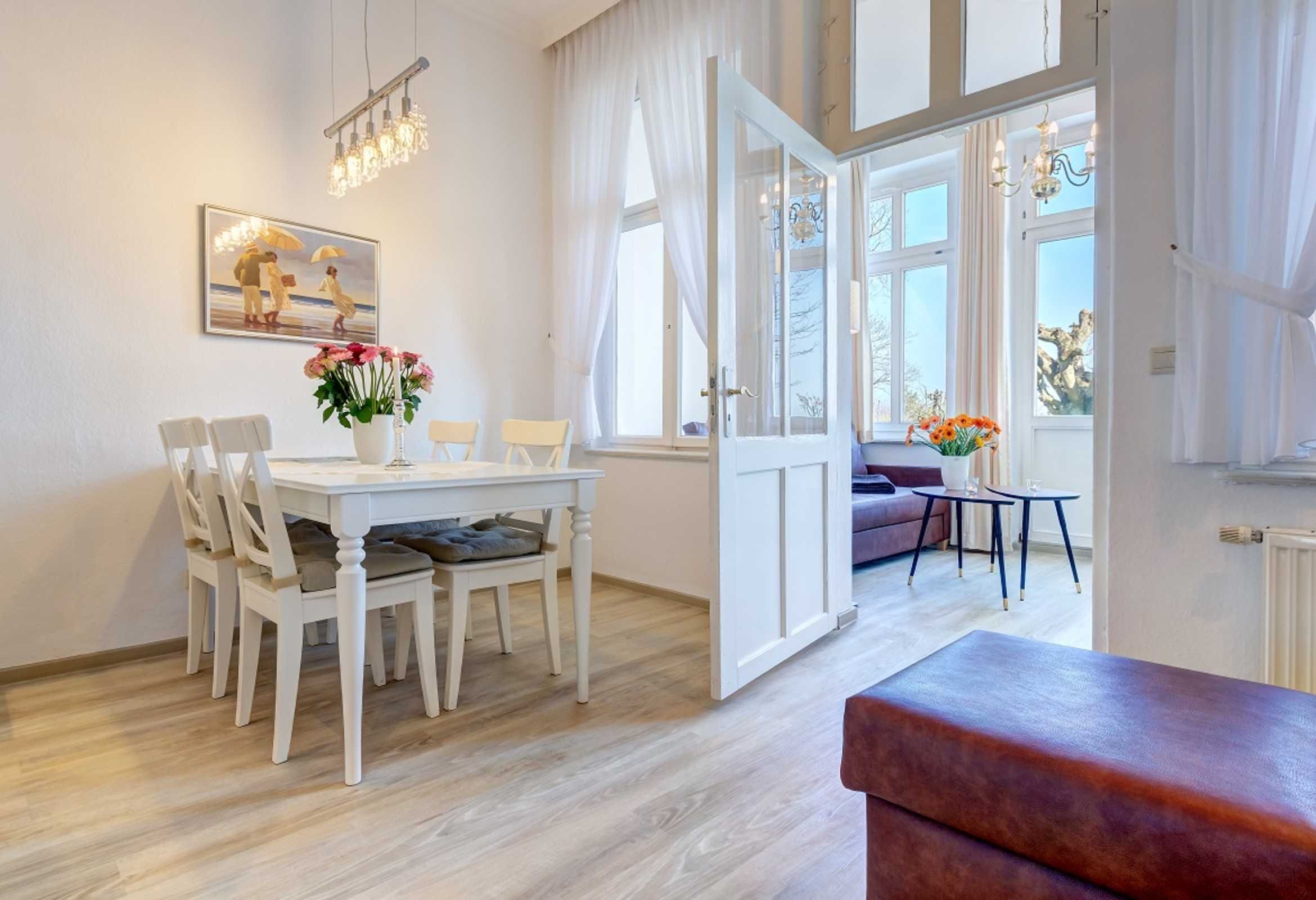 Das komfortable 3-Zimmer-Appartement EG 3 befindet sich im Erdgeschoss der Villa Germania nur 40 Meter vom Strand entfernt und hat einen separaten Eingang. Es verfügt über ein separates Schlafzimmer mit einem großen Doppelbett, einem Kombiraum mit Doppelbett, Essbereich sowie einer integrierten Küchenzeile, die mit Kaffeemaschine, Wasserkocher, Toaster, Mikrowelle, Backofen und Geschirrspüler voll ausgestattet ist. Der Wohnbereich befindet sich in der geschlossenen, verglasten Veranda, von welcher aus Sie einen direkten Zugang in den großen möblierten Garten und auf die Terrasse haben. Außerdem hat die Wohnung einen Südbalkon, auf welchem Sie bis Abends die Sonne genießen können. Das Bad ist mit einer Wanne und Dusche sowie WC ausgestattet.