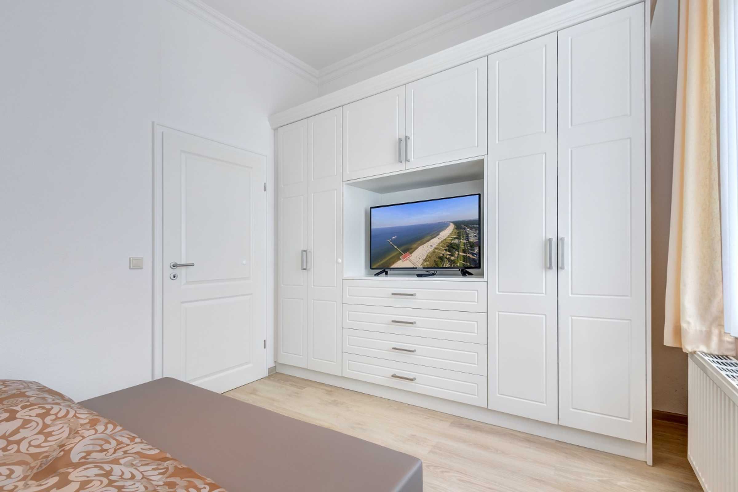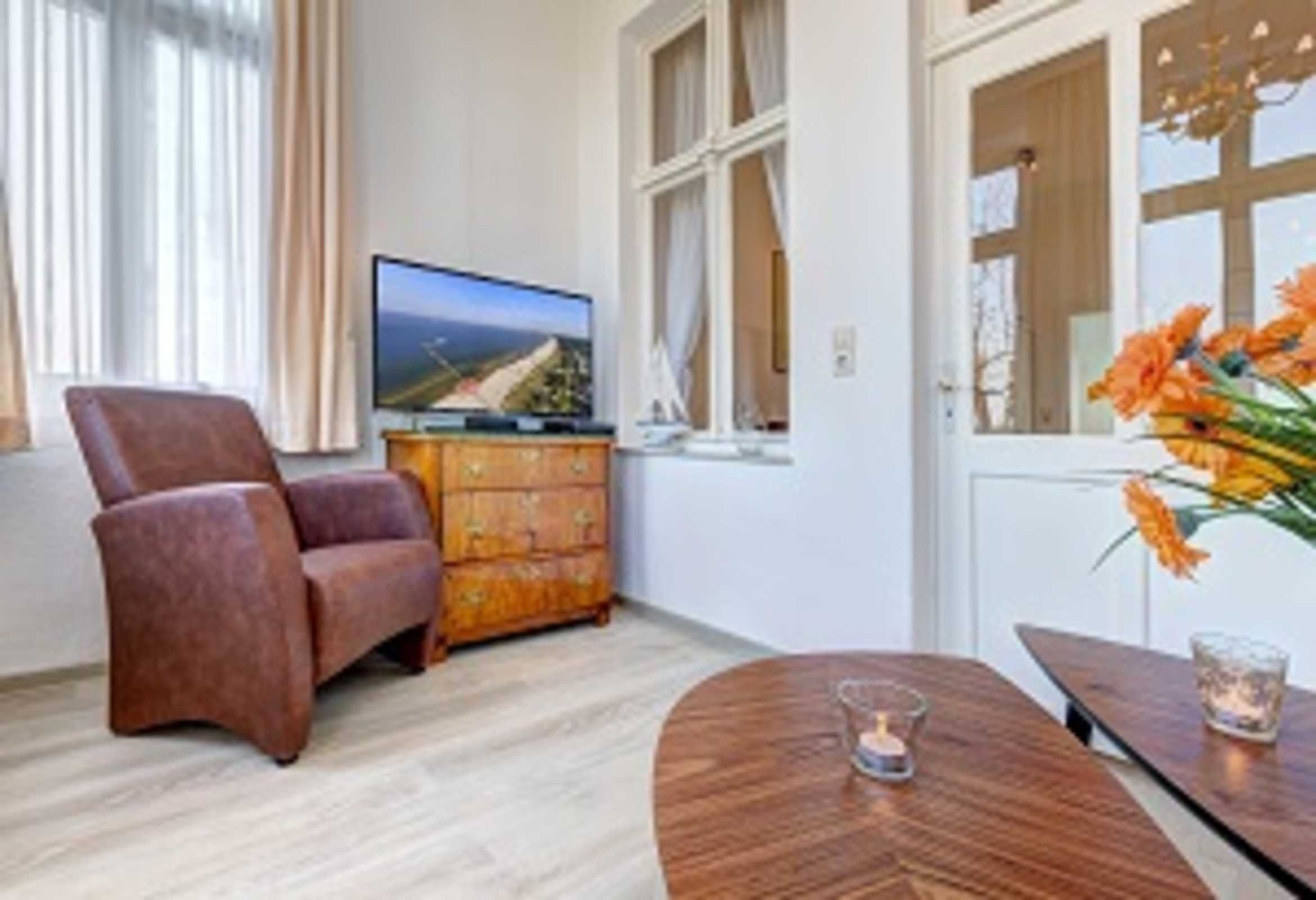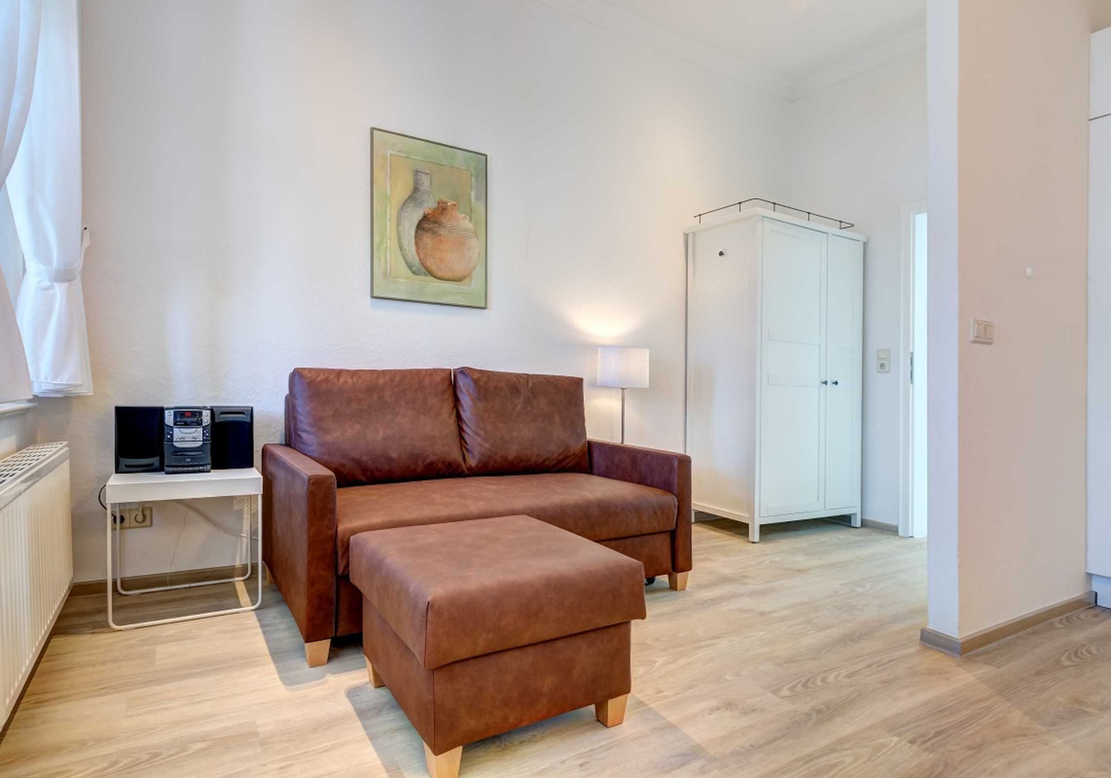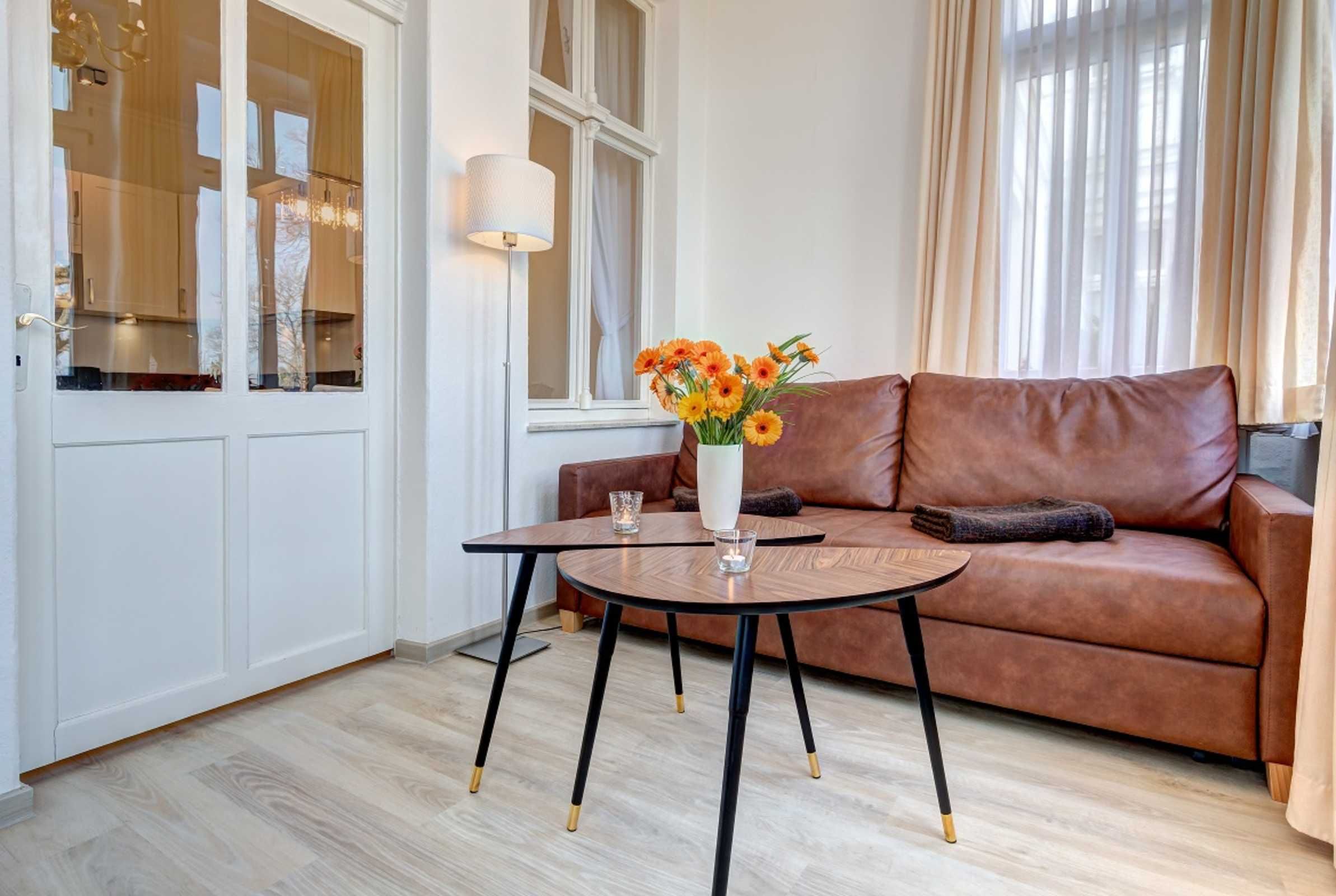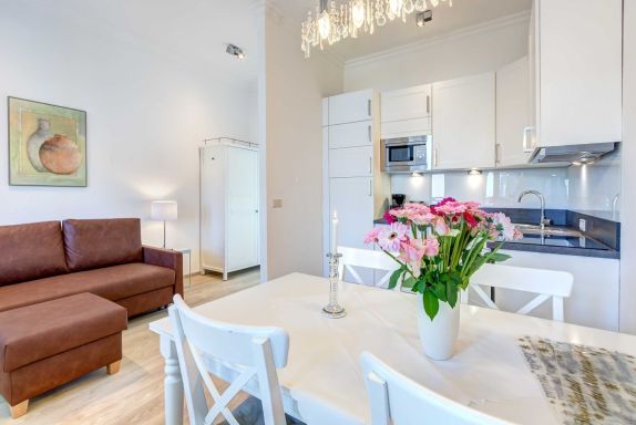 Das komfortable 3-Zimmer-Appartement EG 3 befindet sich im Erdgeschoss der Villa Germania nur 40 Meter vom Strand entfernt und hat einen separaten Eingang. Es verfügt über ein separates Schlafzimmer mit einem großen Doppelbett, einem Kombiraum mit Doppelbett, Essbereich sowie einer integrierten Küchenzeile, die mit Kaffeemaschine, Wasserkocher, Toaster, Mikrowelle, Backofen und Geschirrspüler voll ausgestattet ist. Der Wohnbereich befindet sich in der geschlossenen, verglasten Veranda, von welcher aus Sie einen direkten Zugang in den großen möblierten Garten und auf die Terrasse haben. Außerdem hat die Wohnung einen Südbalkon, auf welchem Sie bis Abends die Sonne genießen können. Das Bad ist mit einer Wanne und Dusche sowie WC ausgestattet.