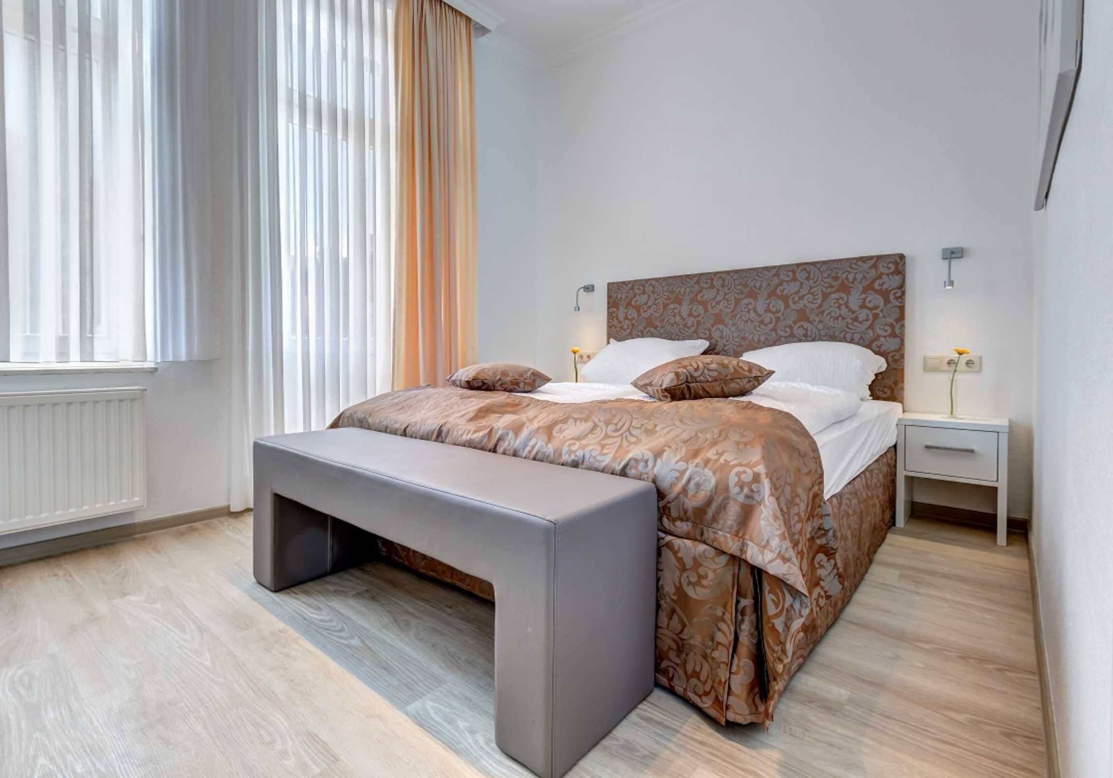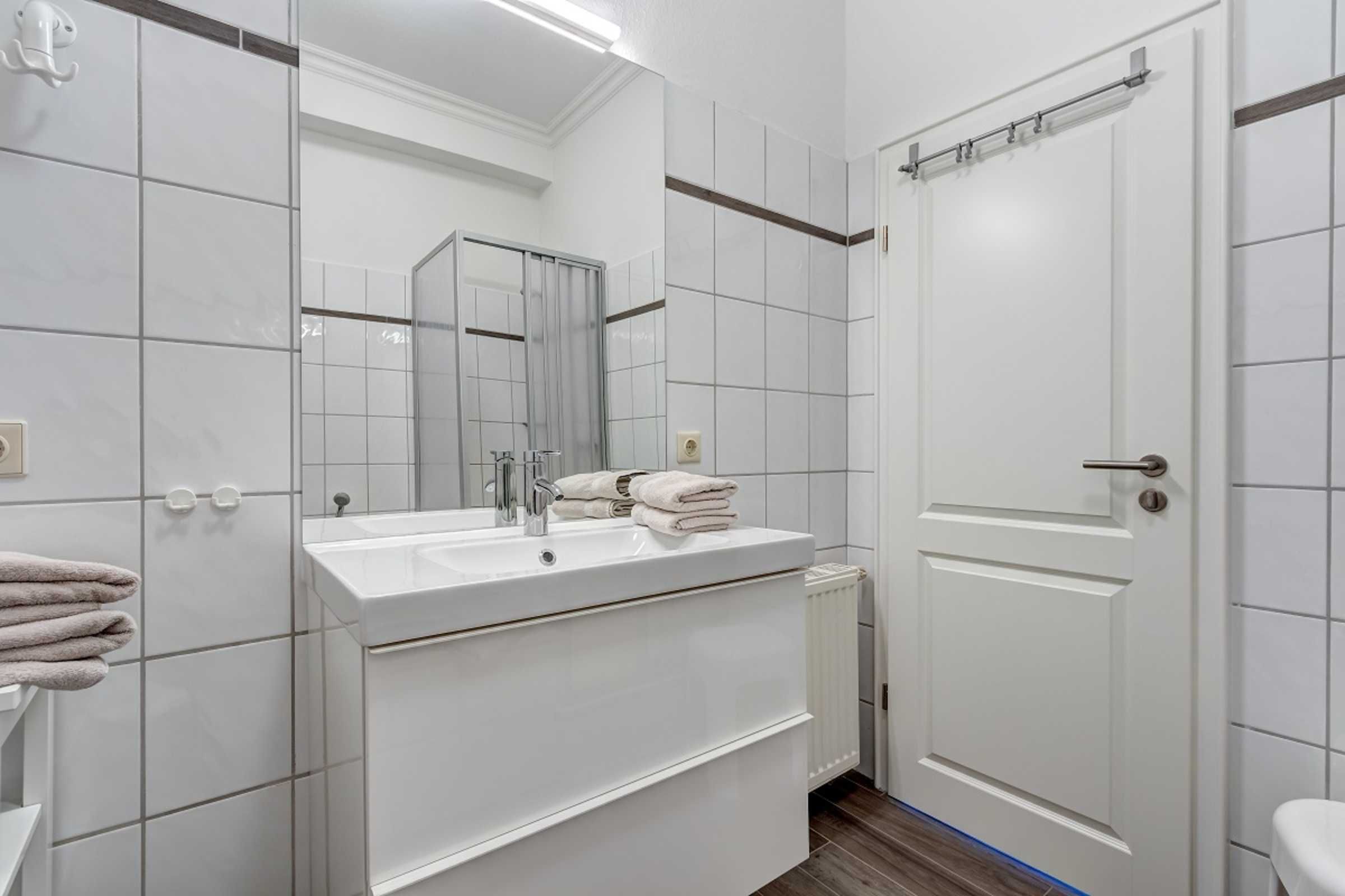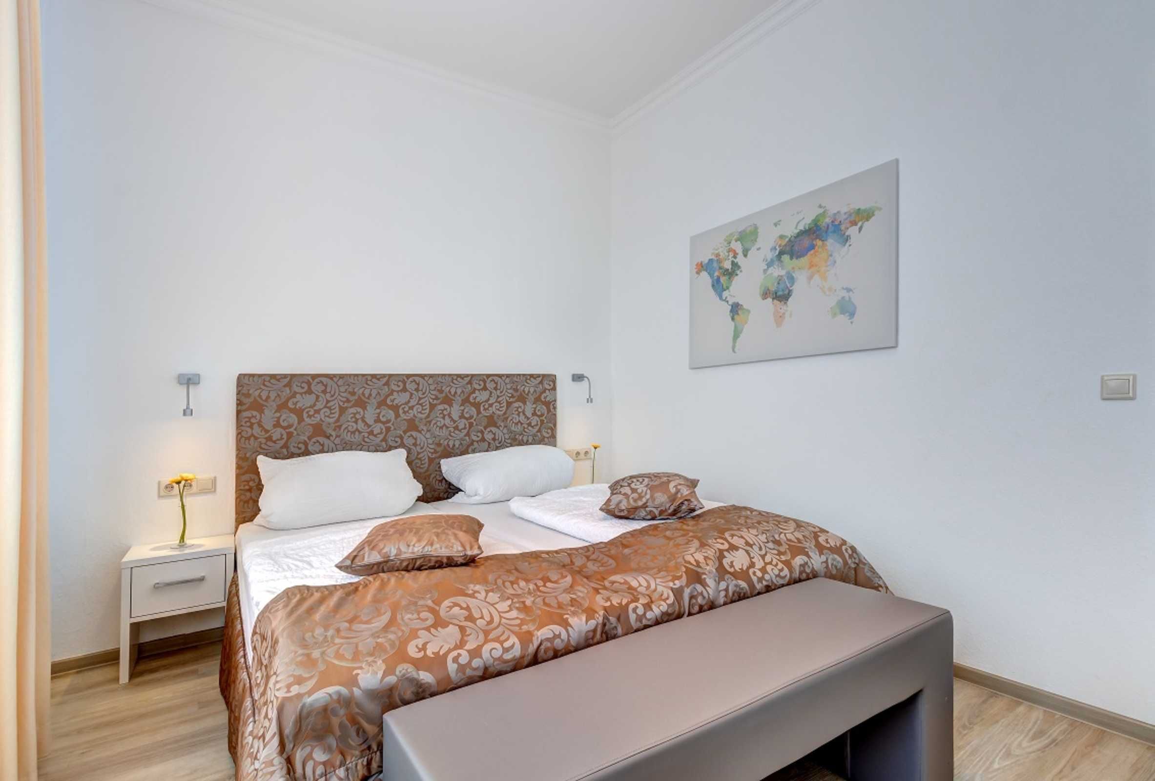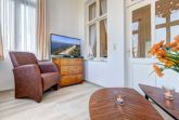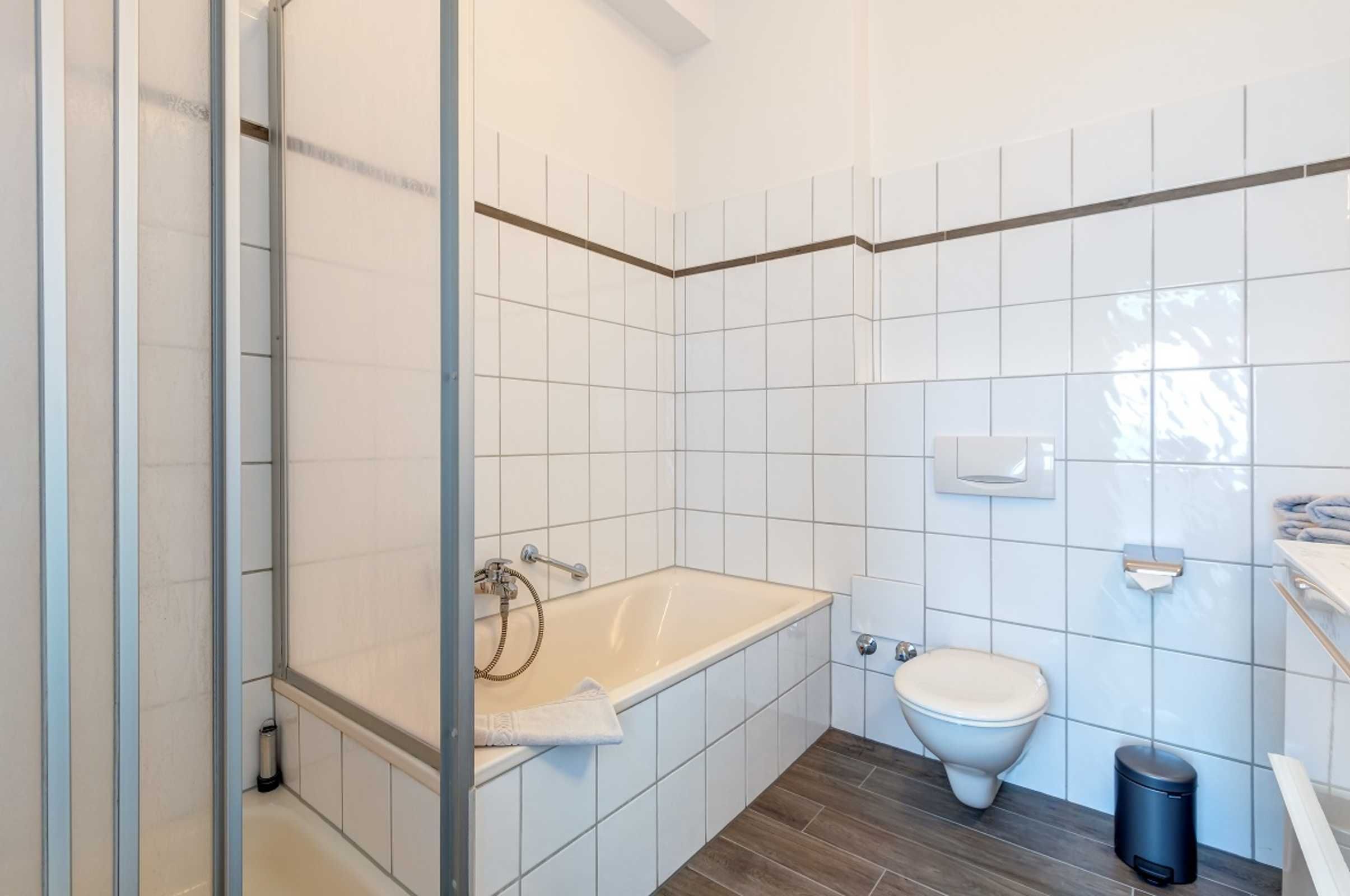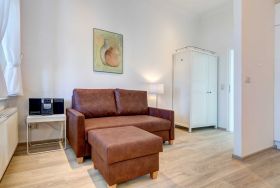 Das komfortable 3-Zimmer-Appartement EG 3 befindet sich im Erdgeschoss der Villa Germania nur 40 Meter vom Strand entfernt und hat einen separaten Eingang. Es verfügt über ein separates Schlafzimmer mit einem großen Doppelbett, einem Kombiraum mit Doppelbett, Essbereich sowie einer integrierten Küchenzeile, die mit Kaffeemaschine, Wasserkocher, Toaster, Mikrowelle, Backofen und Geschirrspüler voll ausgestattet ist. Der Wohnbereich befindet sich in der geschlossenen, verglasten Veranda, von welcher aus Sie einen direkten Zugang in den großen möblierten Garten und auf die Terrasse haben. Außerdem hat die Wohnung einen Südbalkon, auf welchem Sie bis Abends die Sonne genießen können. Das Bad ist mit einer Wanne und Dusche sowie WC ausgestattet.