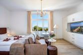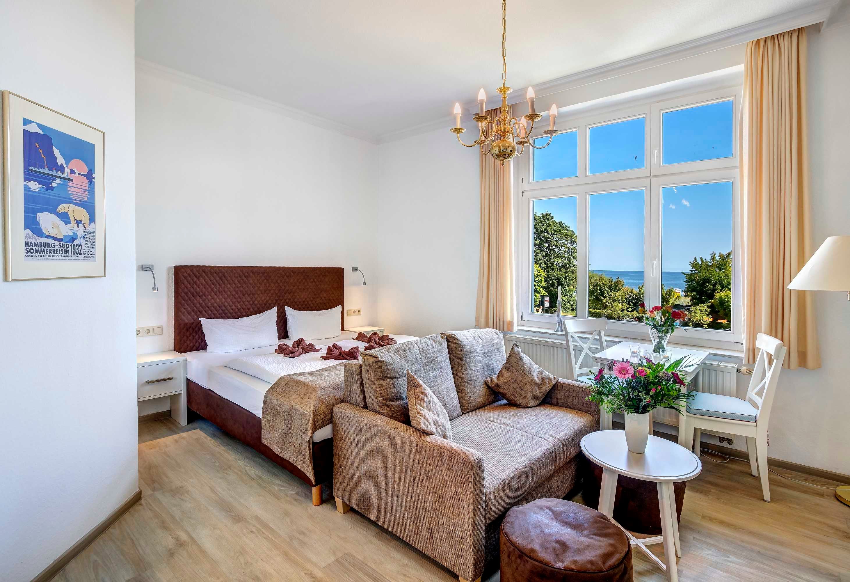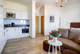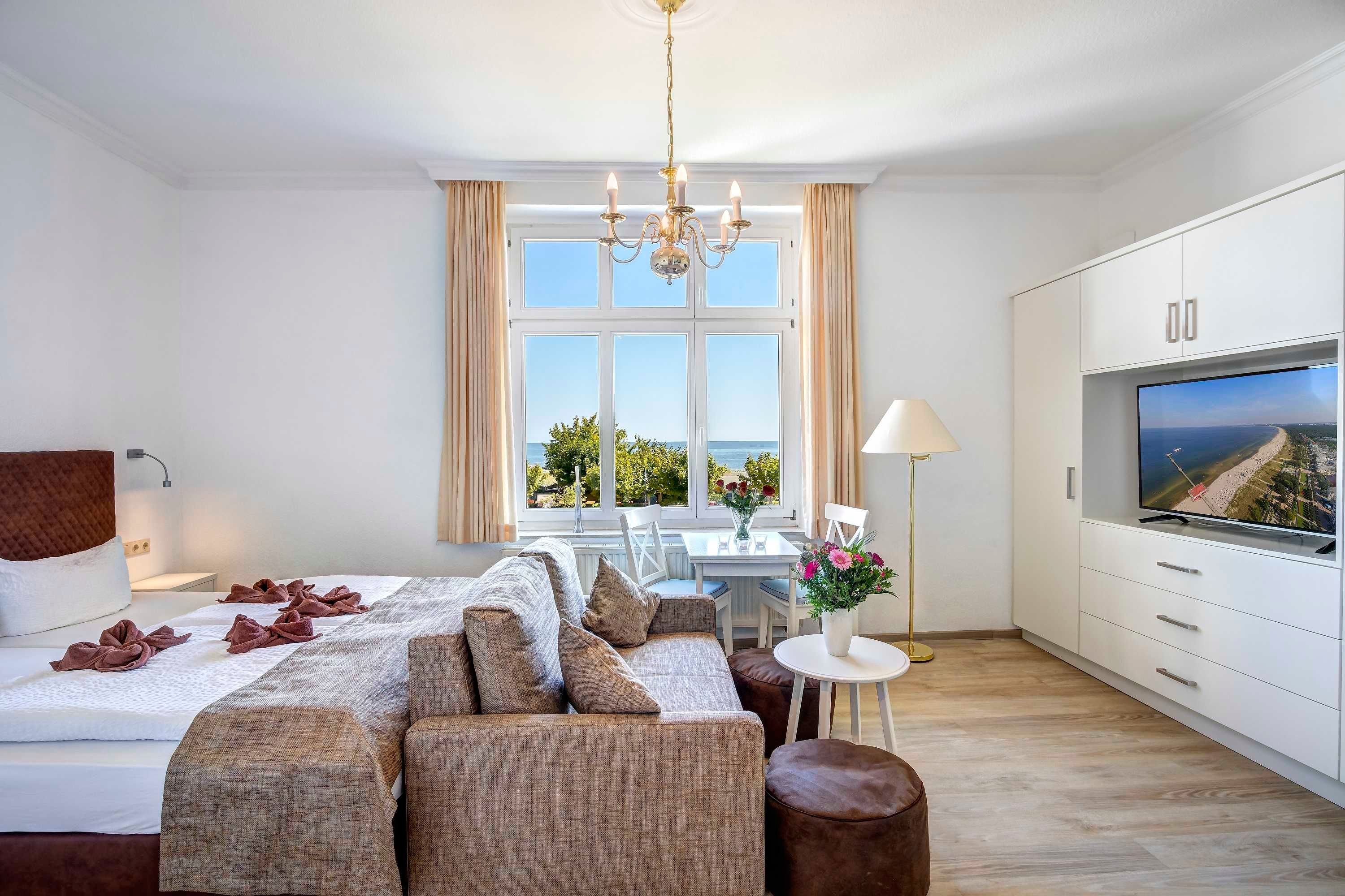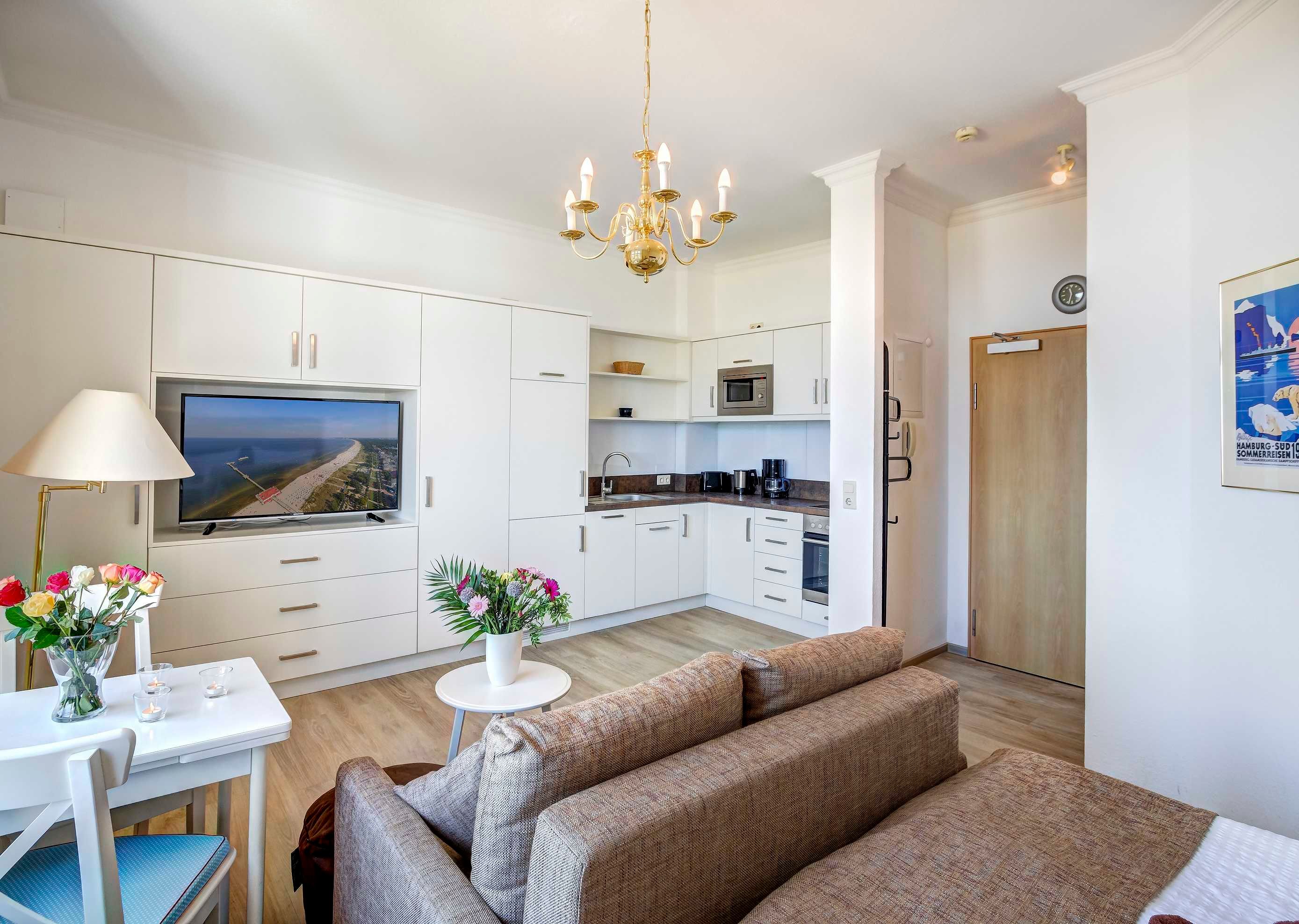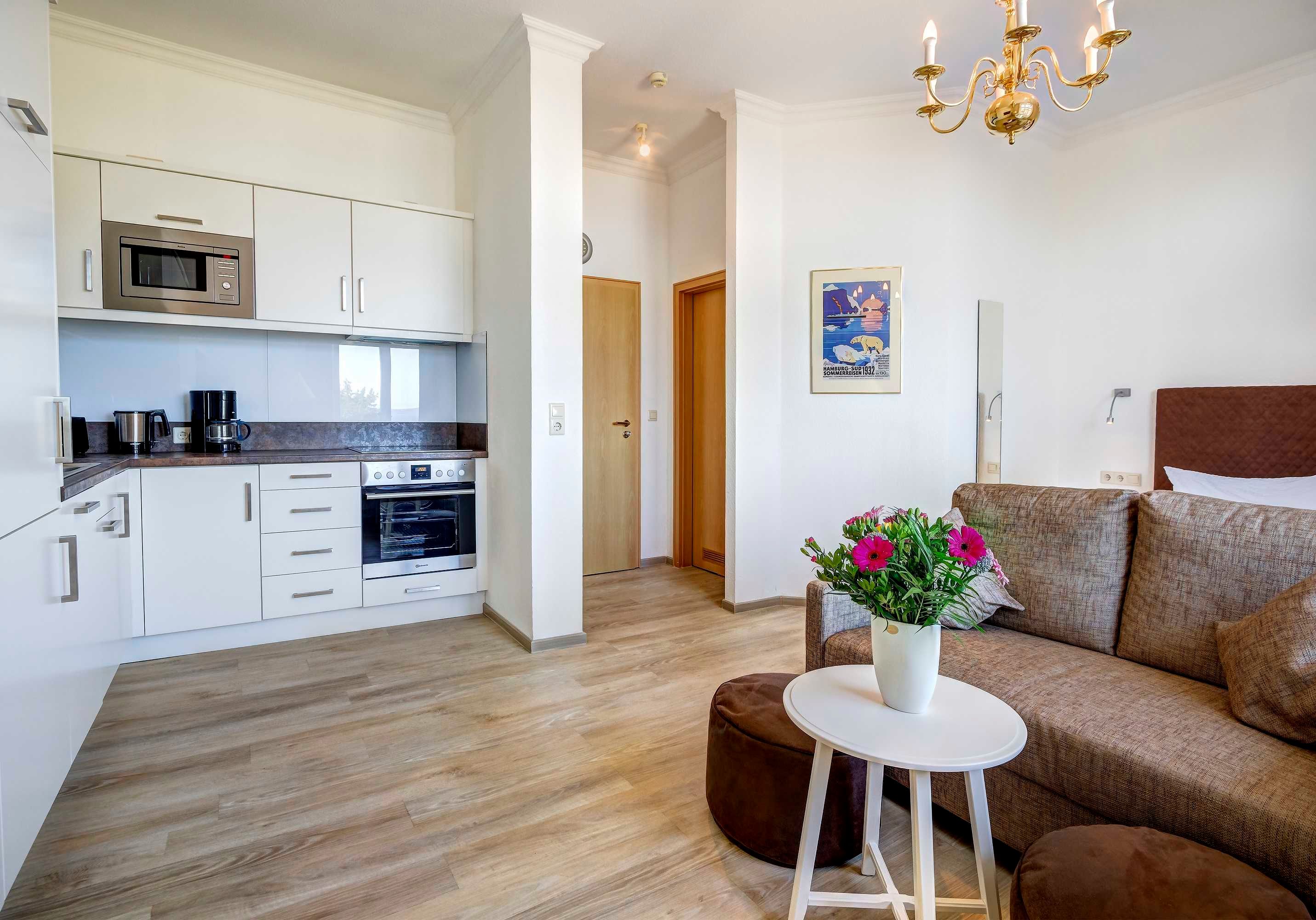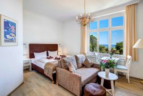 Das geräumige 1-Zimmer-Appartement OG 2 befindet sich im ersten Obergeschoss der Villa Germania nur 40 Meter vom Strand entfernt, direkt an der Strandpromenade. Es verfügt über einen Kombiraum mit einem Doppelbett, einem Essbereich und einer integrierten, voll ausgestatteten Küche mit Kaffeemaschine, Wasserkocher, Toaster, Mikrowelle sowie einer gemütlichen Sitzgruppe. Das Bad ist mit Dusche und WC ausgestattet. Aus dem Appartement haben Sie einen direkten, unverbauten Seeblick. Ein Pkw-Stellplatz steht Ihnen auf dem Grundstück kostenfrei zur Verfügung und Ihre Fahrräder können Sie ebenfalls auf dem Grundstück in einem separaten Abstellraum unterbringen. Alle Wohnungen in der Villa Germania haben passwortgeschütztem DSL-WLAN Internetzugang (gerätegebunden, Euro 1,50 pro Tag und Gerät). Eine Waschmaschine, einen Trockner und eine Sauna können Sie jeweils gegen Gebühr nutzen (Münzgeräte).
