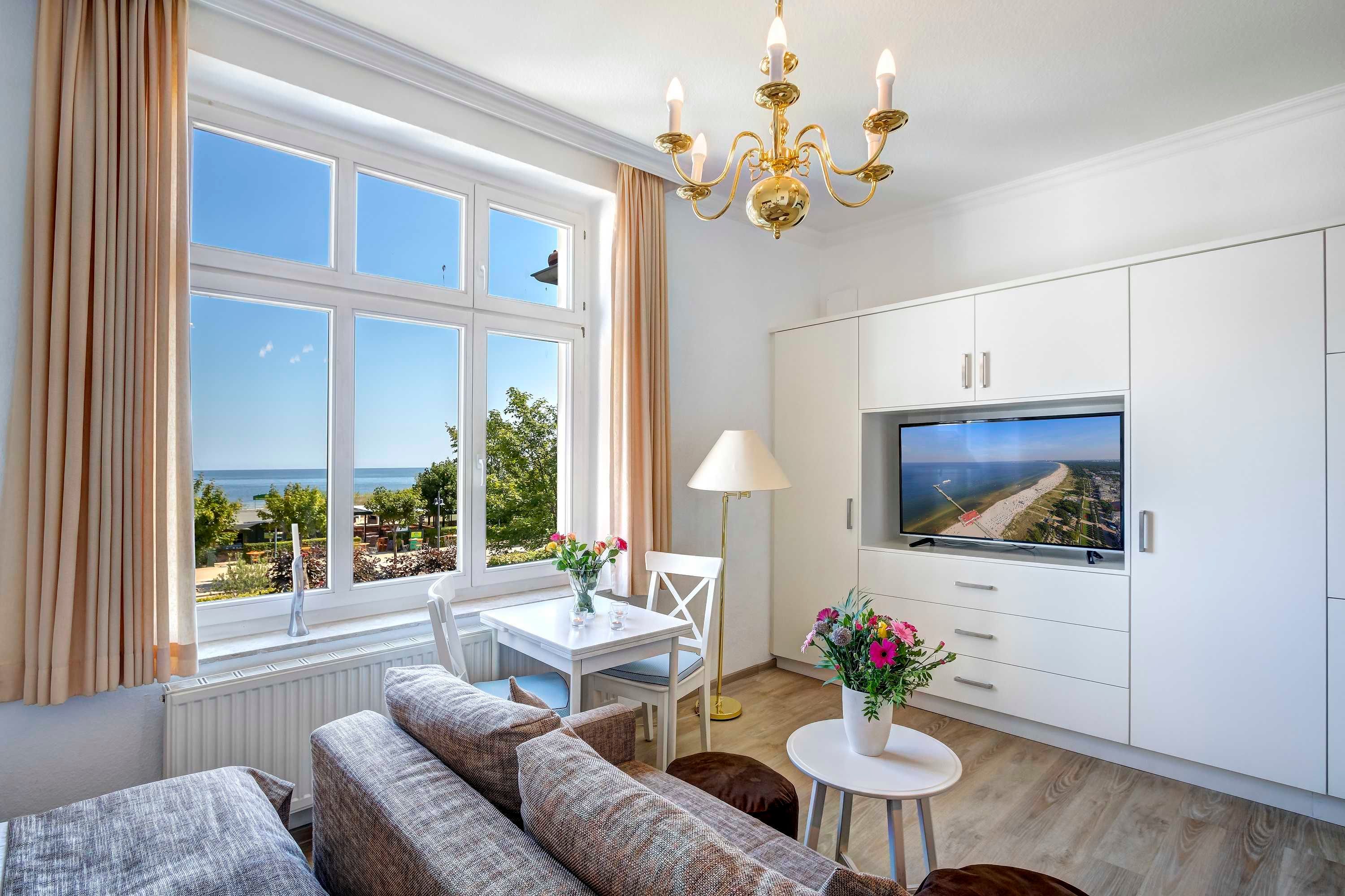 Direkt an der Strandpromenade mit direktem SEEBLICK! Schönes geräumiges 1 - Zimmer - Apartment im I. OG mit hübscher Möblierung und guter Ausstattung, Küchenzeile, Duschbad und Blick zur See. Die Wohnung verfügt über einen Pkw-Stellplatz. In der Garage können Fahrräder und ähnliches untergestellt werden. Im Haus gibt es eine Sauna. Von der Villa Germania aus können Sie das Ortszentrum und die bekannte Ahlbecker Seebrücke in ca. 3 Minuten zu Fuß erreichen. Zum Strand sind es 50 m. Von Mai bis September ist ein Strandkorb im Tagespreis enthalten im Jahr 2025, ab 2026 nicht mehr.